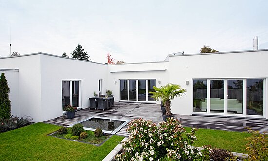 Das Flachdach ist der Klassiker im geradlinigen Bauhaus-Stil, der wieder hochaktuell für moderne Bungalows ist. Diese Dachform bringt außerdem bauliche Vorteile mit sich: Durch die fehlenden Dachschrägen wird der Wohnraum besonders effizient genutzt. Flachdächer bieten Platz für eine Terrasse oder eine nachhaltige Dachbegrünung. Und sie sind leichter zugänglich als Schrägdächer. Dadurch können zum Beispiel Dachrinnen einfacher gereinigt und Solarmodule leichter installiert bzw. repariert werden. Eine Besonderheit beim Flachdach: Damit das Regenwasser gut ablaufen kann, ist neben einem Dachablauf zusätzlich ein Notablauf erforderlich.