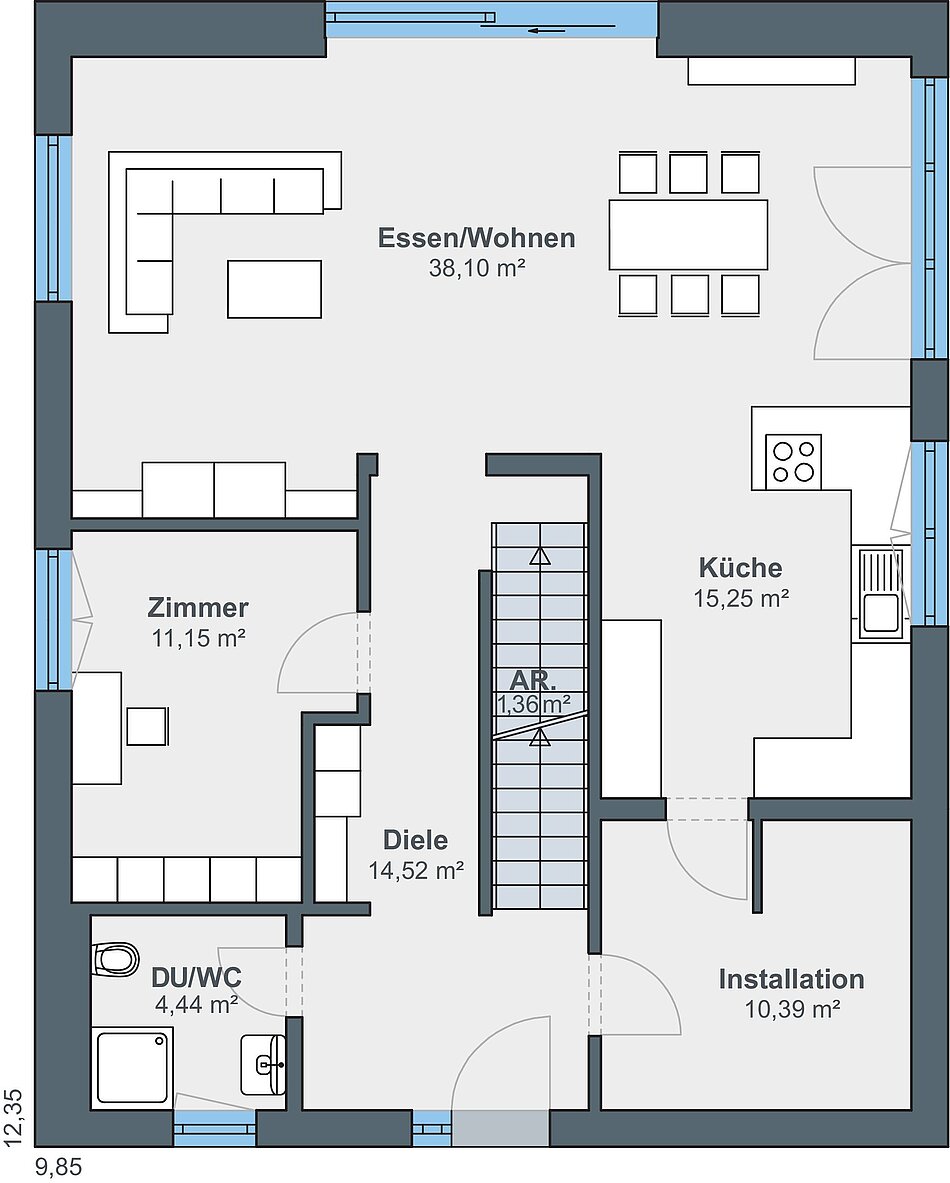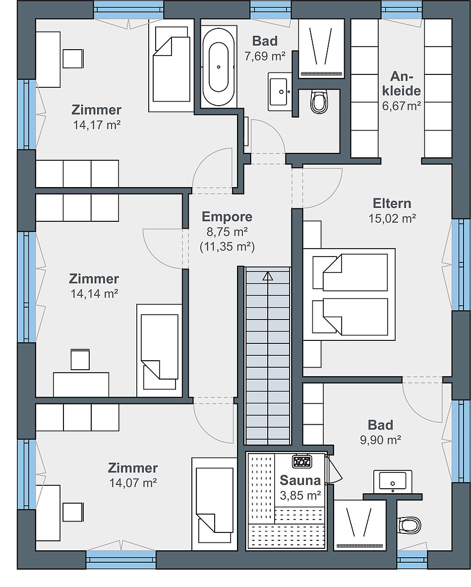 Dieses Einfamilienhaus bietet Platz für eine fünfköpfige Familie. Als Basis diente ein Haus aus der Baureihe generation5.5 mit etwa 180 Quadratmetern Wohnfläche. Die schlichte, weiß verputzte Fassade in Kombination mit den grauen Fensterrahmen sowie Dachziegeln verleiht dem Eigenheim einen zeitlosen Charakter.