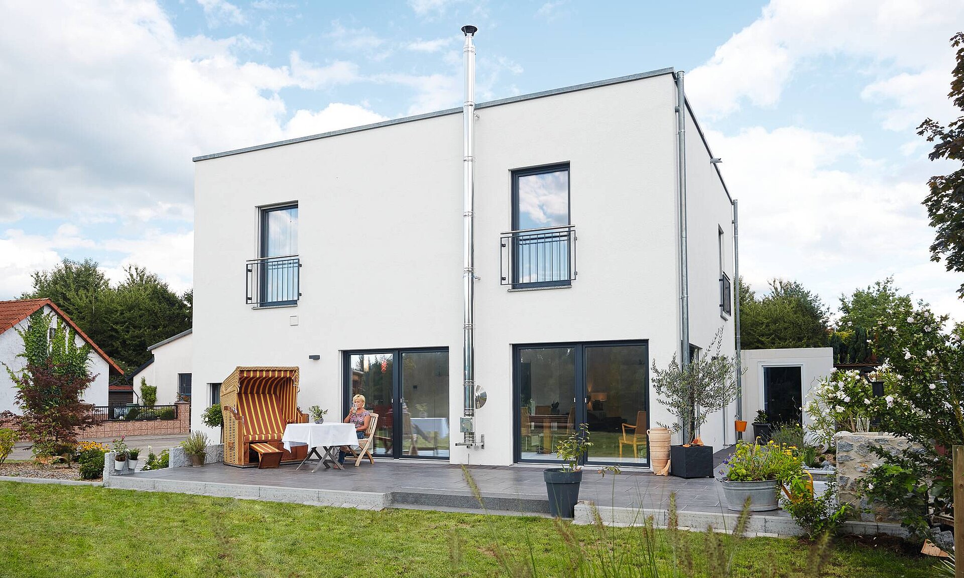 Geradlinig und modern ist der Entwurf dieses Hauses mit Flachdach. Die Innengestaltung greift die äußere Linienführung auf – klar, puristisch und hell sind die Räume, die immer wieder mit roten Akzenten und Elementen aus Naturholz belebt werden. Ob in der Sauna, dem großen Bad oder auf der Terrasse, dieses Heim bietet unzählige Wohlfühlorte.