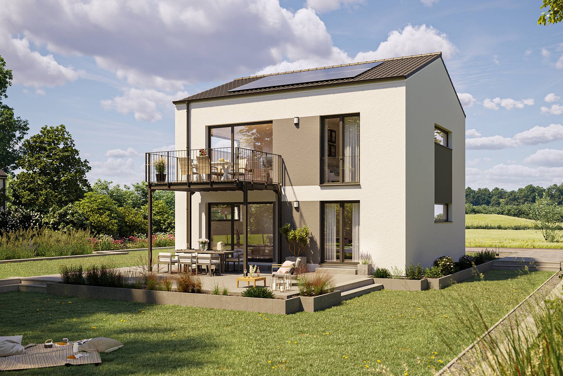 Der Hausentwurf newLife von WeberHaus präsentiert sich als eine innovative Lösung mit zwei separaten Wohneinheiten auf zwei Vollgeschossen. Jede Wohnung bietet etwa 65 Quadratmeter Wohnfläche. Über eine Stahl-Außentreppe gelangt man zur oberen Wohnung. Bodentiefe Fenster und Fenstertüren im Erd- und Obergeschoss schaffen eine offene, luftige Atmosphäre und lassen viel Licht herein. Das Haus präsentiert sich mit einem Satteldach ohne Dachüberstand. Das Dach ist mit 16 Photovoltaik-Modulen ausgestattet, um nachhaltige Energie zu erzeugen und den ökologischen Fußabdruck zu minimieren.