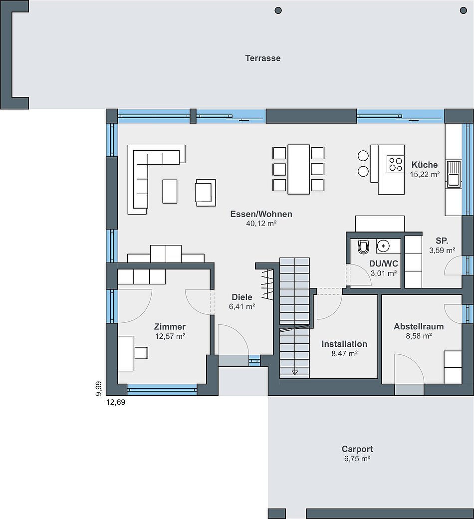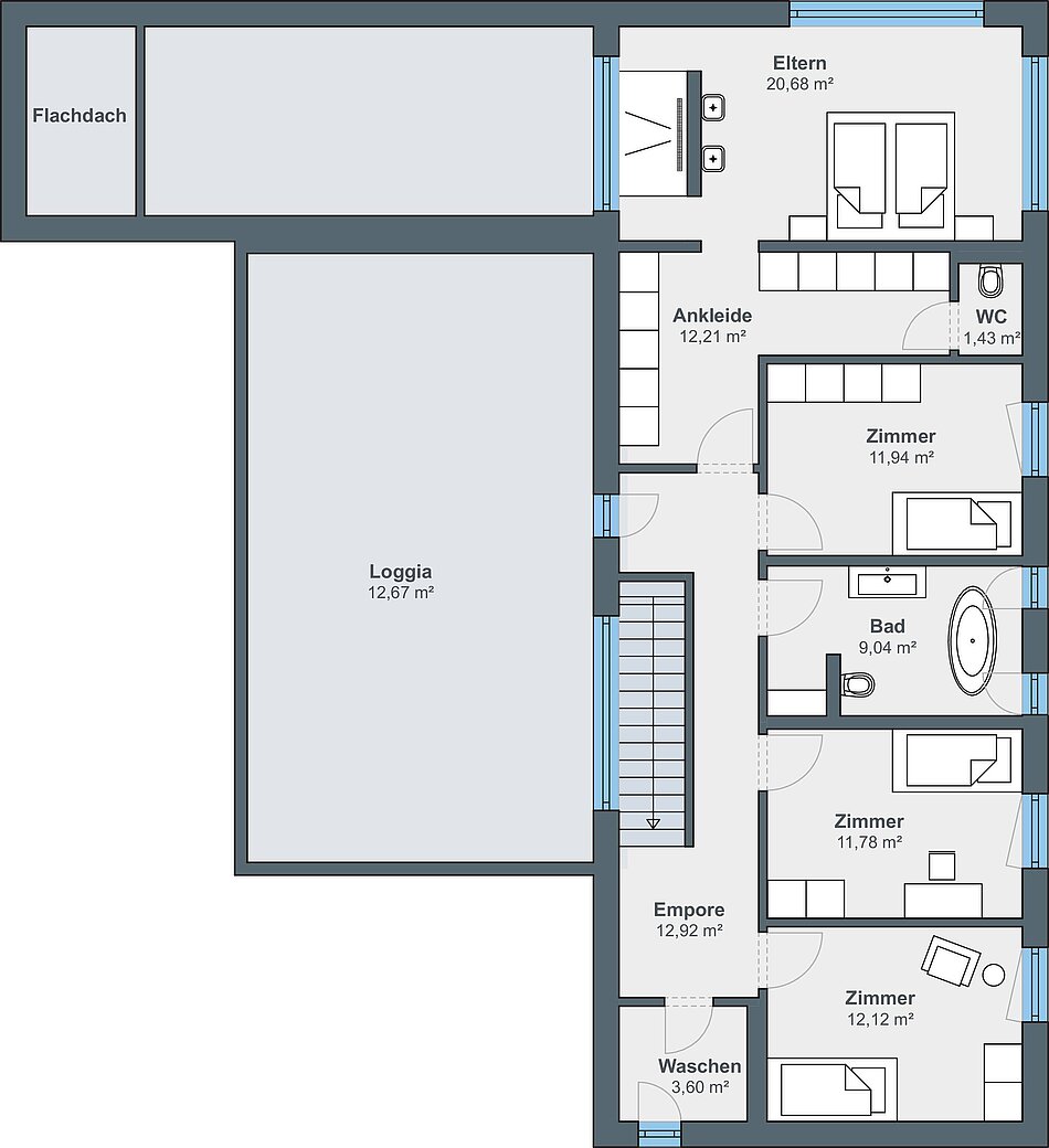 Ein schmaler Riegel thront über dem fast quadratischen Erdgeschoss und ragt auf beiden Seiten über den Baukörper hinaus. Die entstandenen Unterstände dienen als Carport und überdachte Terrasse. Über zwei Schiebetüren gelangt man nach draußen. Verlängert wird der Außenbereich durch eine Pergola mit Lamellendach. Dank einem Balkon kann man die Sonne auch im Obergeschoss genießen. Während das Erdgeschoss in Weiß gehalten ist, hat man sich bei der ersten Etage für einen Grauton entschieden. Das moderne Einfamilienhaus ist ein frei geplantes Architektenhaus und verfügt über eine Wohnfläche von 200 Quadratmeter. Auf dem Flachdach befindet sich eine Photovoltaik-Anlage mit 16 Modulen.