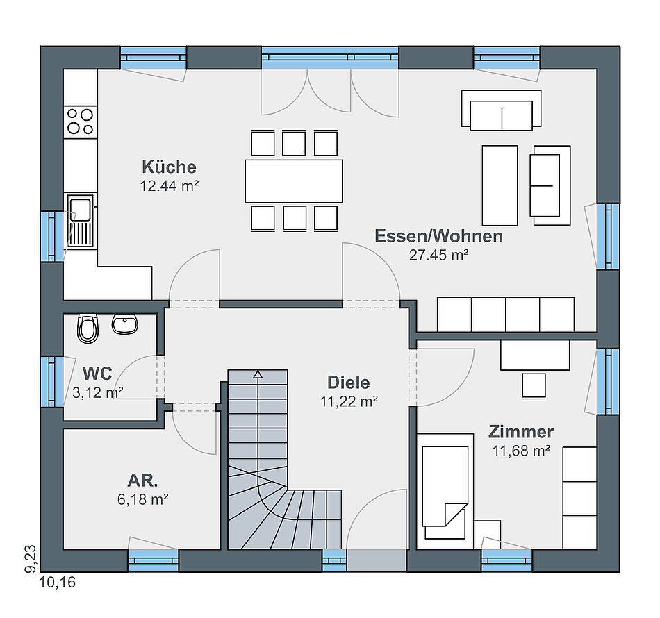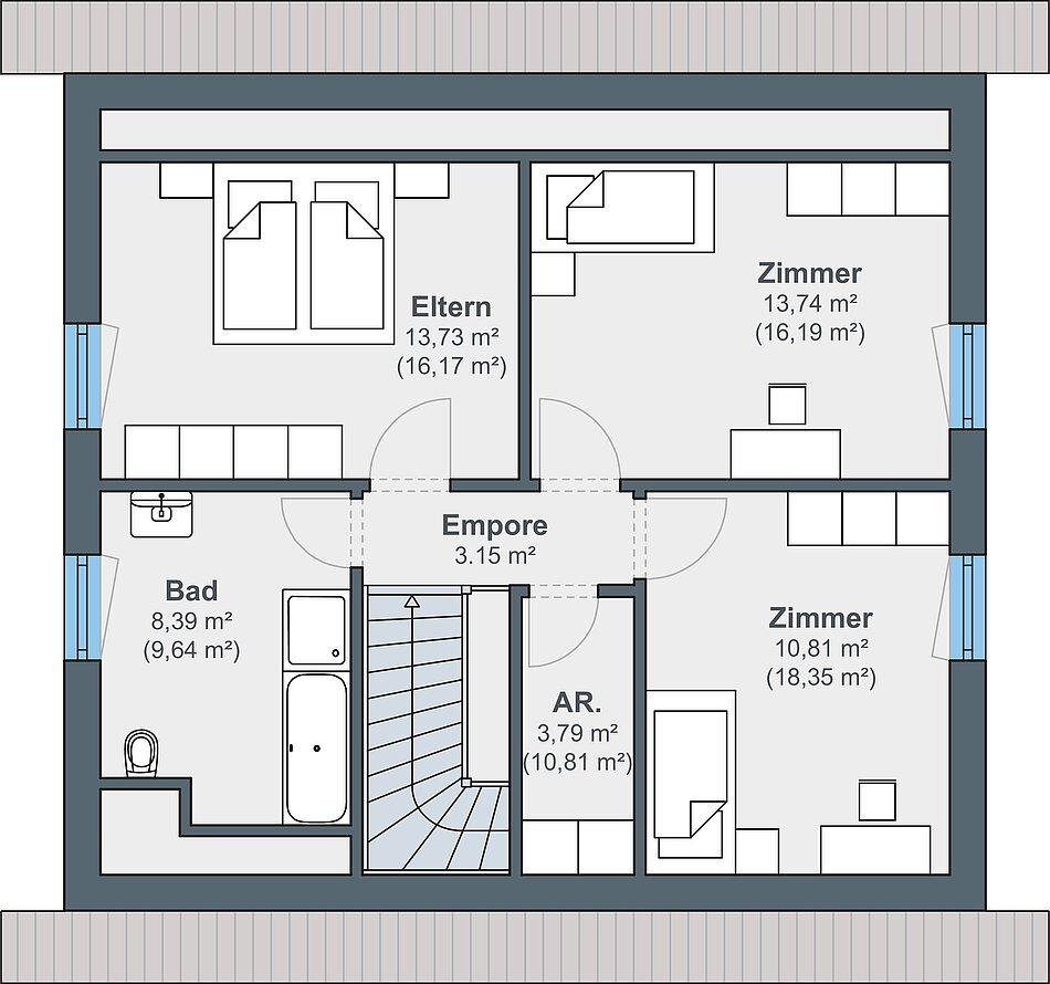 Einzigartig wird dieses WeberHaus durch die vielen Möglichkeiten der Fassadengestaltung. Durch die naturfarben belassene Holzverschalung gewinnt das Haus sofort an Wertigkeit und vermittelt auch nach außen in Akzenten die Wärme des natürlichen Baustoffes Holz. Wählen Sie zum Beispiel nur die Verschalung des Eingangsbereiches, um Ihre Gäste besonders stilvoll willkommen zu heißen. Mit der Ausführung attraktivem Oxidrot hingegen, kombiniert mit weißer Putzfassade, wird das Haus garantiert zum Hingucker. Es bleibt also Ihnen überlassen, was das Haus ausstahlen soll. Aber nicht nur Außengestaltung und Architektur mit zwei überdachten Terrassen und einem mittig platzierten Wintergarten, der optional erhältlich ist, überzeugen. Auch beim Betreten des Hauses kommt man ins Staunen, denn das Haus entpuppt sich als wahres Raumwunder.