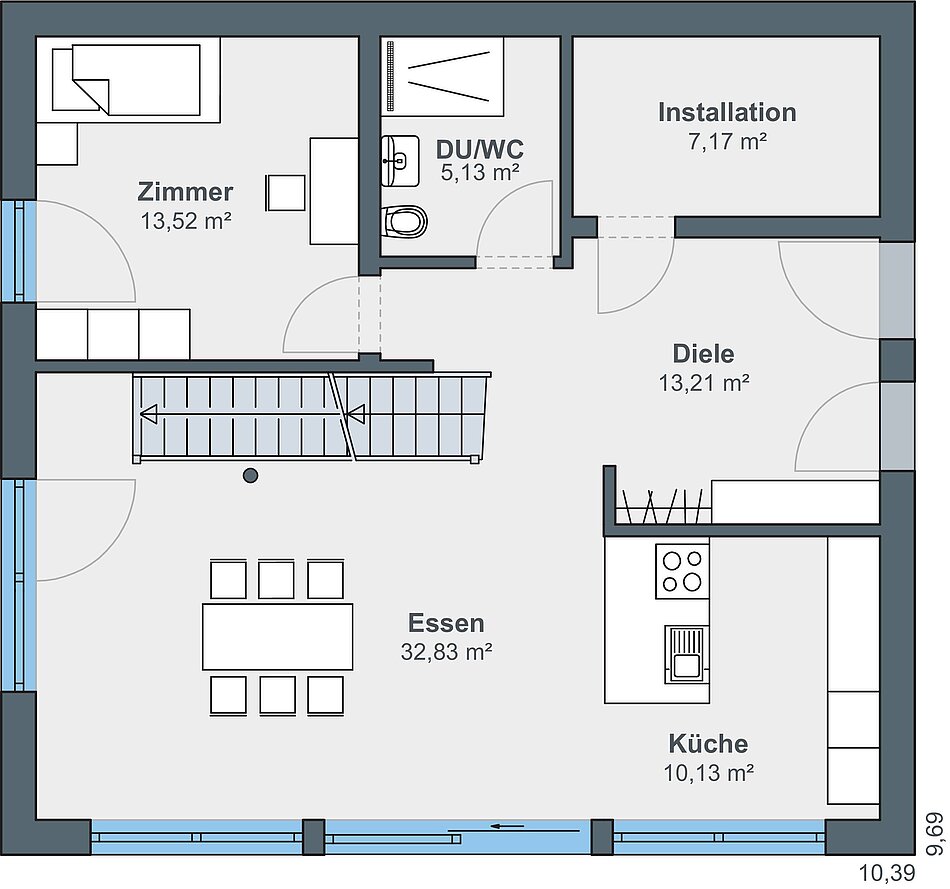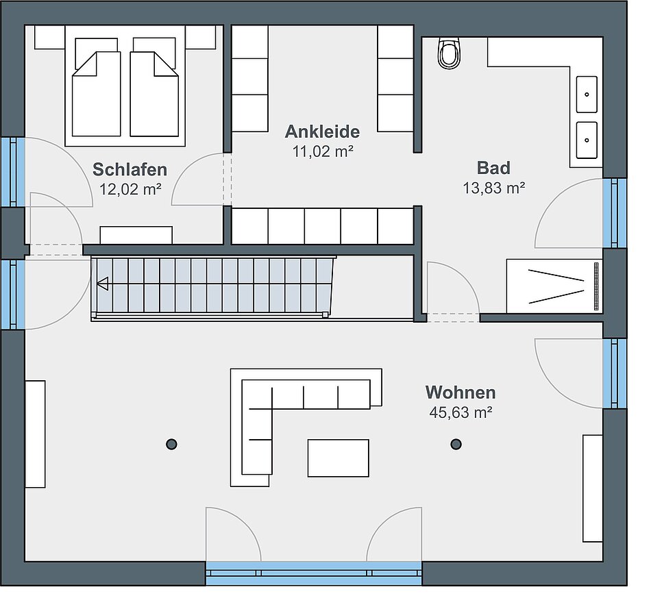 Beinahe quadratisch ist dieses Eigenheim, das auf der Baureihe Balance basiert. Das anderthalb-geschossige Fertighaus verfügt über ein 42 Grad geneigtes Satteldach ohne Dachüberstand. Dank dem hohen Kniestock von 140 Zentimetern und einem dritten Giebel haben die Bewohner auch im Dachgeschoss viel Platz. Zur Straßenseite hin zeigt sich der Neubau introvertiert. Eine glatte, fensterlose Hauswand dominiert hier die Ansicht. Dafür geht es auf der Gartenseite mit den raumhohen Panoramafenstern auf beiden Ebenen umso offener zu. Die Garage mit Verbindungstür zum Haus fügt sich harmonisch in das Gesamtbild ein.