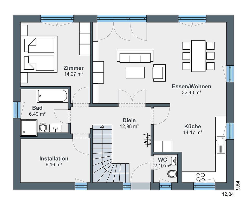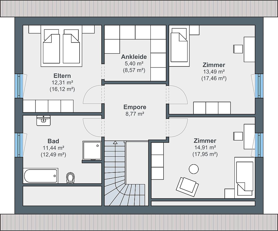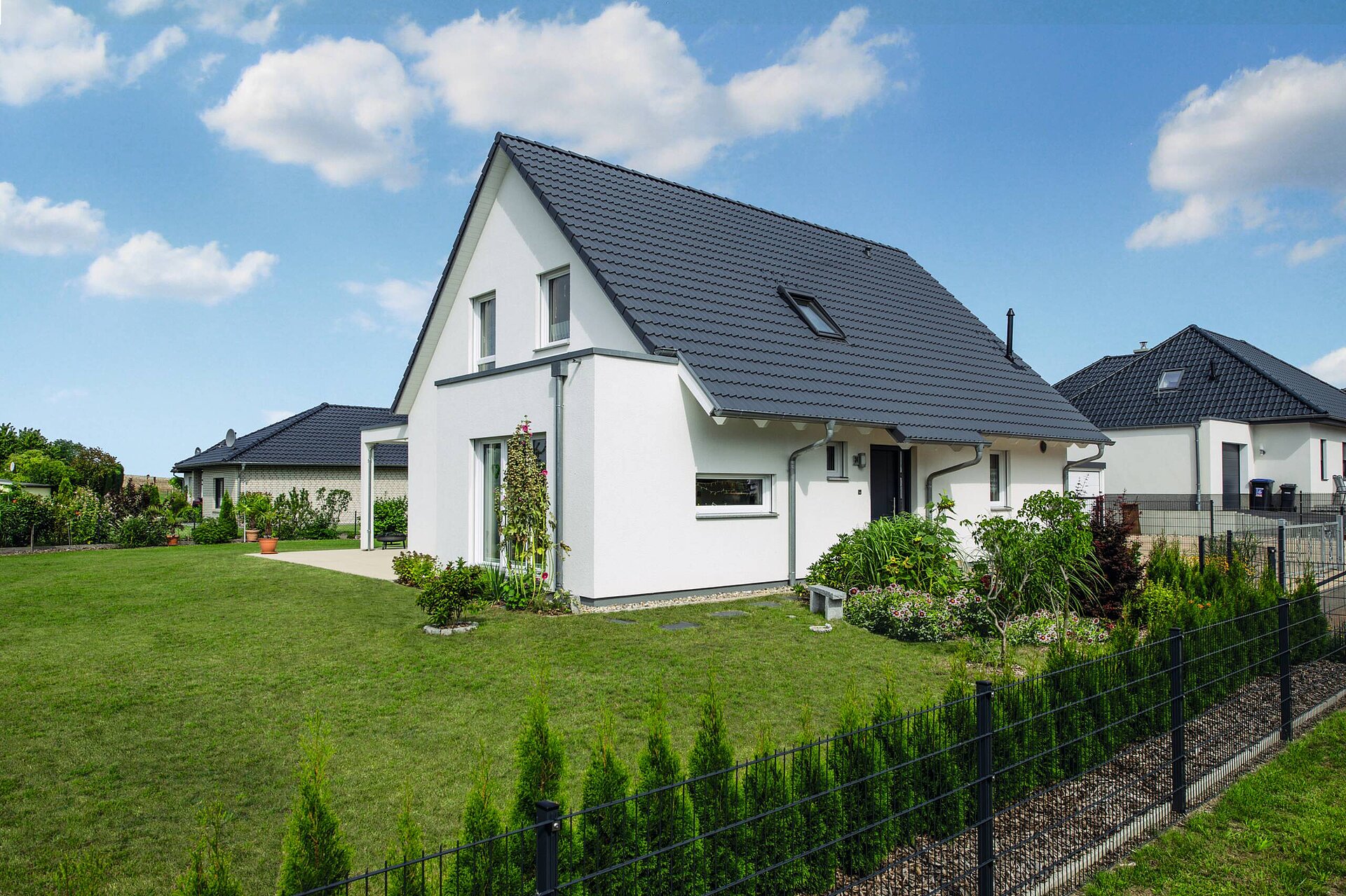 "Mit dem Auszug der Kinder beschloss das Ehepaar Herse, ihr Haus zu verkaufen und nach den neuen Bedürfnissen ein zweites Mal zu bauen. Entstanden ist ein klassisches Wohnhaus aus der Baureihe Balance. Das Satteldach ohne Kniestock ist mit schiefergrauen Betondachsteinen eingedeckt. In Kombination mit der weißen Putzfassade und den Fensterrahmen in Weiß kommt das anderthalb-geschossige Haus schlicht und zurückhaltend daher. Dank dem Rechteckerker auf der Südseite ist die Küche noch geräumiger. Vom Ess- und Wohnbereich gelangt man auf die Terrasse. Eine Pergola mit Dachverglasung schützt vor Regen."