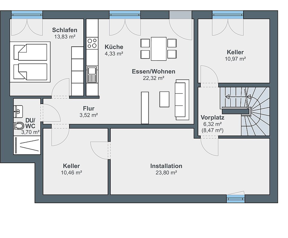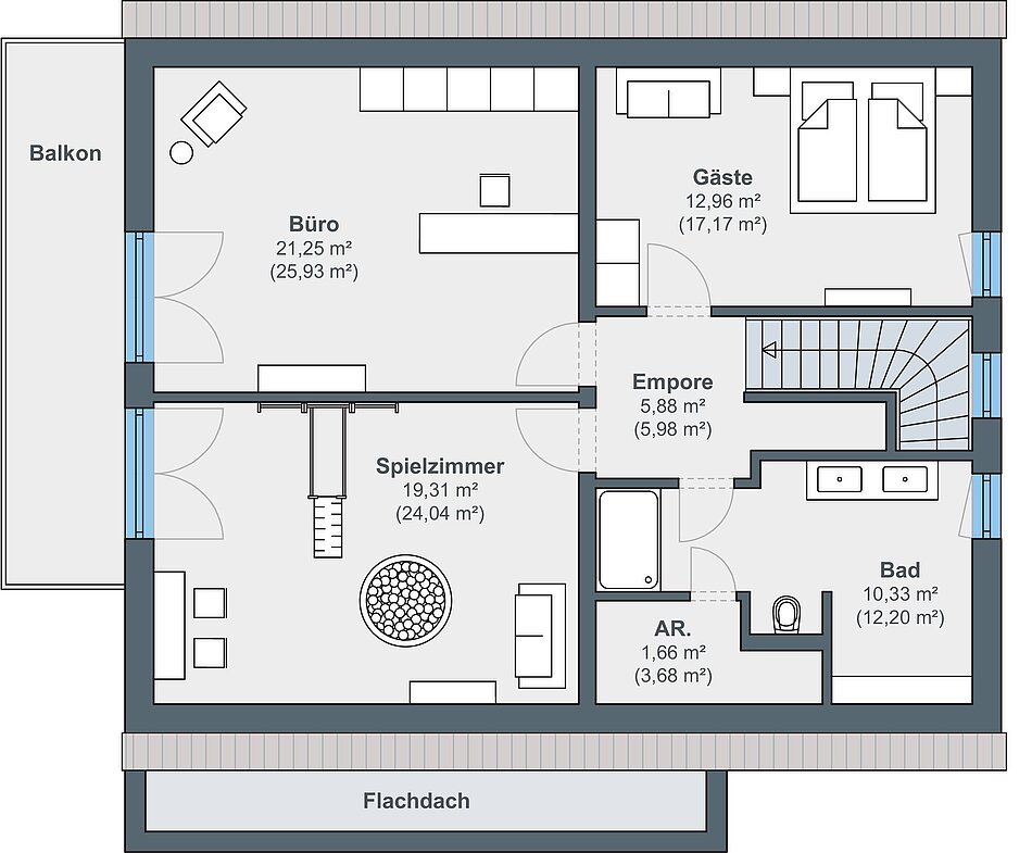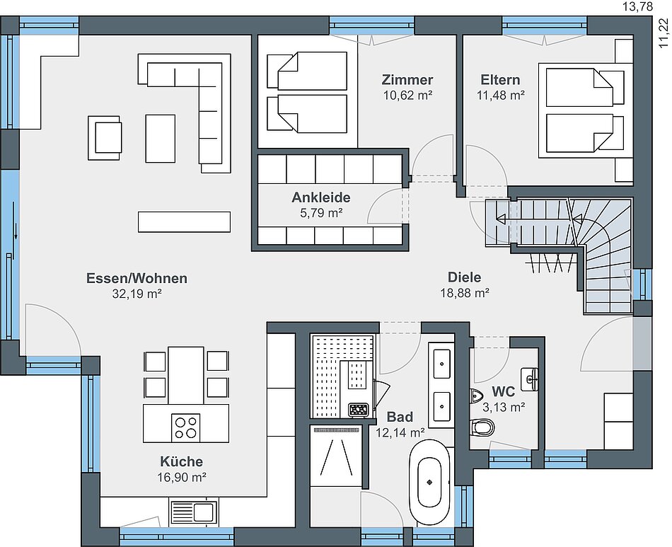 Modern, aber mit einer großen Portion Gemütlichkeit – so sollte das neue Domizil der vierköpfigen Baufamilie aussehen. Die Basis bildet ein geradliniger, weiß verputzter Baukörper mit schlichtem Satteldach ohne Dachüberstände. Blickfang sind die beiden Erker, die sich in eine warme Holzverschalung hüllen. Sie sorgen nicht nur für zusätzliche Platzgewinne im Erdgeschoss, sondern eröffnen dank großzügiger Verglasungen auch beeindruckende Panoramablicke über die Landschaft.