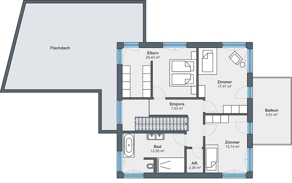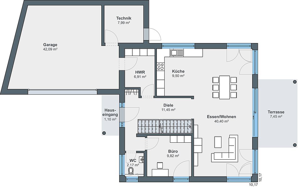 Die Stadtvilla mit rund 150 Quadratmeter Wohnfläche und einem Zeltdach basiert auf der Baureihe CityLife. An das zweigeschossige Einfamilienhaus grenzt eine Garage mit direktem Zugang zum Haus. Hier befindet sich auch ein Teil der innovativen Energietechnik, die bei diesem Kundenhaus als Pilotprojekt umgesetzt wurde: Das picea-System von HPS Home Power Solution. Dabei handelt es sich um ein Kompaktgerät zur ganzjährigen autarken Energieversorgung. Die Speicheranlage wandelt nicht sofort genutzten Strom in Wasserstoff um.
