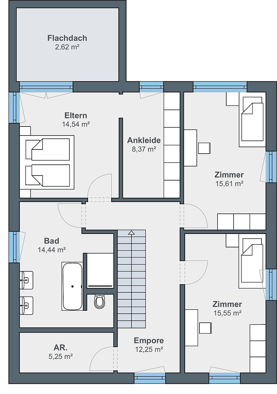 Dieses Einfamilienhaus basiert auf der Baureihe CityLife. Statt einem Walmdach krönt ein Flachdach die zwei Vollgeschosse. Dadurch wirkt das Haus geradlinig und modern. Die Garage schließt direkt an das Wohnhaus an, so dass man über eine Verbindungstür ins Hausinnere gelangt. Ein Rechteckerker mit bodentiefen Fensterelementen erweitert den offenen Essbereich zum Garten hin. Vom Wohnbereich gelangt man über eine Schiebetür auf die Terrasse. Große Fenster sorgen für reichlich Tageslicht im Obergeschoss.