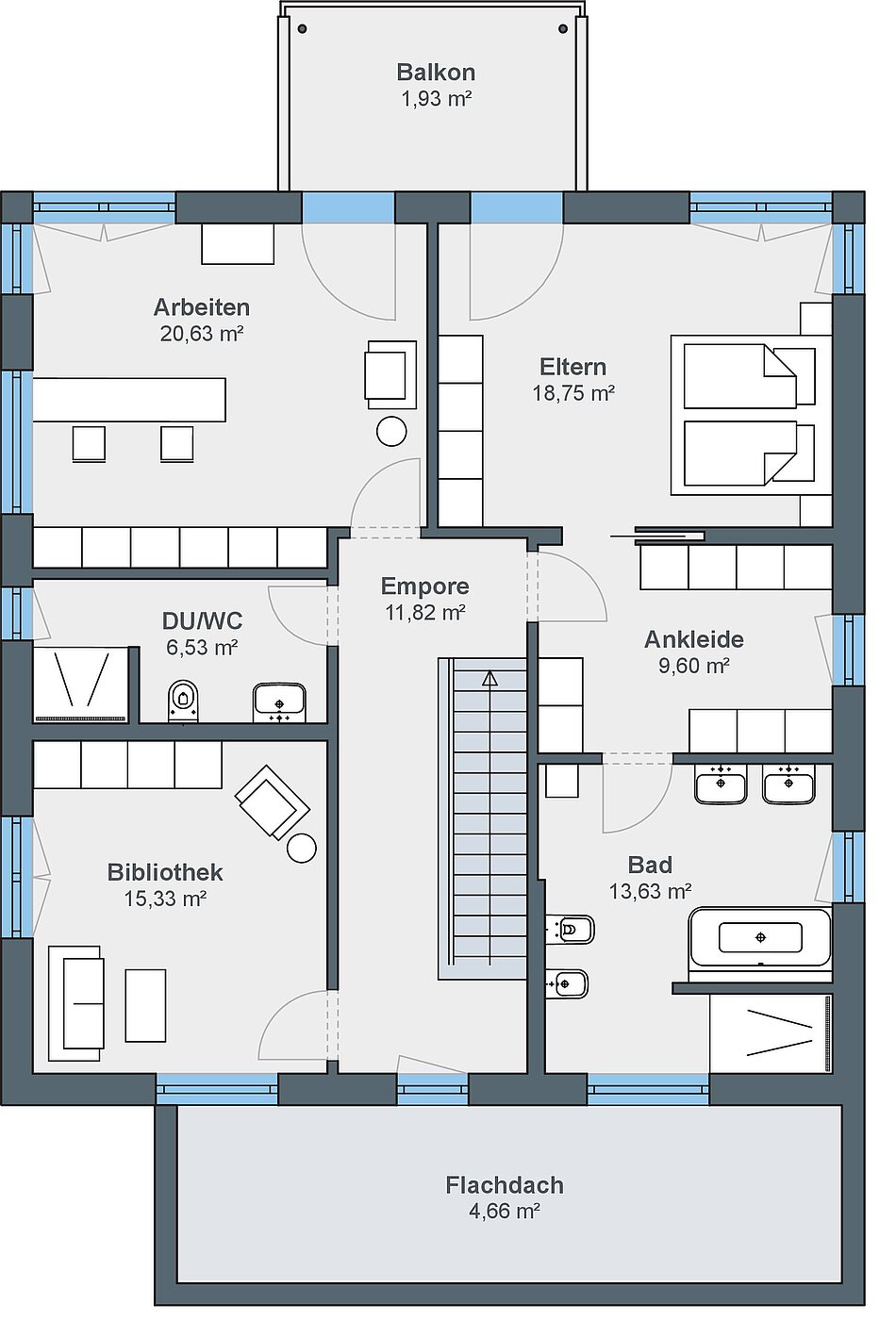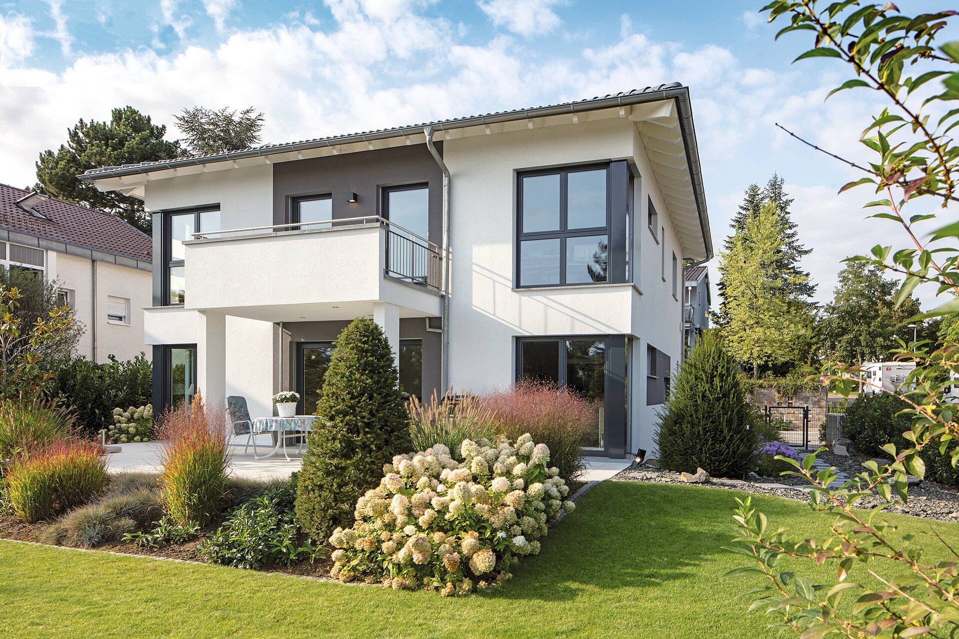 Das Ehepaar Paulsen hat ihr Traumhaus in der Baureihe CityLife entdeckt. „Wir freuen uns jeden Tag aufs Neue, in diesem komfortablen und schönen Haus wohnen zu können“, schwärmen die Hausbesitzer. Das Stadthaus mit seinen zwei Vollgeschossen und dem Walmdach bietet eine Wohnfläche von rund 220 Quadratmetern.Hinzu kommt ein Weberith-Keller. Farbige Akzente und Fensterrahmen in Grau lockern die ansonsten weiße Außenfassade auf. Passend dazu haben sich die Hausbesitzer für graue Dachziegeln entschieden.