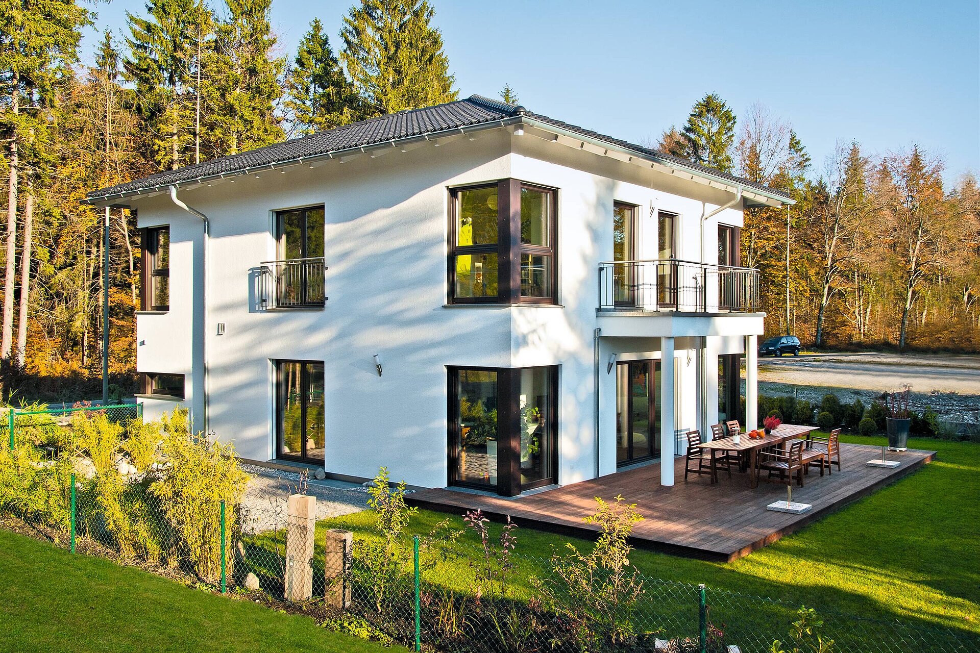 Klare Linien und Formen bestimmen die Architektur des zeitlos eleganten Stadthauses mit Walmdach. Ins Auge fallen vor allen Dingen die dunklen Fensterrahmen, die einen schönen Kontrast zu dem sonst optisch recht schlicht gehaltenen Haus bilden. Aber auch die zahlreichen Eckverglasungen sind ein echter Hingucker und ermöglichen zudem einen grandiosen Ausblick. Zwei Vollgeschosse bieten der Familie einen komfortablen Wohnraum von insgesamt 140 Quadratmetern.
