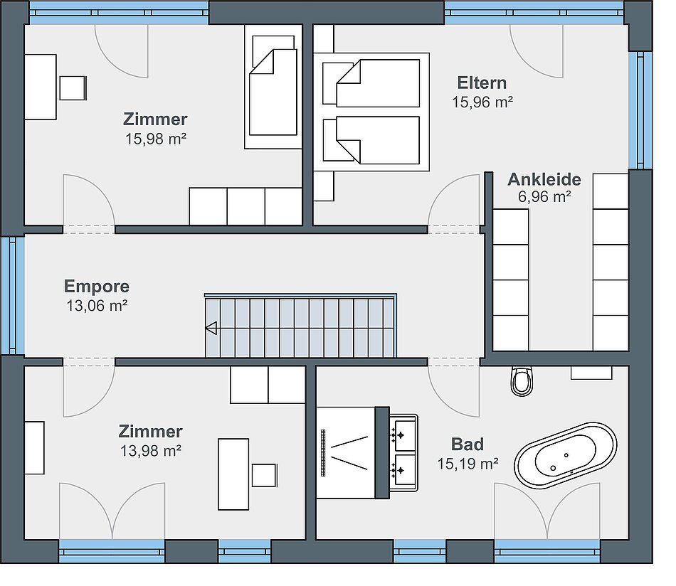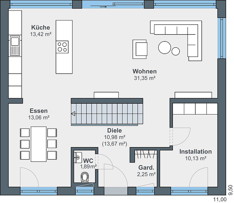 Wie eine weiße Skulptur erhebt sich diese elegante Bauhaus-Villa über das ländlich gelegene Grundstück. Die streng symmetrisch angeordneten Fensterflächen fügen sich harmonisch in das Gesamtbild ein. Auf der Straßenseite wechseln sich senkrechte Lichtbänder mit zweiflügeligen Fenstertüren ab. Die Gartenseite wurde mit raumhohen Verglasungen ausgestattet, die die Natur als eindrucksvolles Panorama in die Wohnräume bringen. Auf dem Dach des geradlinigen Neubaus befindet sich eine leistungsstarke Photovoltaikanlage mit 16 Modulen, die einen Batteriespeicher speist.