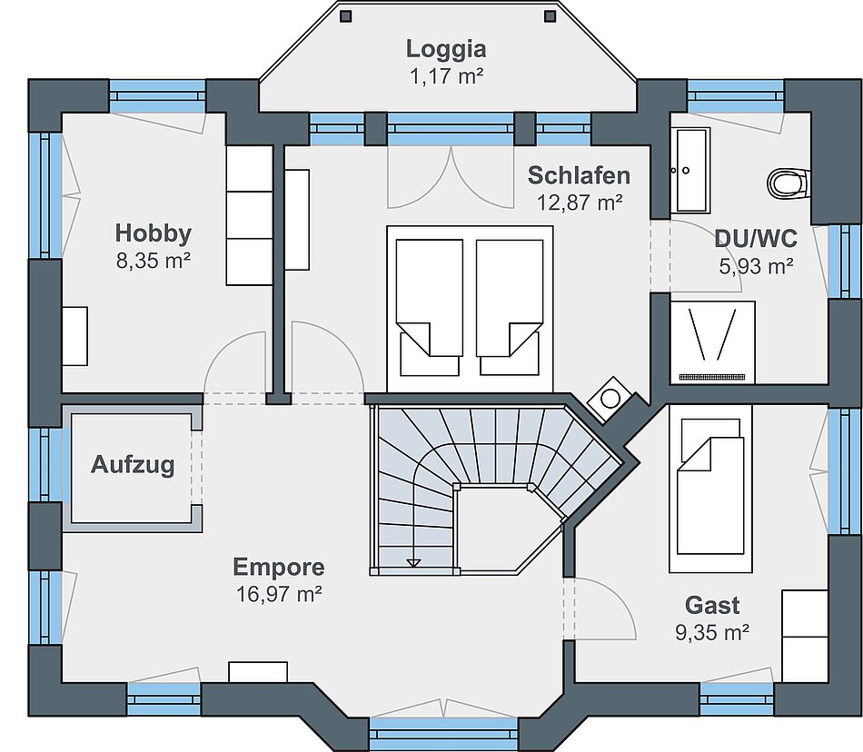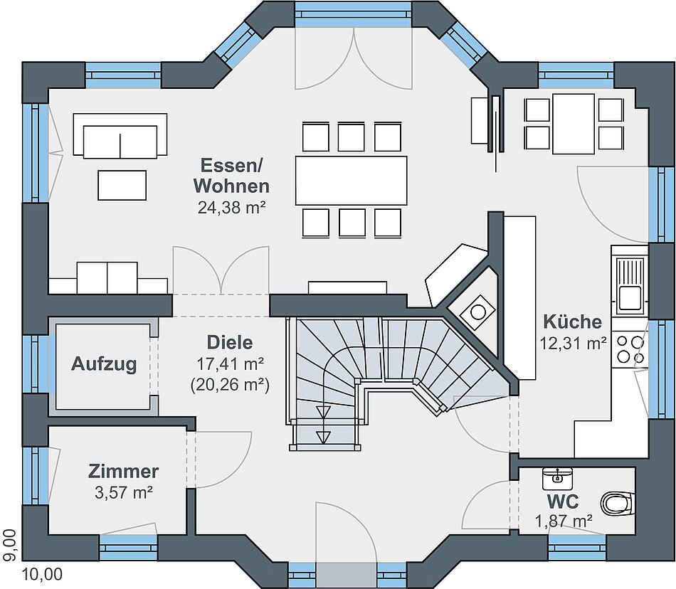 Kompakt, komfortabel und auf ganzer Linie effizient: Dieses frei geplante Einfamilienhaus bietet alles, was Paare, Singles und kleinere Familien zum Leben und Wohlfühlen brauchen. Die weißen Sprossenfenster verleihen dem Gebäude zusammen mit dem halbrunden Erker auf der Gartenseite einen herrschaftlichen Charakter. Ein schönes Detail sind die beiden Säulen, die die Balkonüberdachung tragen. Was man auf den ersten Blick nicht erwartet: Die Villa misst gerade einmal 10 x 9 m und passt sich damit perfekt in das schmale Grundstück ein. Auf dem eleganten Walmdach erstreckt sich eine leistungsstarke Photovoltaikanlage mit insgesamt 16 Modulen.