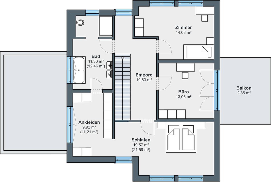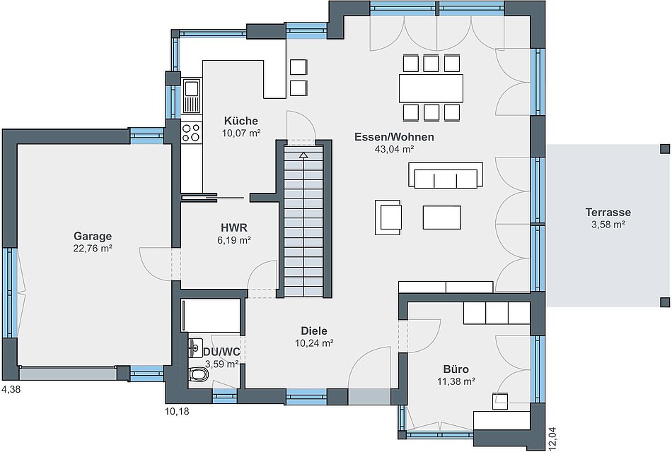 Auch im Haus harmonieren helle Flächen mit edlem, dunkelbraunem Holz an Türen, Treppe und Einrichtung. Große Fensterflächen lassen eine lichte, luftige Atmosphäre auf beiden Wohnebenen erahnen – überall Tageslicht pur! Dabei ist der Entwurf auch praktisch. Der repräsentativen Diele schließt sich ein Hauswirtschafts- und Vorratsraum an.