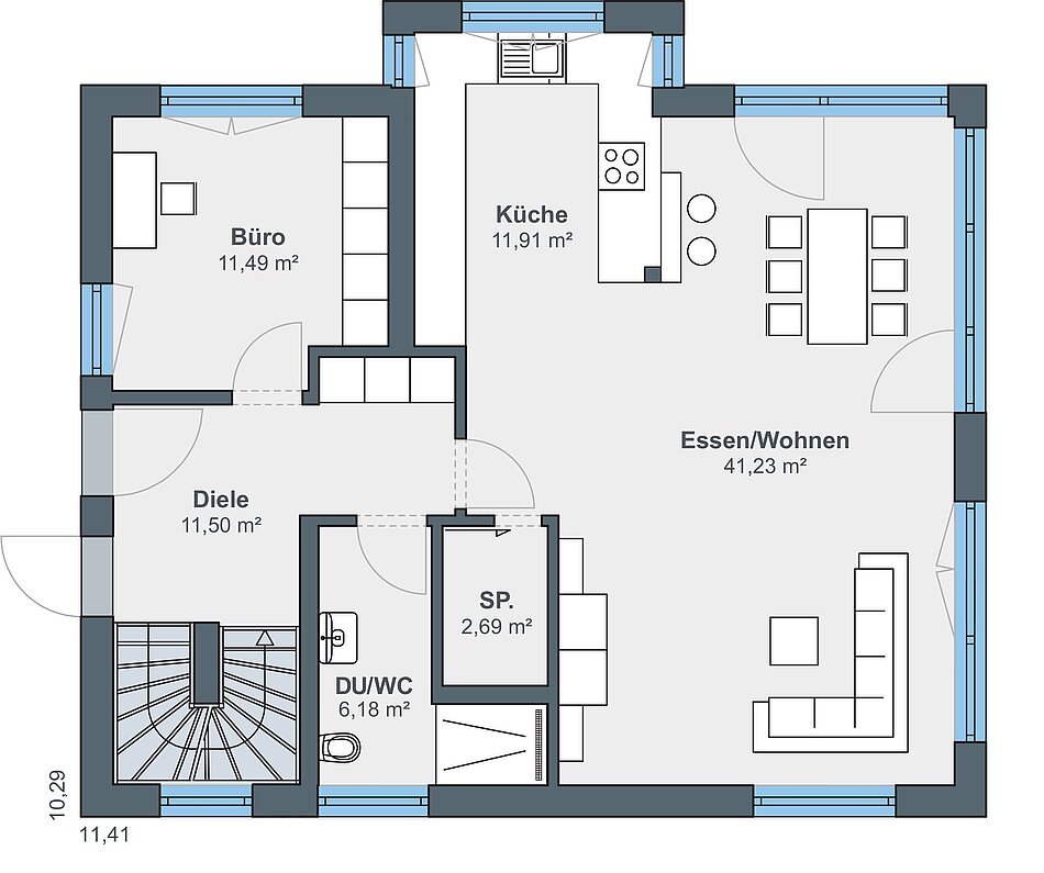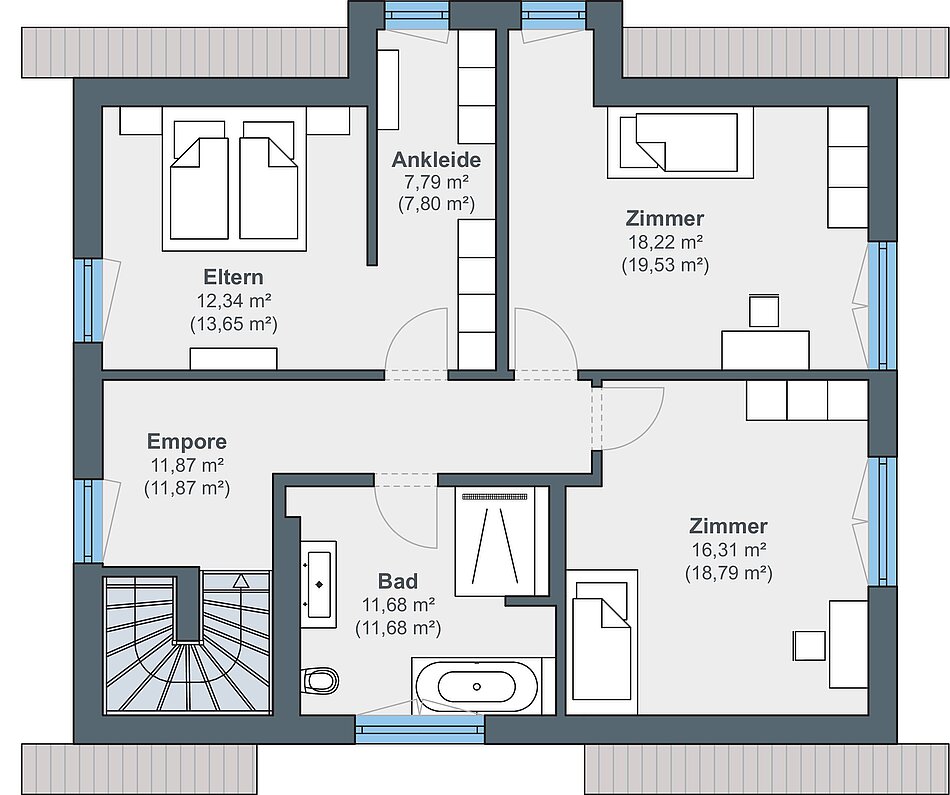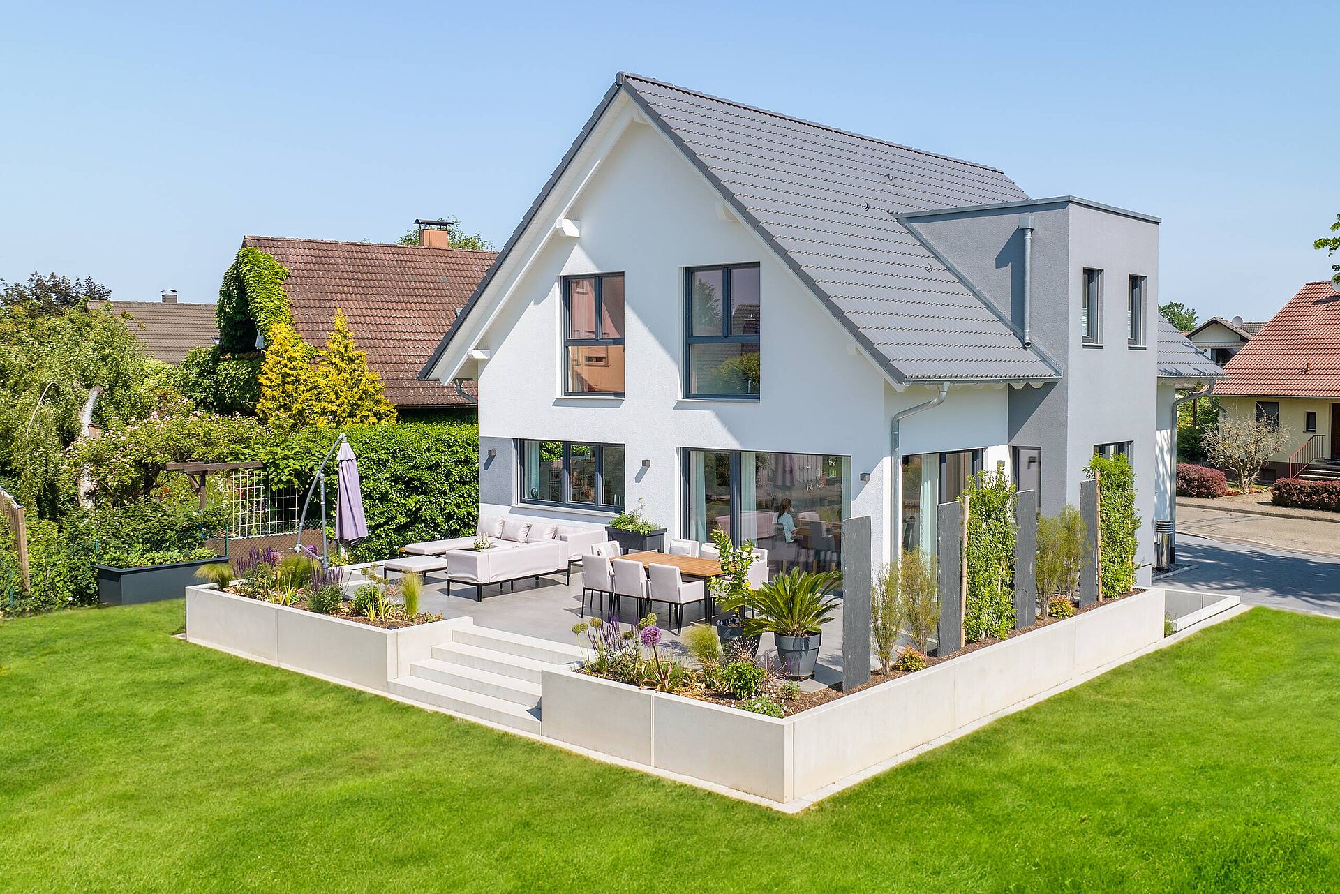 Aufgrund des Bebauungsplans aus den 1970er Jahren entstand ein anderthalbgeschossiges Einfamilienhaus mit Satteldach und niedrigem Kniestock. Charakteristisch ist der dritte Giebel mit Flachdach. Die Farbgestaltung ist zurückhaltend. Der dritte Giebel wurde passend zum Dach und den Fensterrahmen in Grau gestrichen, während das restliche Haus in Weiß erstrahlt. Das Dach mit sichtbaren Pfetten lockern das moderne Erscheinungsbild auf. Eine große Garage sowie ein Keller bieten ausreichend Staufläche.