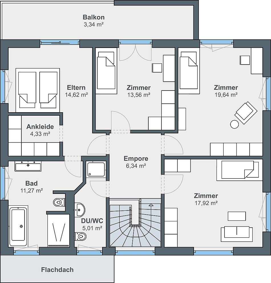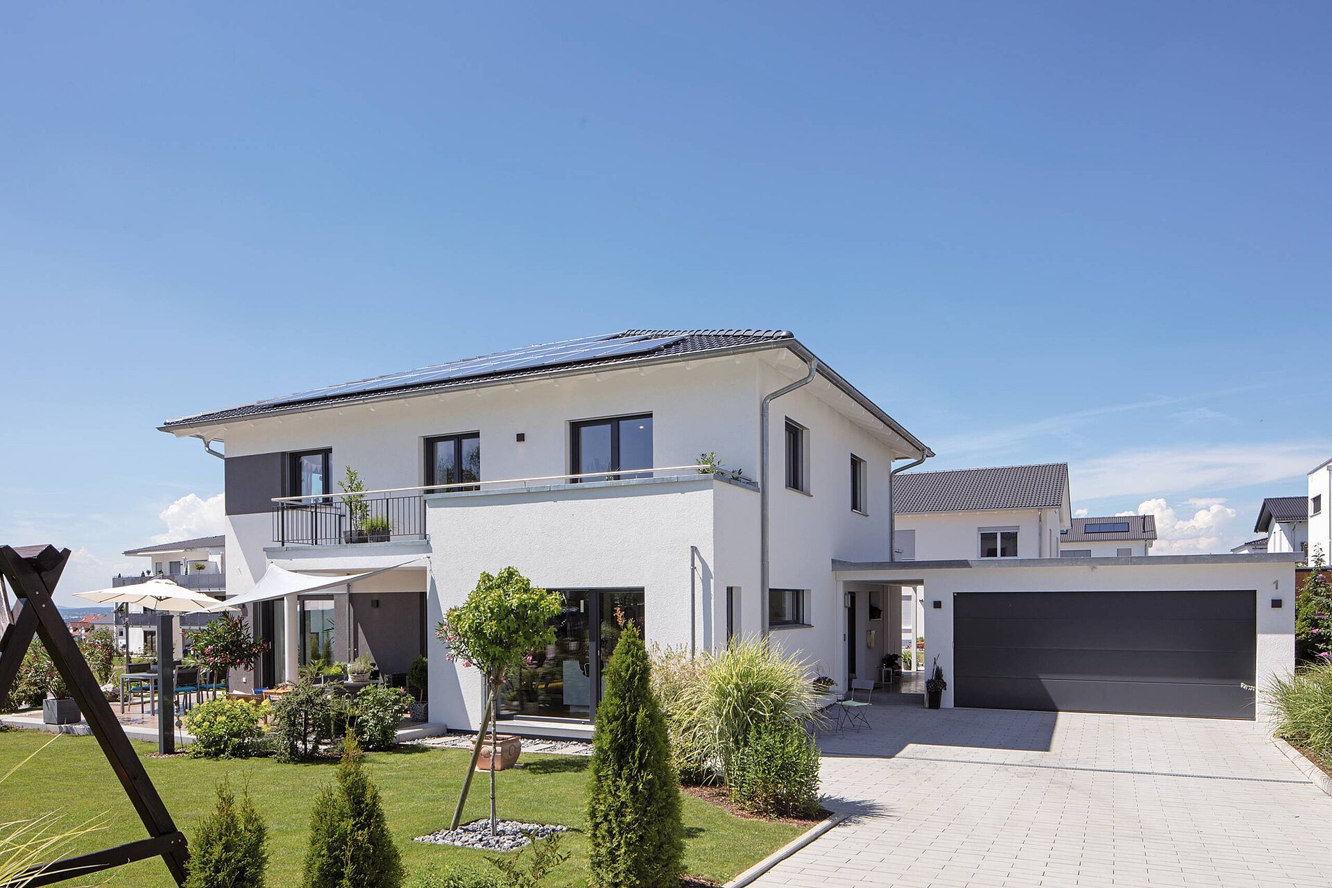 Den großen Wunsch nach mehr Platz konnte sich die vierköpfige Familie mit ihrem Traumhaus aus der Baureihe generation5.5 mit zwei Vollgeschossen erfüllen. Die Bauherren setzten bei der Außenfassade auf einen stilvollen, weißen Putz. In Verbindung mit den anthrazitgrauen Fensterrahmen und dem Walmdach wirkt das Einfamilienhaus zeitlos modern.Das Stadthaus bietet mit rund 210 Quadratmetern genügend Wohnfläche. Mit der Photovoltaik-Anlage auf dem Dach erzeugen die Hausbesitzer ihren eigenen Strom.