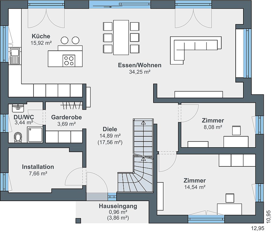 Mit dem flach geneigten Satteldach und der strahlend weißen Putzfassade fügt sich dieses Einfamilienhaus harmonisch in seine ländliche Umgebung ein. Für Spannung sorgen der grau angesetzte Übereck-Erker, der sich in eine praktische Eingangsüberdachung verlängert, sowie die Fenster in verschiedenen Formaten.