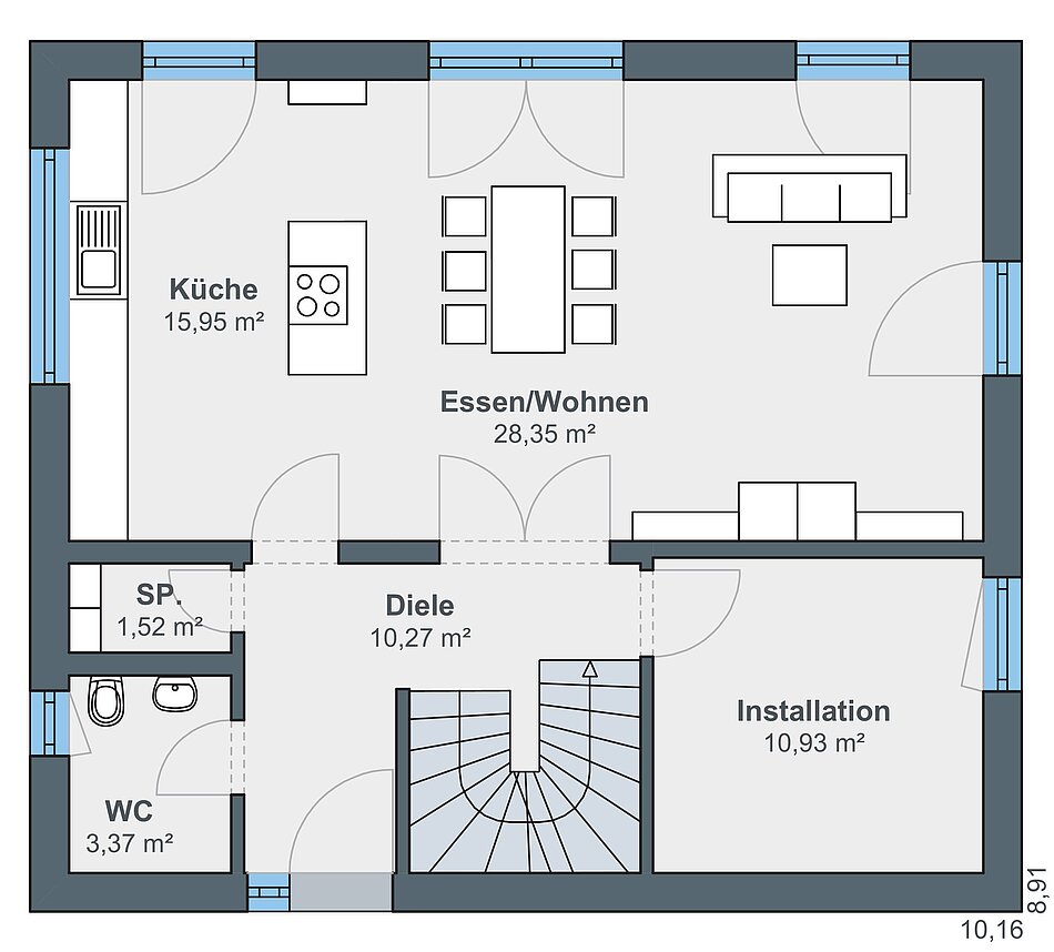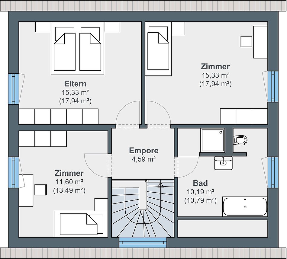 Dieses klassische Einfamilienhaus basiert auf der Baureihe generation5.5. Gekrönt wird das anderthalbgeschossige Haus von einem Satteldach mit sichtbaren Pfetten. Auch von innen kann sich der mit großzügigen 130 Quadratmetern „kleinste“ Entwurf der generation5.5-Familie sehen lassen. Die Grundrissgestaltung erfüllt alle Anforderungen an modernes Wohnen mit einem oder zwei Kindern.