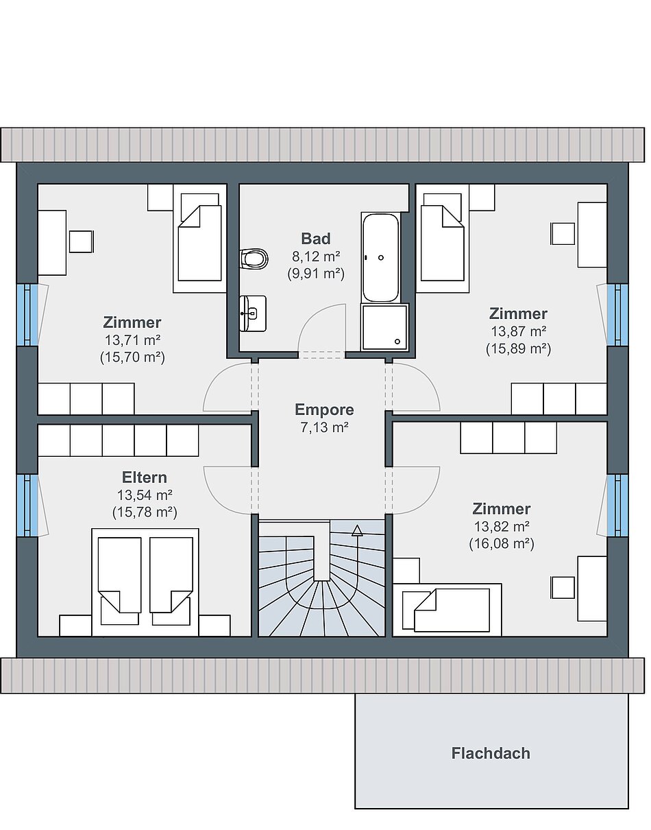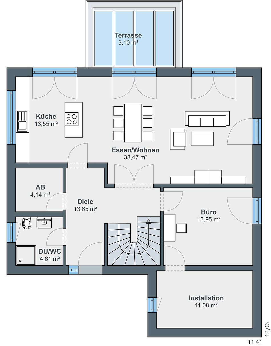 Großzügige Grundrisse, moderne, reduzierte Formen und mit dem leicht versetzten Pultdach beste Voraussetzungen für eine Photovoltaikanlage: So könnte Ihr generation5.5 als PlusEnergie-Haus aussehen. Auf eineinhalb Geschossen ist reichlich Platz für Komfort-Extras wie das flexibeln nutzbare Zimmer im Erdgeschoss oder die große Ankleide neben dem Elternschlafzimmer. Über die Terrasse, auf die man vom Wohn-Essbereich gelangt, bietet sich eine Pergola an. Optionen? Viele. Zum Beispiel eine Garage mit überdachter Verbindung zum Haus und zusätzlichem Abstellraum.