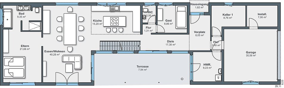 Am Rande eines idyllisch gelegenen Schweizer Örtchens realisierte eine Baufamilie diesen exklusiven Bungalow mit u-förmigem Grundriss und großer Terrasse. Die geschickte Raumeinteilung, die sich durch den schmalen Grundriss ergeben hat, erleichtert den gesamten Tagesablauf der Familie: „Keller, Garage und Hauswirtschaftsraum sind ideal miteinander verbunden. So kann man Einkäufe schnell in den Keller bringen oder die Wäsche machen, bevor es in den Wohnbereich geht“, so der Bauherr. Inspiriert durch italienische Einrichtungshäuser entstand ein mediterranes Raumkonzept, bei dem Braun- und Beigetöne dominieren. Im Bekanntenkreis gilt der Bungalow als „schönstes Haus im Ort“. Der zufriedene Bauherr resümiert: „Im Nachhinein würden wir alles wieder genauso machen.“