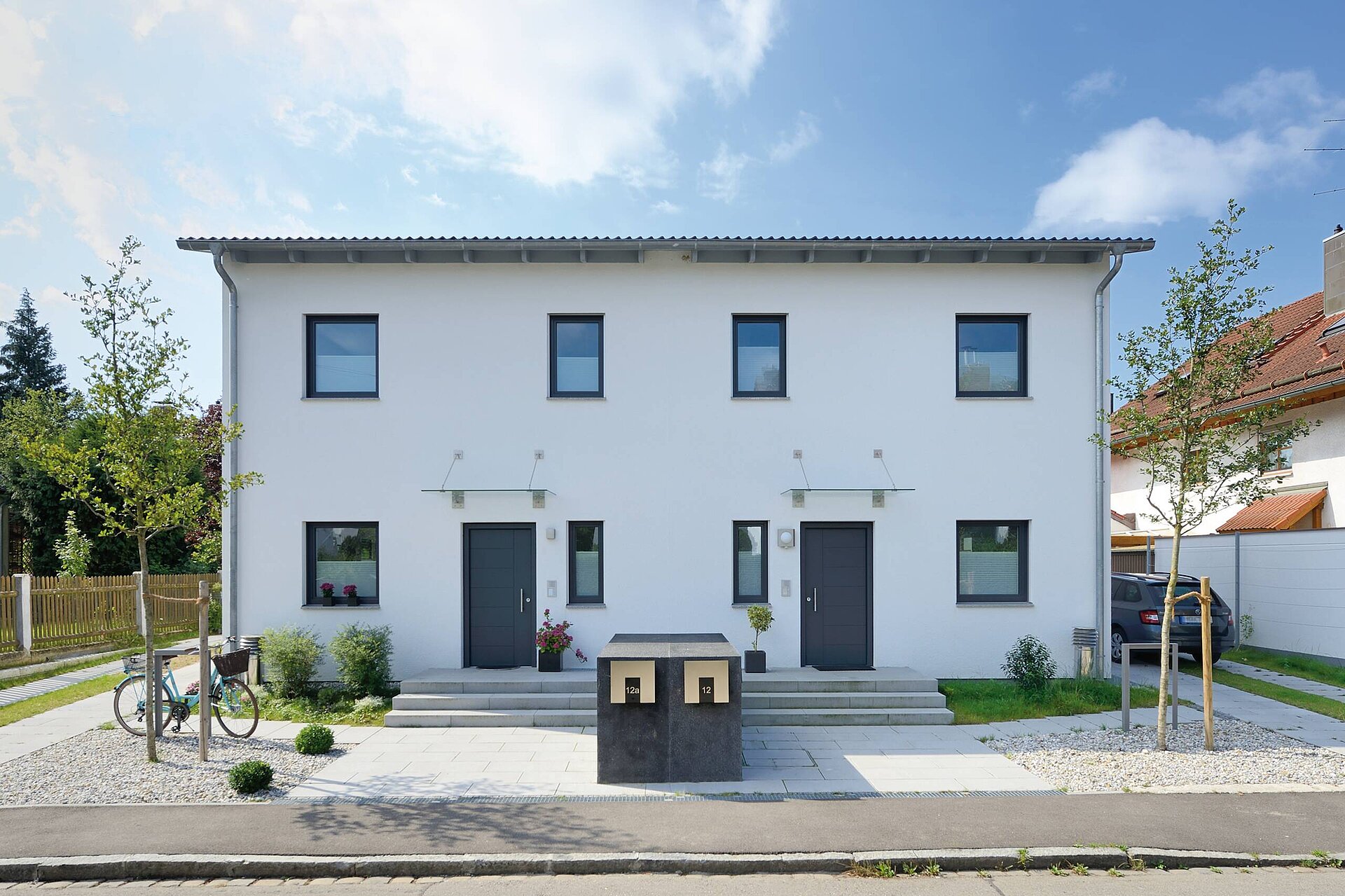 Freunden klarer puristischer Formen dürfte dieses Doppelhaus mit Satteldach gefallen. Die beiden Haushälften des frei geplanten Architektenhauses sind komplett symmetrisch. Jede bietet auf zwei Etagen eine Wohnfläche von insgesamt 94 Quadratmeter. Platz für eine Familie mit zwei Kindern ist genügend vorhanden. Den Wohnbereich im Erdgeschoss der abgebildeten rechten Doppelhaushälfte verbindet eine warm wirkende Holztreppe mit dem Schlafbereich im Obergeschoss. Große Glastüren zur Terrasse hin lassen viel Tageslicht in das Wohnzimmer mit offener Küche hinein.