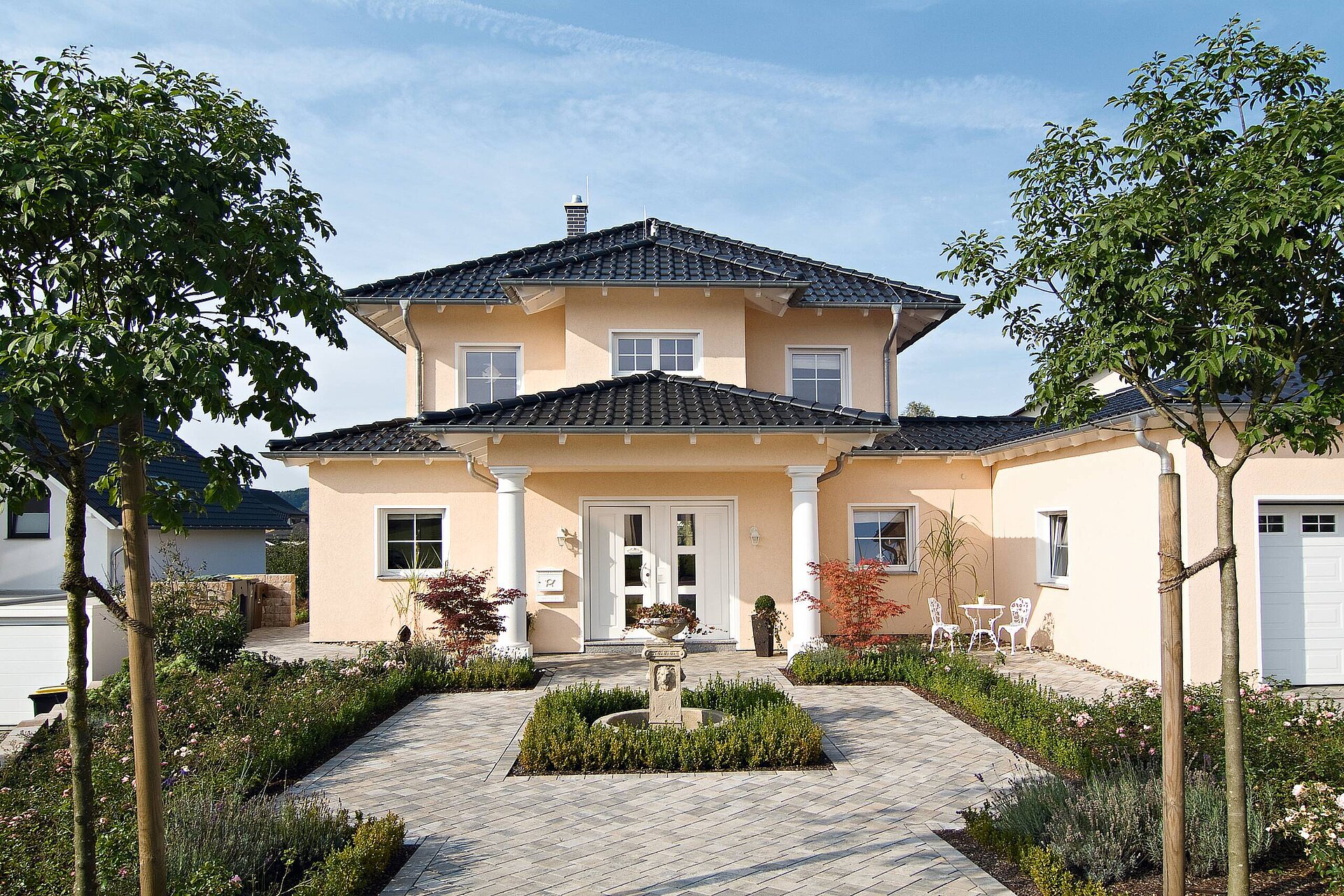 Die mediterrane Architektur stand bei diesem individuellen Entwurf Pate. Das Hauseingangsportal wirkt durch die Säulen und das ausladende Vordach besonders imposant. Das Obergeschoss ist ein kleines Stück nach innen versetzt, was dem Haus Leichtigkeit verleiht. Das Innere besticht durch eine offene Gestaltung. Die hochwertigen Materialien in erdigen Farbtönen machen die Wohnräume zu einer Quelle von Harmonie und Lebensfreude.