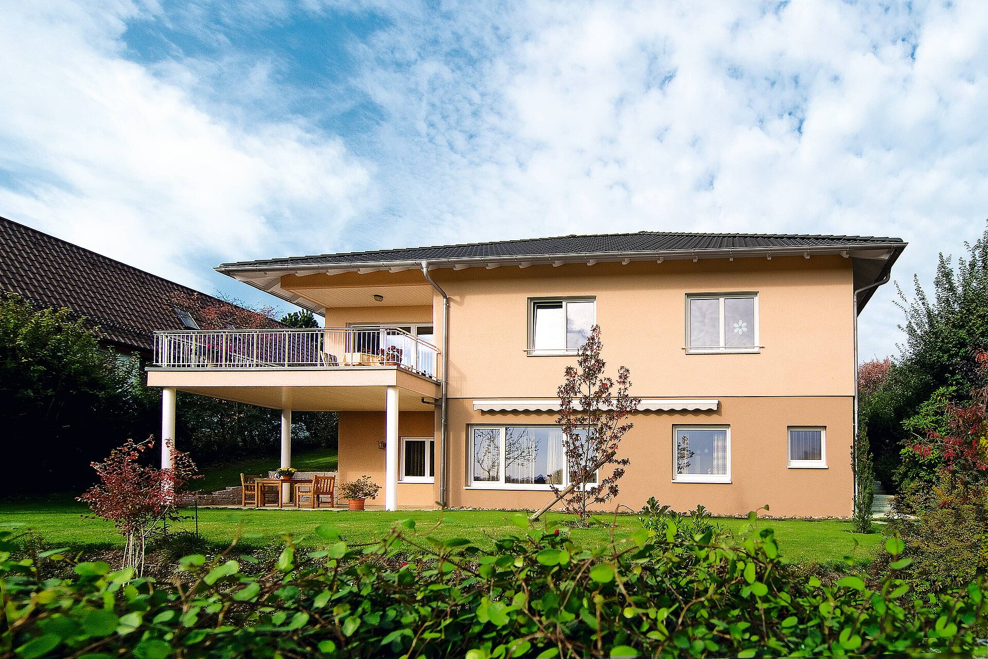 Die Bauherren von diesem terracottafarbenen Haus haben mit WeberHaus ihren Bungalow aufstocken lassen. Sie wünschten sich mehr Platz und eine geräumige Sonnen-Terrasse. So wurde das alte Haus bis auf den soliden Keller abgerissen und ein komplett neues Eigenheim darauf gebaut. Gleichzeitig wurden Balkon und Terrasse von der Südseite nach Norden verlegt, sodass man einen herrlichen Blick ins Grüne genießt. Durch die Aufstockung haben die Bauherren 40 Quadratmeter zusätzlichen Wohnraum gewonnen. Als Dachform wurde ein Walmdach gewählt, das gleichzeitig auch den Balkon überdacht.