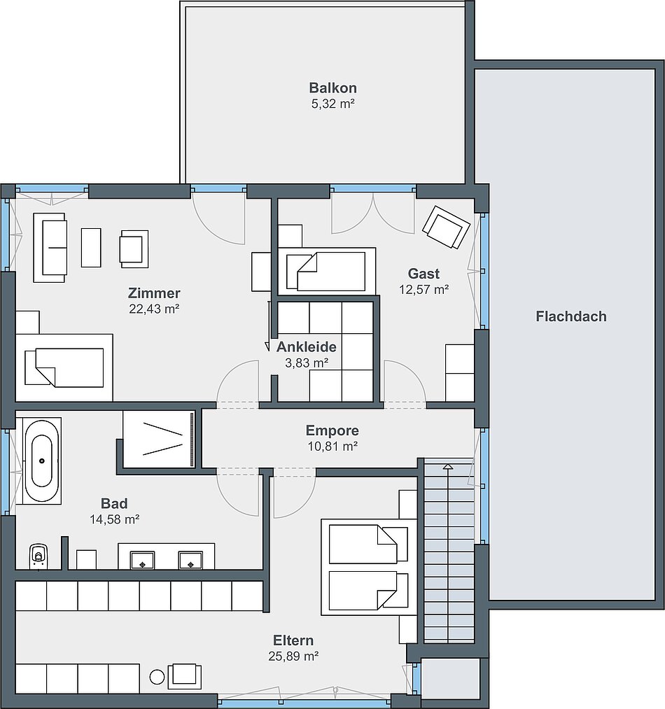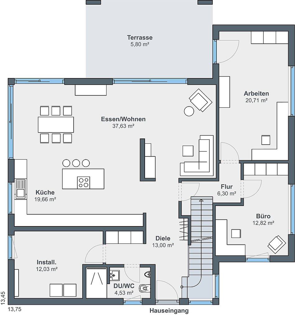Klare Linien und Formen bestimmen dieses frei geplante Architektenhaus mit Flachdach. Abgesehen von den anthrazit gerahmten Fenstern überwiegt die Farbe Weiß. Während zur Straßenseite kleine Fenster eingefügt wurden, öffnet sich das Stadthaus zum Garten mit großen Fensterfronten. Die Wohnfläche von rund 230 Quadratmetern verteilt sich auf zwei Vollgeschosse.