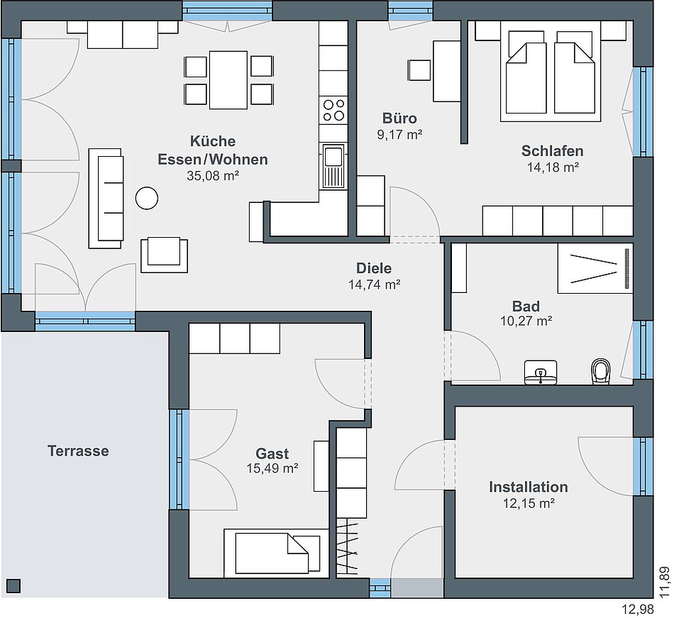 Möglichst lange selbstbestimmt in den eigenen vier Wänden leben – dieser barrierearmer Bungalow lässt den Wunschtraum zur Realität werden. Von außen zeigt sich der Neubau schlicht, aber dennoch sehr elegant. Mit seiner weiß verputzen Fassade und dem dunkel eingedeckten Walmdach fügt er sich harmonisch in die Bebauungssituation ein. Blickfang ist nicht nur die breite Fensterfront auf der Gartenseite, sondern vor allem der Rücksprung, der Raum für eine überdachte Terrasse schafft.