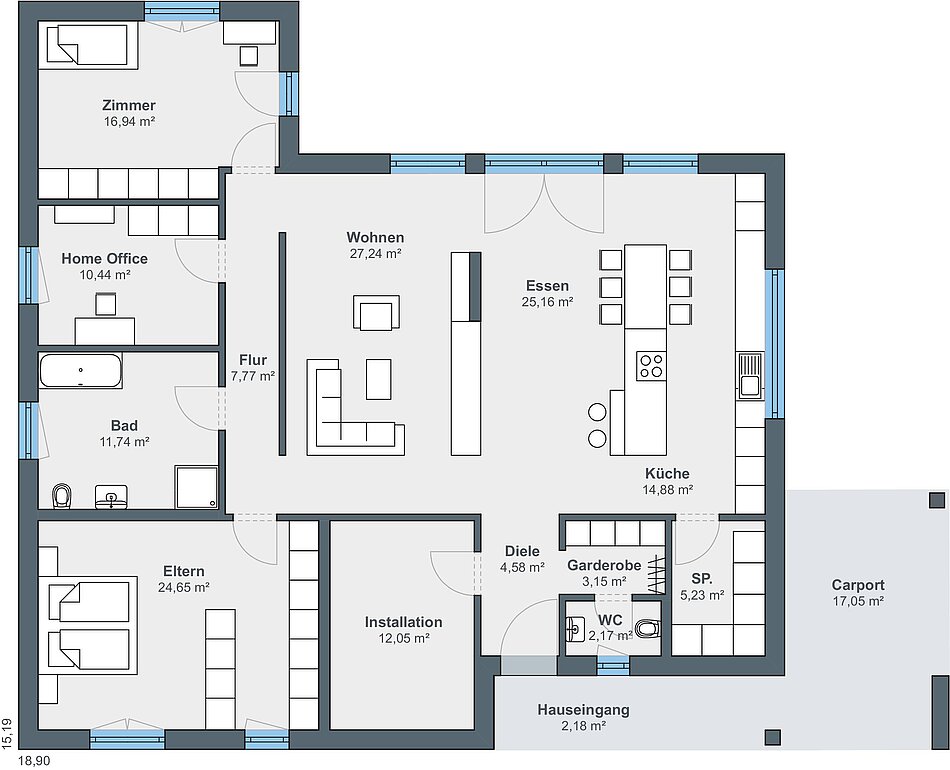 Die Hausgröße myLife 500 verfügt über eine Wohnfläche von rund 168 Quadratmetern. Angrenzend an der Diele befinden sich hier eine integrierte Garderobe sowie ein Gäste-WC. Links von der Haustür liegt der Installations- bzw. Hauswirtschaftsraum. Der Wohn-Ess-Kochbereich ist offen gehalten. Große Fensterfronten lassen viel Tageslicht ins Hausinnere und ermöglichen einen schönen Blick auf den Garten. Der Wohnbereich wird durch eine eingezogene Wand von den privaten Räumlichkeiten abgetrennt, so dass ein Flur entsteht. Dahinter befinden sich ein Schlafzimmer mit integrierter Ankleide, ein Badezimmer sowie zwei weitere Zimmer, die als Büro oder Kinderzimmer genutzt werden können.