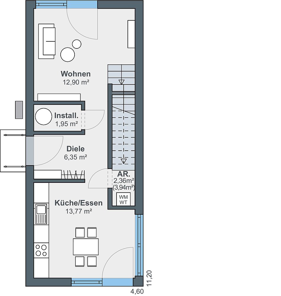 Die Baureihe OPTION vereint Design und hochwertige Materialien, um kompaktes Wohnen und individuellen Freiraum mit wirtschaftlicher Attraktivität zu verschmelzen. Der Fokus liegt auf der Idee, dass wahre Wohnqualität nicht durch übermäßige Raumgröße, sondern durch raffinierte Grundrissplanung entsteht. Die zweigeschossige Variante präsentiert sich auf der Vorderseite zurückhaltend, während die Rückseite von großen, bodentiefen Fenstern geprägt ist. Die vertikale Holzschalung verleiht dem Haus ein warmes und dennoch modernes Erscheinungsbild. Mit einer Länge von über elf Metern und einer Breite von 4,6 Metern bietet OPTION etwa 70 m2 Wohnfläche.