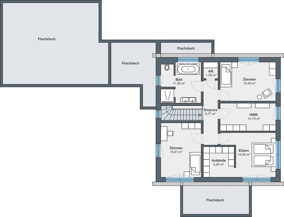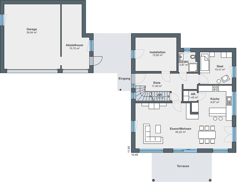 Die Besitzer von diesem WeberHaus haben schon immer von einer Stadtvilla geträumt. Am liebsten mit zwei Etagen und einem Grundriss, der eine freie Raumaufteilung möglich macht. Das beinahe quadratische Einfamilienhaus mit rund 170 Quadratmetern wird von einem Satteldach gekrönt. Holz-Applikationen an der Fassade und dem Garagentor lockern das ansonsten weiß verputze Eigenheim auf und verbinden die beiden Gebäude optisch miteinander. Ausgestattet mit der Frischluft-Wärmetechnik, einer Photovoltaik-Anlage und einem Batteriespeicher erfüllt das Einfamilienhaus die hohen Voraussetzungen für ein KfW-Effizienzhaus 40 Plus.