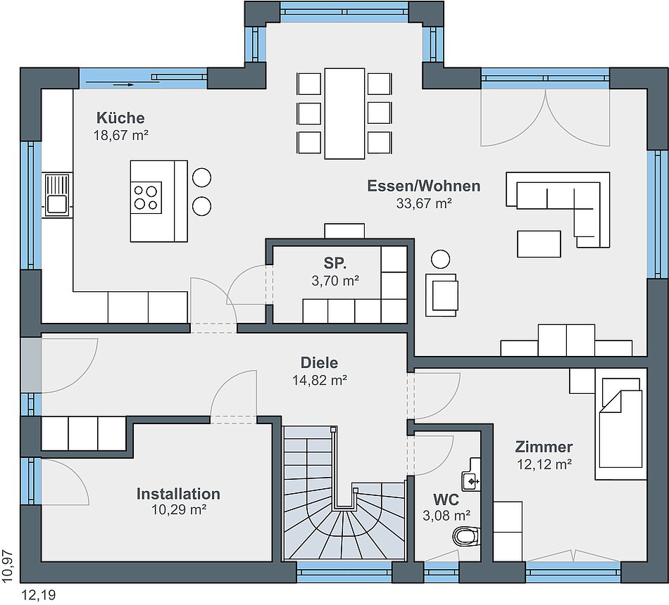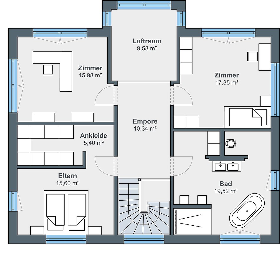 Bei dieser Stadtvilla handelt es sich um ein frei geplantes Architektenhaus mit Walmdach. Das elegante Einfamilienhaus strahlt eine gewisse Symmetrie und Geradlinigkeit aus. Durch die gleich großen Fenster wirkt das Haus einheitlich, wie aus einem Guss. Die Farbgestaltung wird bestimmt von einem schicken Hell-Dunkel-Kontrast. Stilvoll setzen sich die anthrazitfarbenen Fensterrahmen von der strahlend weißen Putzfassade ab. Der dritte Giebel mit Satteldach erweitert die Wohnfläche und ermöglicht eine Empore.