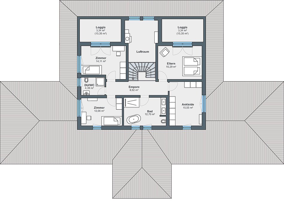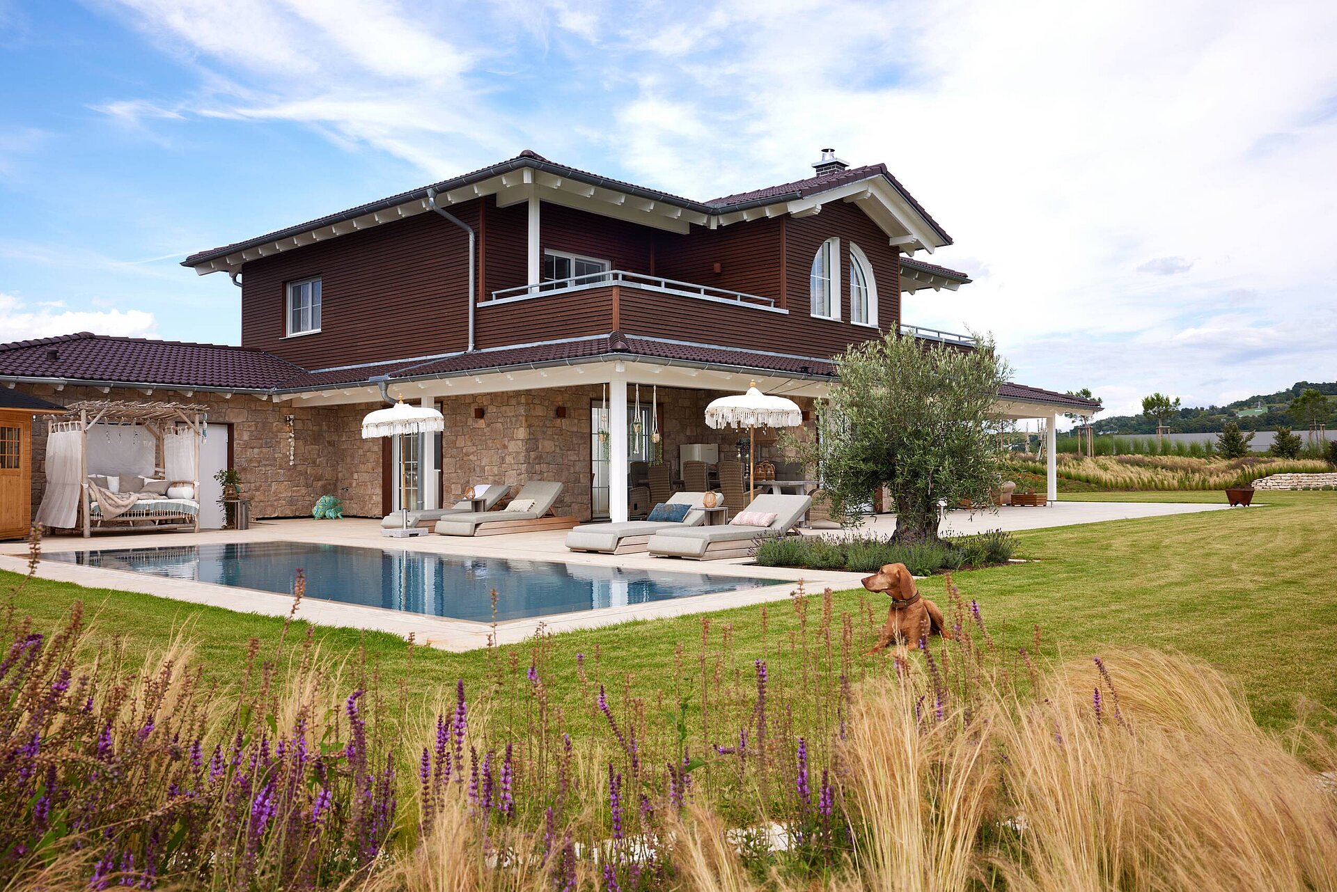 Als Teil eines großen Trainings- und Zuchtbetriebs für Westernpferde war klar, dass sich das neue Wohnhaus im modernen Western-Look präsentieren sollte. Für Cowboy-Romantik sorgen unter anderem das von Stützen getragene Vordach, die halbrunden Fenster, die beiden Loggias auf der Gartenseite sowie rotbraune Holzverschalung am Obergeschoss. Das Untergeschoss hüllt sich in rustikale Steinverblender, die dem Gebäude einen mediterranen Touch verleihen.