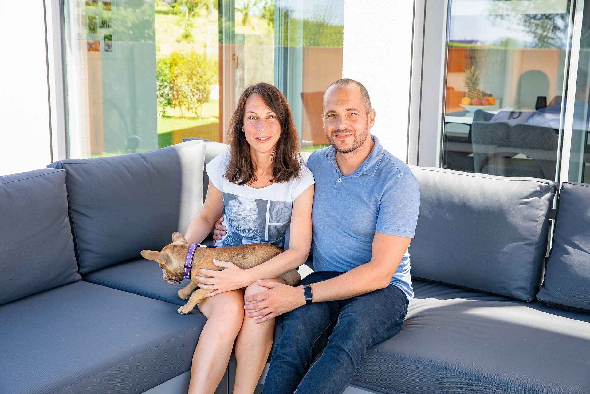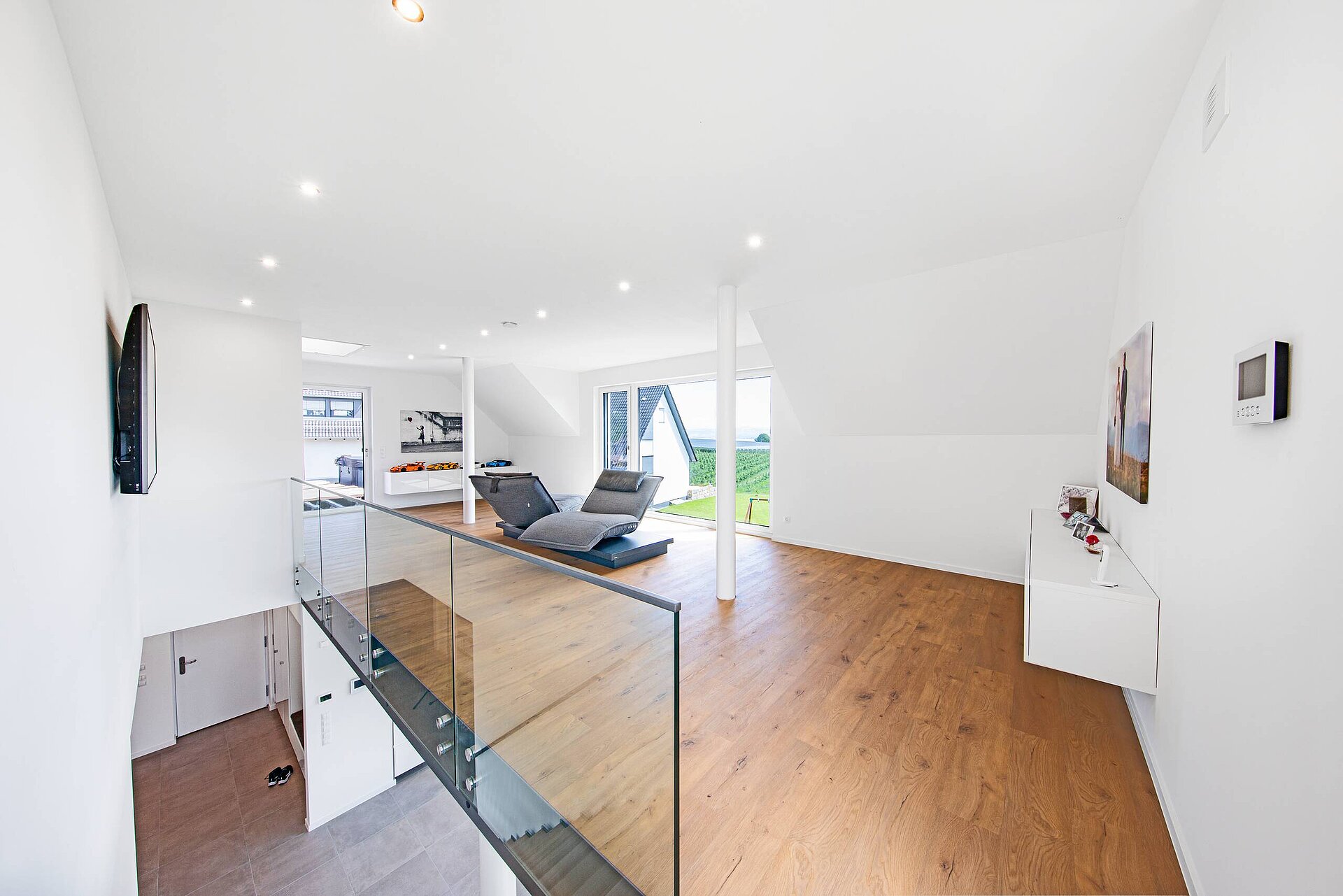 Uns gefällt an unserem Haus besonders der nicht alltägliche Grundriss, die großen Fensterfroten und das Wohnzimmer im Dachgeschoss mit Blick auf den Bodensee. Hier sitzen wir am liebsten auf dem drehbaren Sofa, wo man entweder TV schauen oder die Natur durch das große Fenster bestaunen kann.