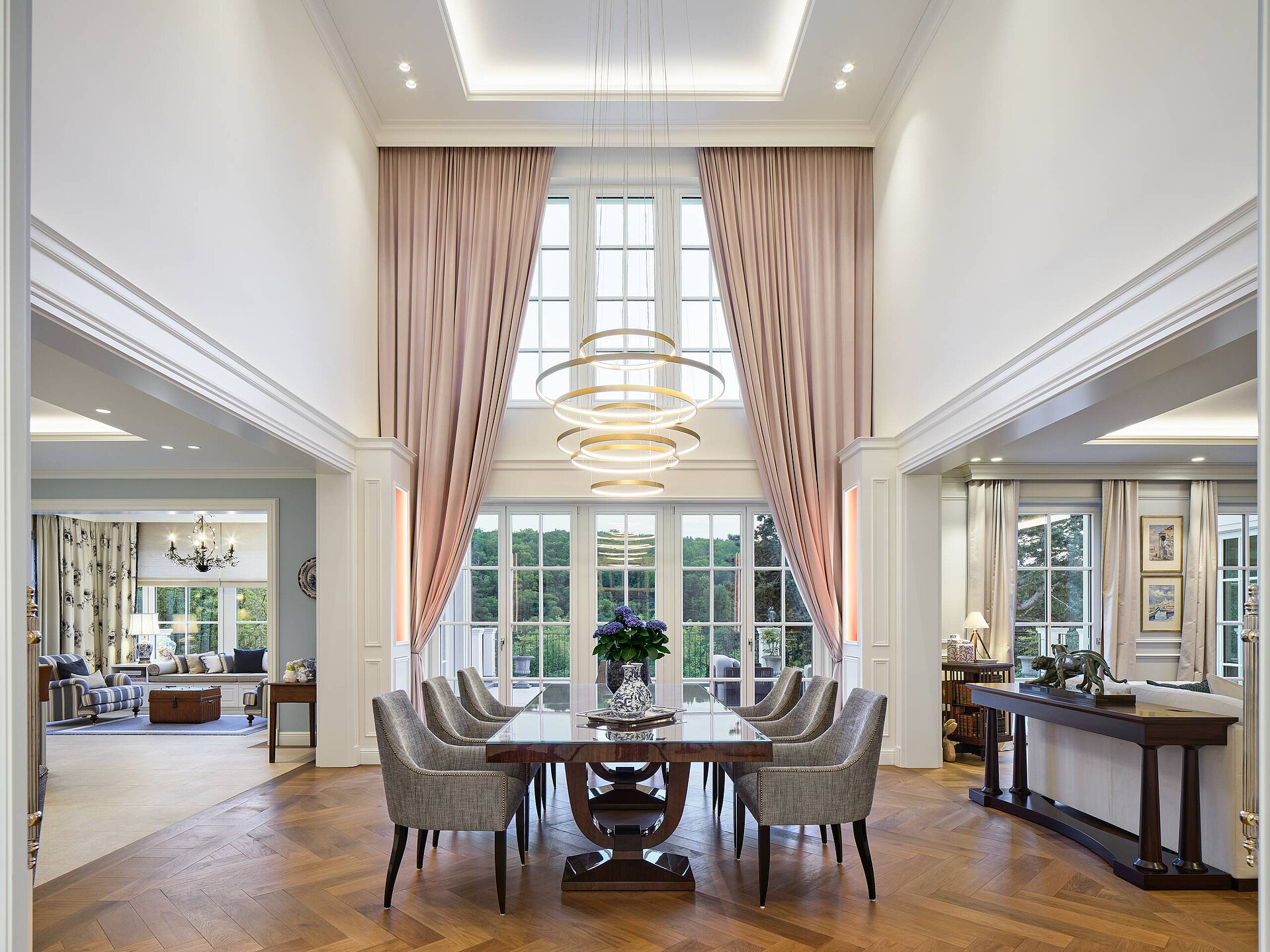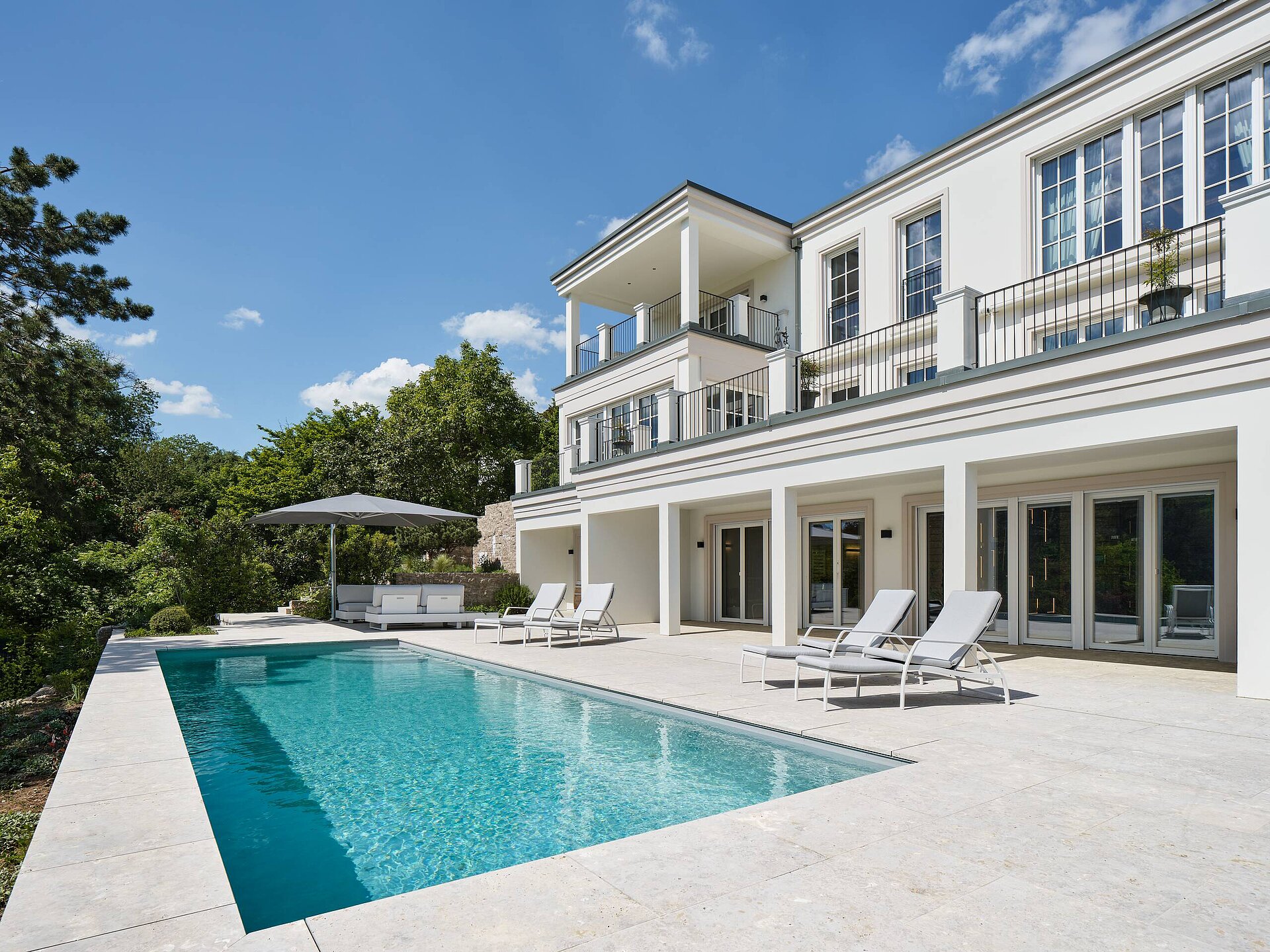Diese Villa präsentiert sich in einem gelungenen Stilmix aus traditionellen und zeitgenössischen Elementen. Mit der symmetrischen Gliederung, den großen Fenstern mit echten Holzsprossen, den Pilastern und dem von Säulen getragenen Vordach lehnt sie sich deutlich an die georgianische Architektur an. Auf der Rückseite präsentiert sich das Gebäude dagegen sehr modern und offen. Das stilvolle Zusammenspiel von klaren Linien und luxuriösen Details macht dieses Haus zu einem Meisterwerk individueller Architektur. Eine Inspirationsquelle für alle, die bei ihrem Neubau höchste Ansprüche an Design und Qualität stellen.