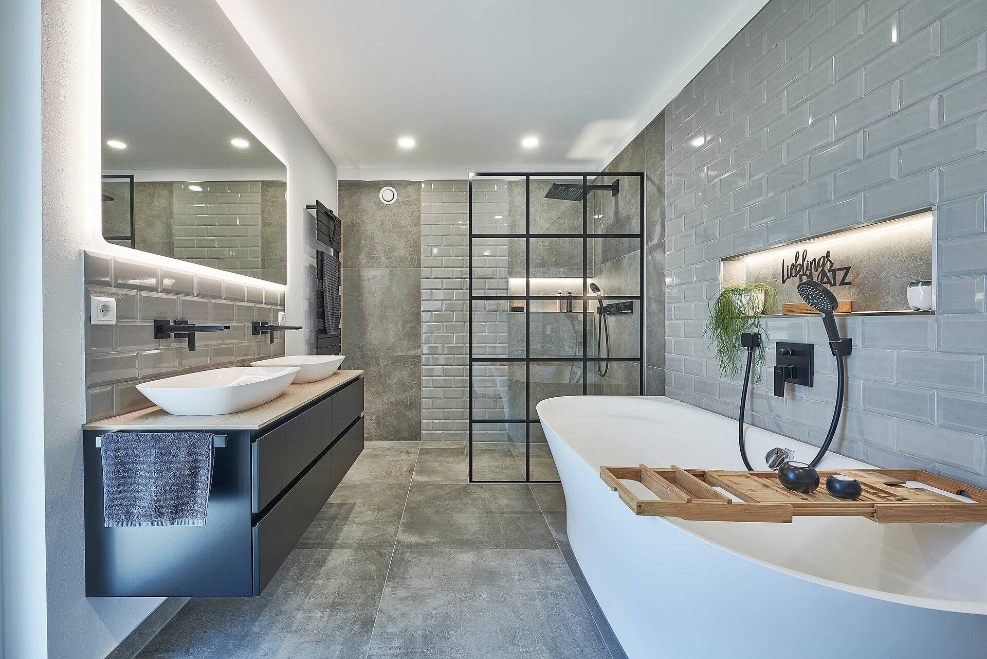 Ein Büro, 3 Bäder, ein großer Eingangsbereich mit verstecktem Schuhschrank unter der Treppe, sowie ein großzügiger Hauswirtschaftsraum mit Zugang zur innenliegenden Doppelgarage runden unser Wohnkonzept ab.
