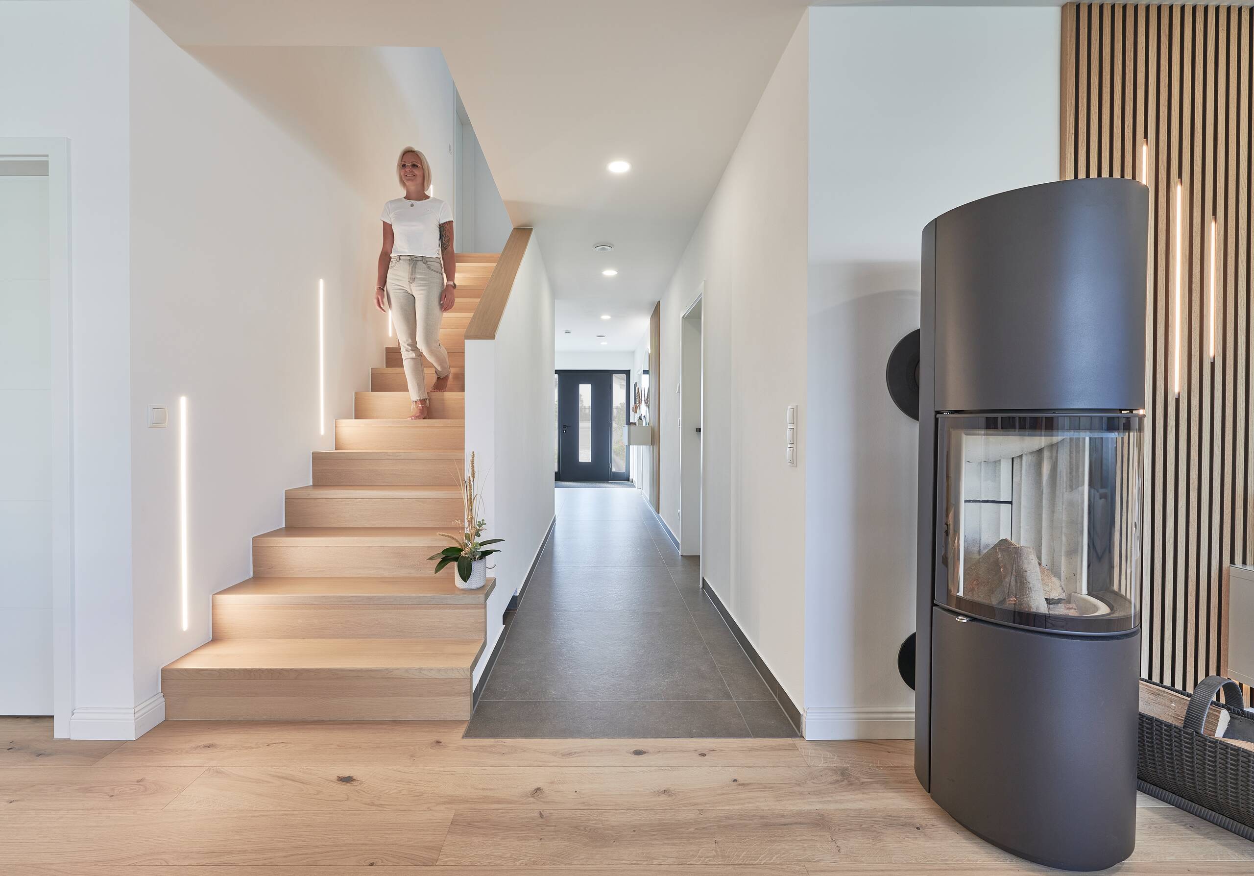 Viele Details, wie z.B. das Versteck für den Saugroboter mit Ausfahrt unter der Treppe, die Speisekammer, der Elternbereich mit Ankleidezimmer usw. konnten wir durch die individuelle Planung mit WeberHaus und unserem Architekten umsetzten.