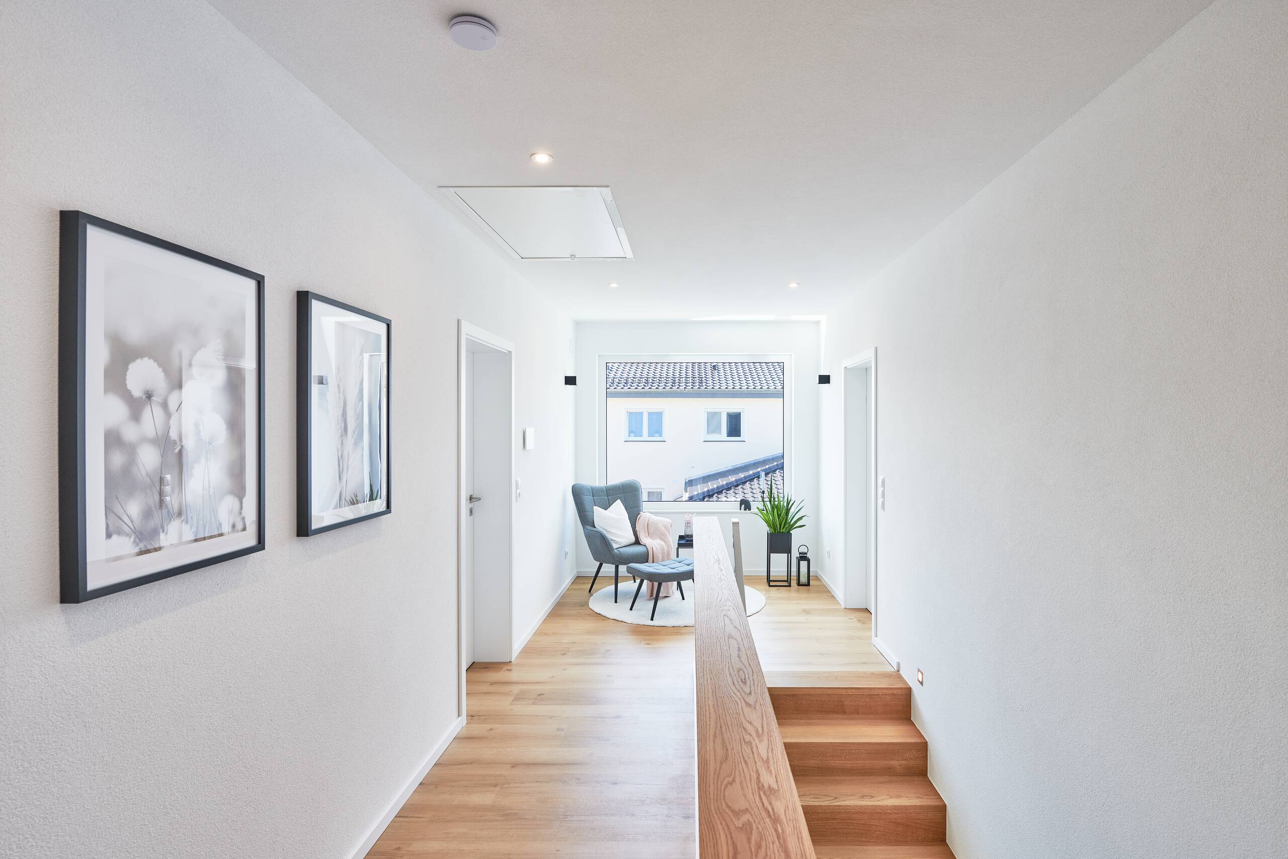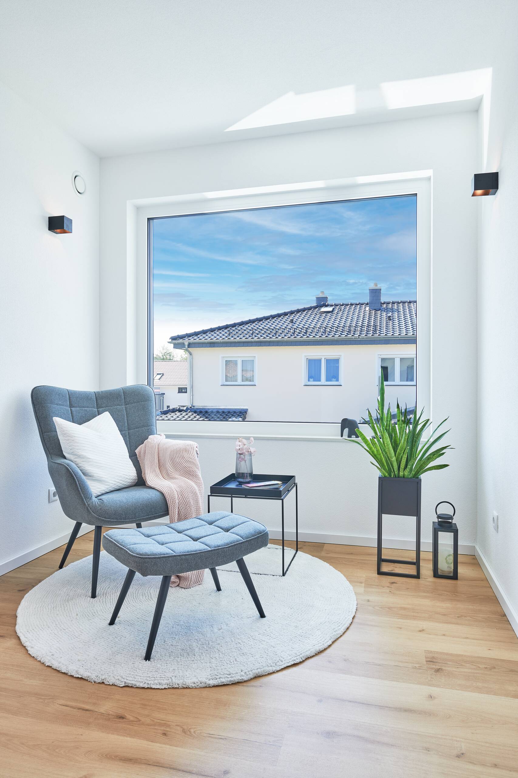 Wir hatten schon immer eine klare Vorstellung, wie unser Haus aussehen soll. Angefangen beim Grundriss, von der Raumaufteilung bis hin zur Außenansicht. Grundsätzlich war ein offener Grundriss mit vielen großen, bodentiefen Fenstern wichtig. 2 Vollgeschosse sollten es sein, damit wir keine Dachschrägen haben und den Platz optimal ausnutzen können. Wir wollten eine gerade Treppe in Faltwerkoptik mit Glasgeländer, die nicht direkt im Hauseingangsbereich steht, sondern mitten im Haus als Mittelpunkt. Zudem war uns wichtig, dass Haus und Garage aus einem Guss wikren und zusammengehören.