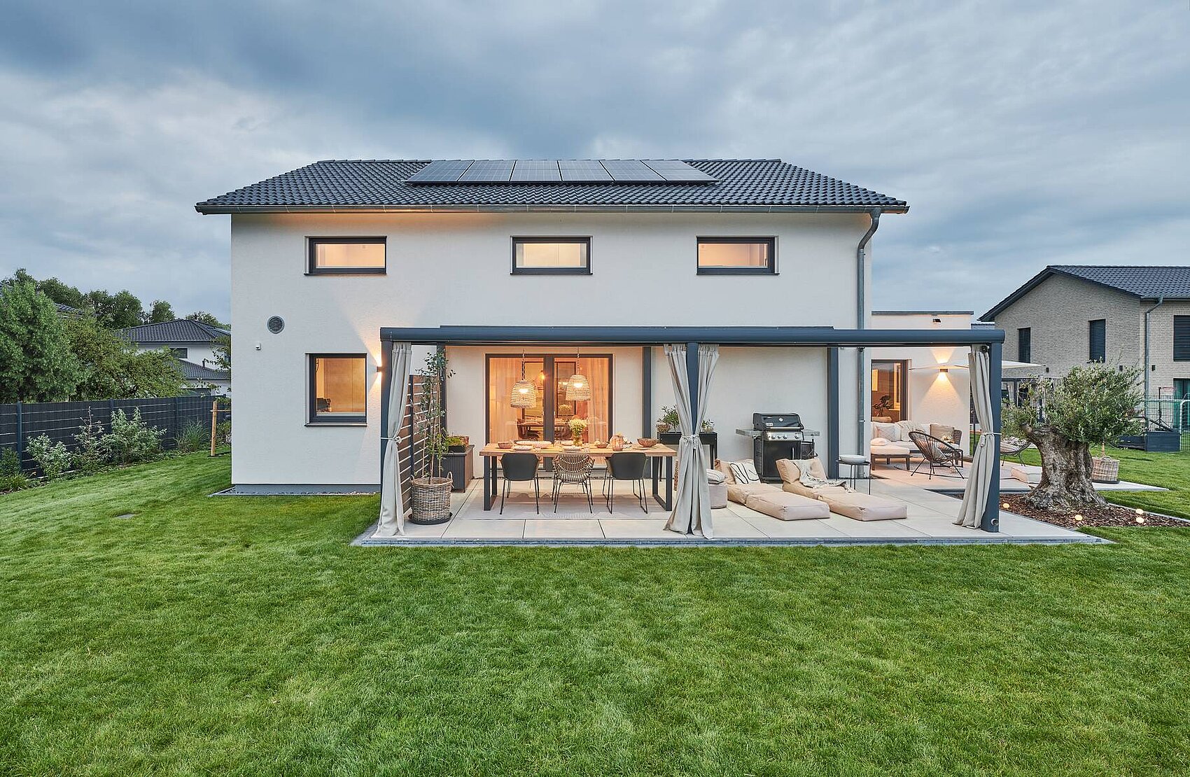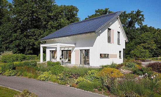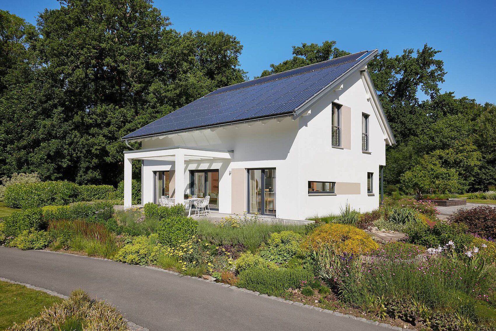 Ein modernes, weißes Einfamilienhaus mit einem Satteldach, das mit Solarzellen ausgestattet ist. Vor dem Haus befindet sich eine Rasenfläche mit Gartenpflanzen und Sitzecken. Im Hintergrund sind grüne Bäume sichtbar, die eine natürliche Umgebung schaffen.