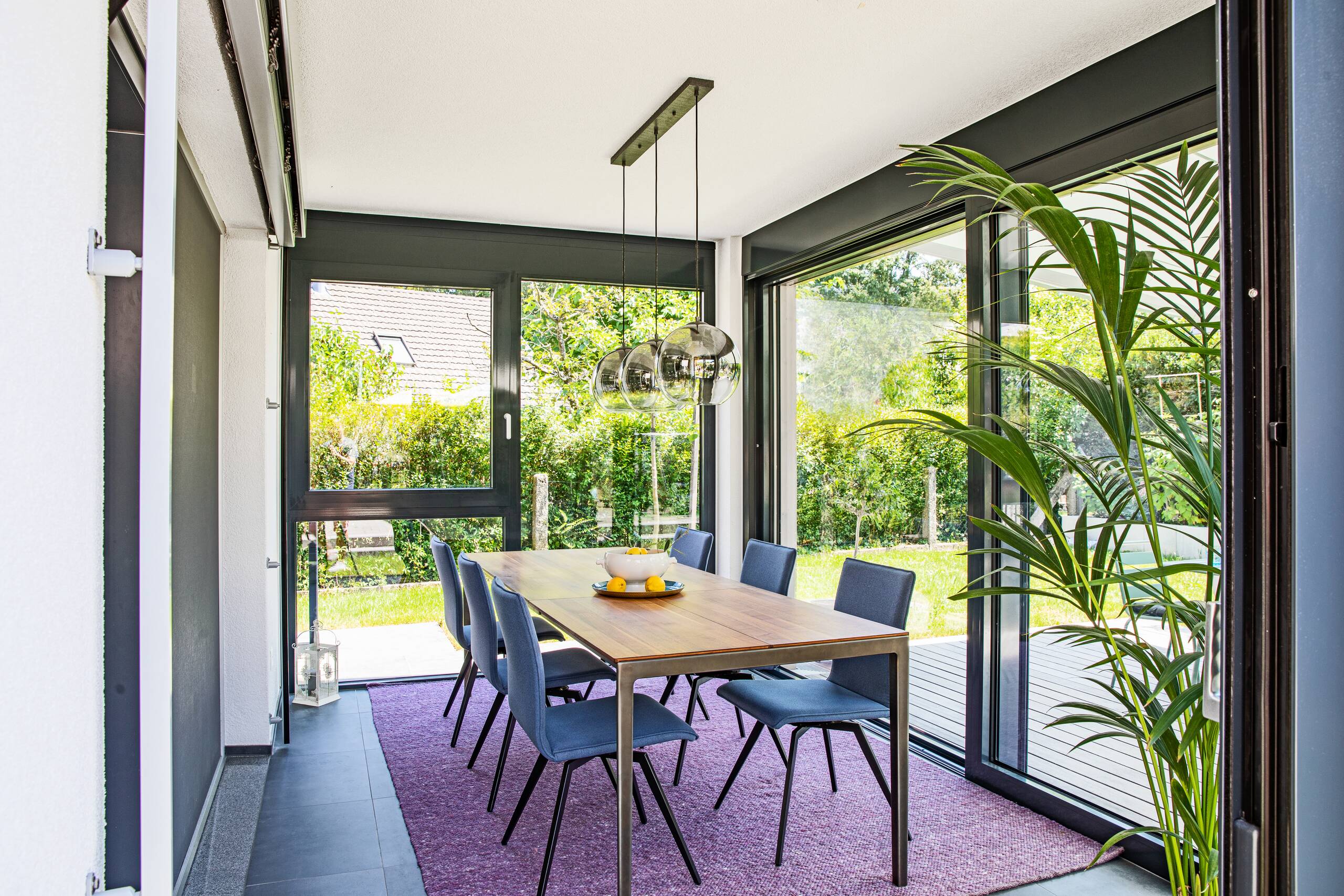 Klein, aber fein und funktional – so beschreibt die vierköpfige Familie selbst ihr neues Domizil. Die warme Holzverschalung des Anbaus setzt einen schönen Kontrapunkt zur gelben Putzfassade des elterlichen Hauses, greift aber gleichzeitig auch Elemente der regional typischen Architektur auf. Markant ist das Geschoss mit Satteldach, in dem sich der Durchgang zum Bestandsgebäude befindet. Zur Gartenseite hin verwandelt sich der Anbau in einen modernen Flachdachbau mit großer Dachterrasse on top.