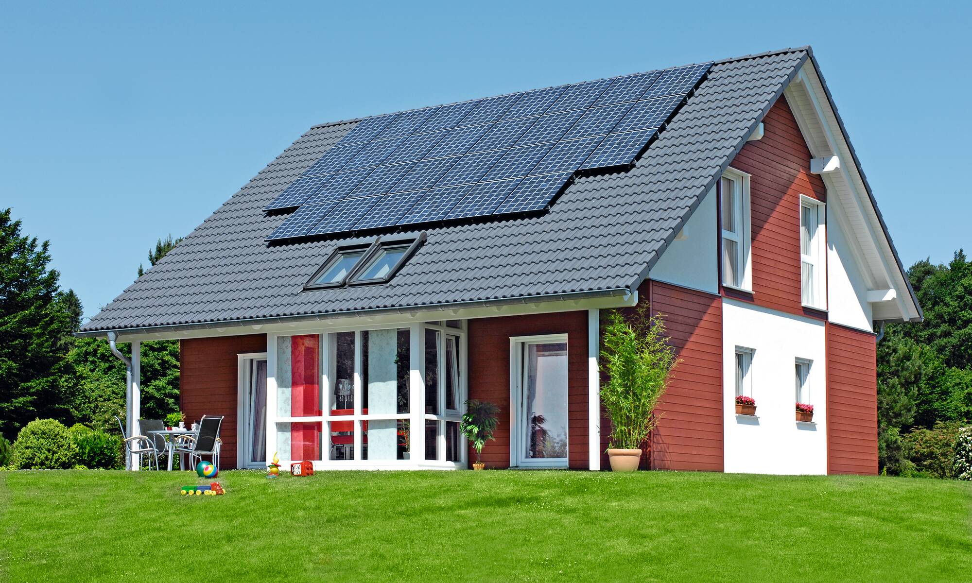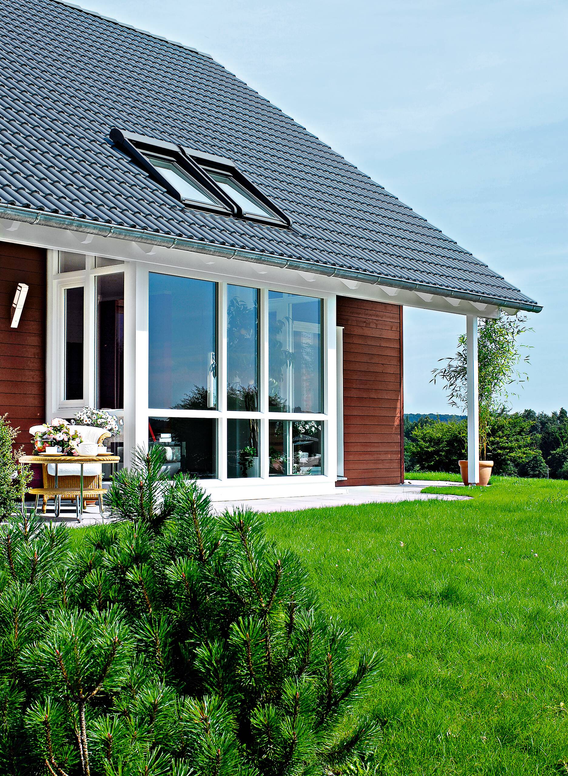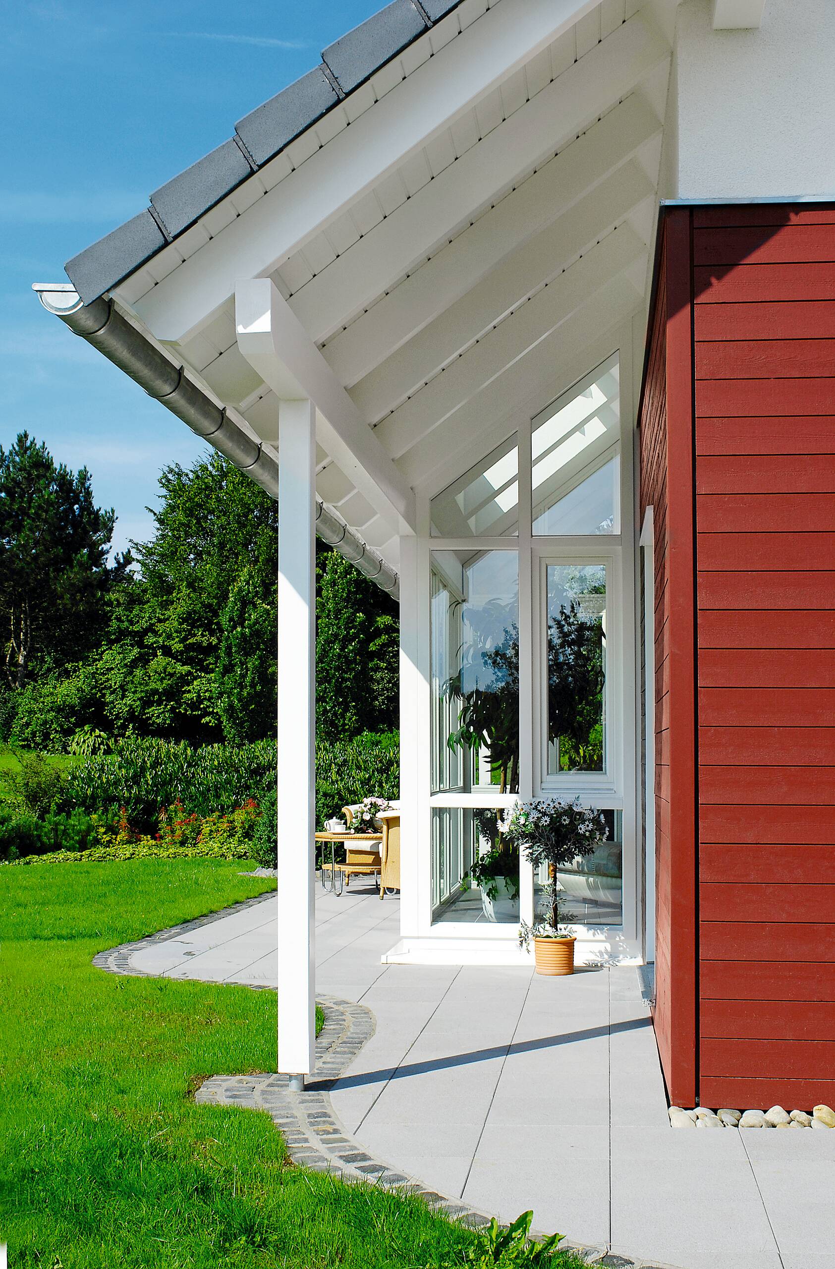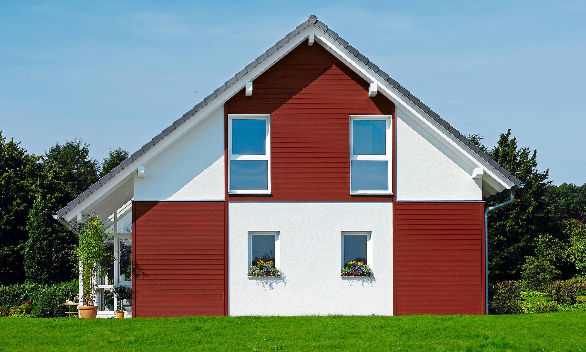 Einzigartig wird dieses WeberHaus durch die vielen Möglichkeiten der Fassadengestaltung. Durch die naturfarben belassene Holzverschalung gewinnt das Haus sofort an Wertigkeit und vermittelt auch nach außen in Akzenten die Wärme des natürlichen Baustoffes Holz. Wählen Sie zum Beispiel nur die Verschalung des Eingangsbereiches, um Ihre Gäste besonders stilvoll willkommen zu heißen. Mit der Ausführung attraktivem Oxidrot hingegen, kombiniert mit weißer Putzfassade, wird das Haus garantiert zum Hingucker. Es bleibt also Ihnen überlassen, was das Haus ausstahlen soll. Aber nicht nur Außengestaltung und Architektur mit zwei überdachten Terrassen und einem mittig platzierten Wintergarten, der optional erhältlich ist, überzeugen. Auch beim Betreten des Hauses kommt man ins Staunen, denn das Haus entpuppt sich als wahres Raumwunder.