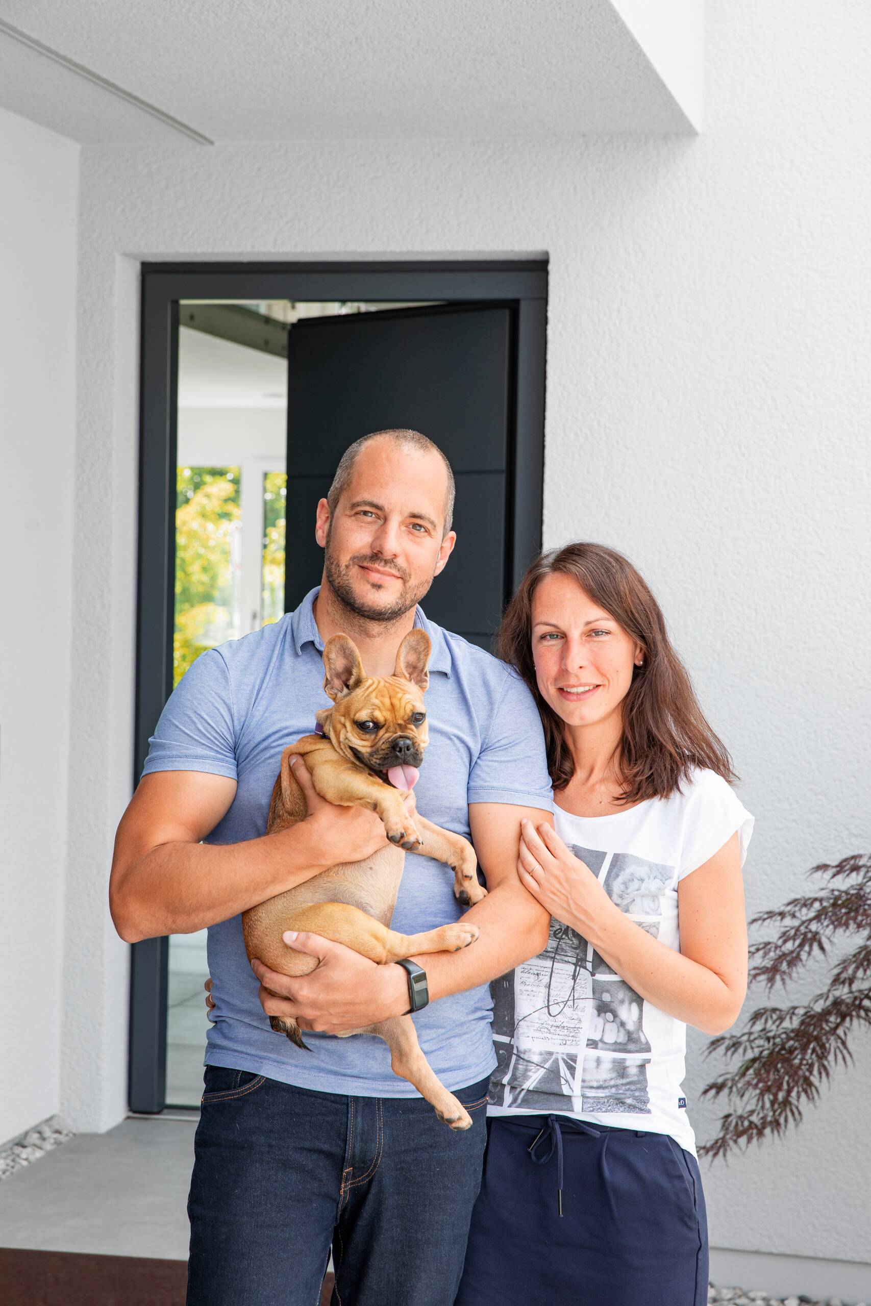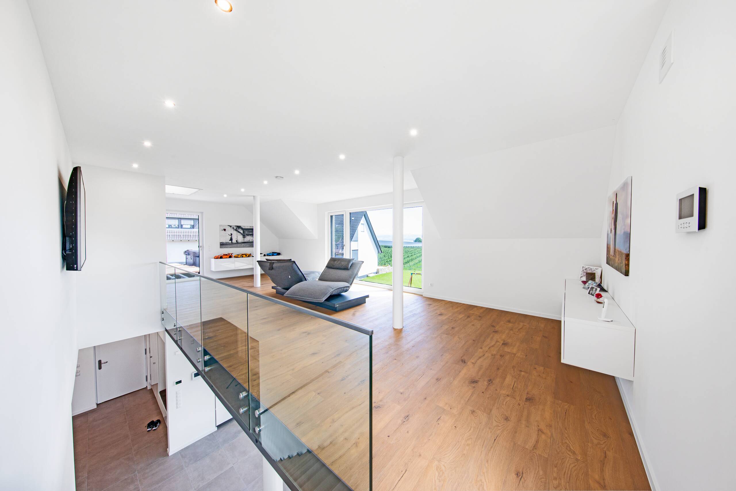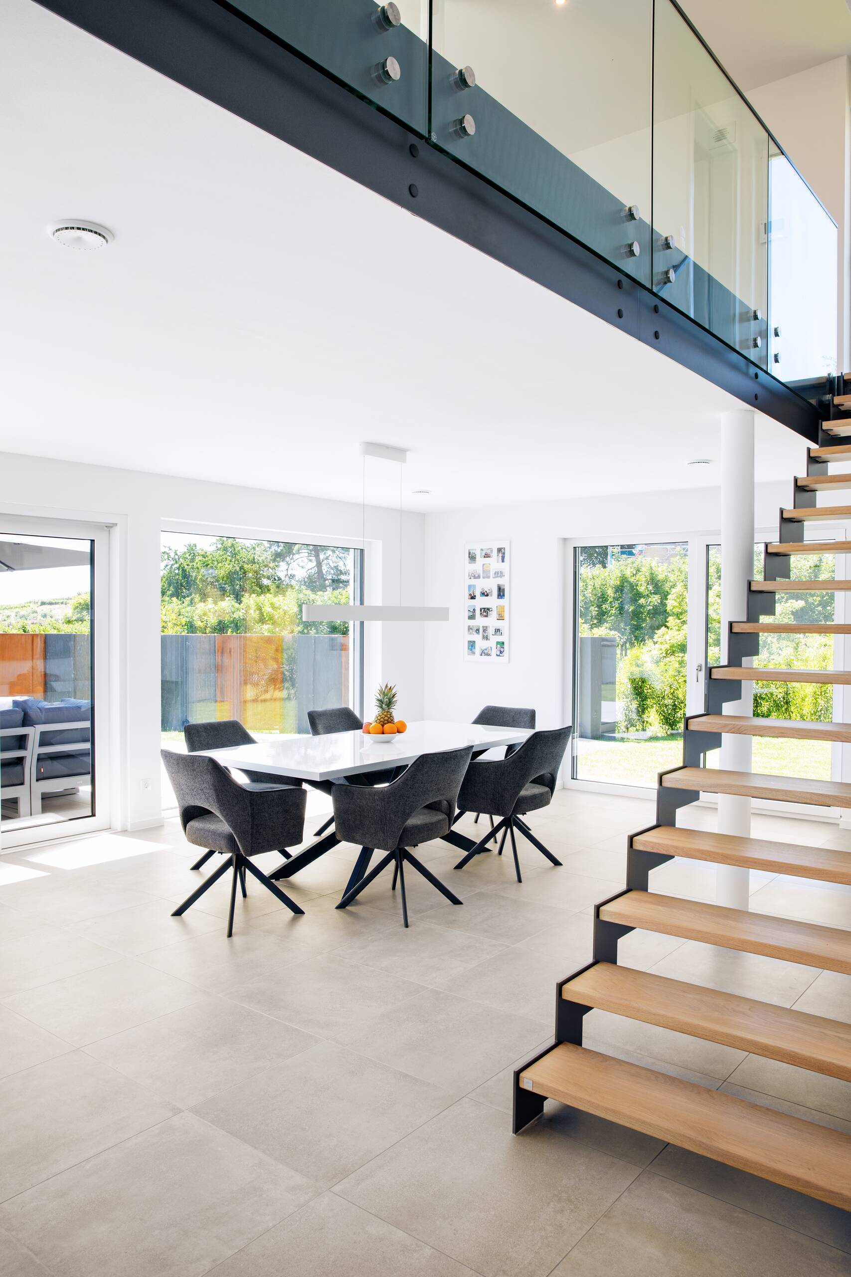 Beinahe quadratisch ist dieses Eigenheim, das auf der Baureihe Balance basiert. Das anderthalb-geschossige Fertighaus verfügt über ein 42 Grad geneigtes Satteldach ohne Dachüberstand. Dank dem hohen Kniestock von 140 Zentimetern und einem dritten Giebel haben die Bewohner auch im Dachgeschoss viel Platz. Zur Straßenseite hin zeigt sich der Neubau introvertiert. Eine glatte, fensterlose Hauswand dominiert hier die Ansicht. Dafür geht es auf der Gartenseite mit den raumhohen Panoramafenstern auf beiden Ebenen umso offener zu. Die Garage mit Verbindungstür zum Haus fügt sich harmonisch in das Gesamtbild ein.