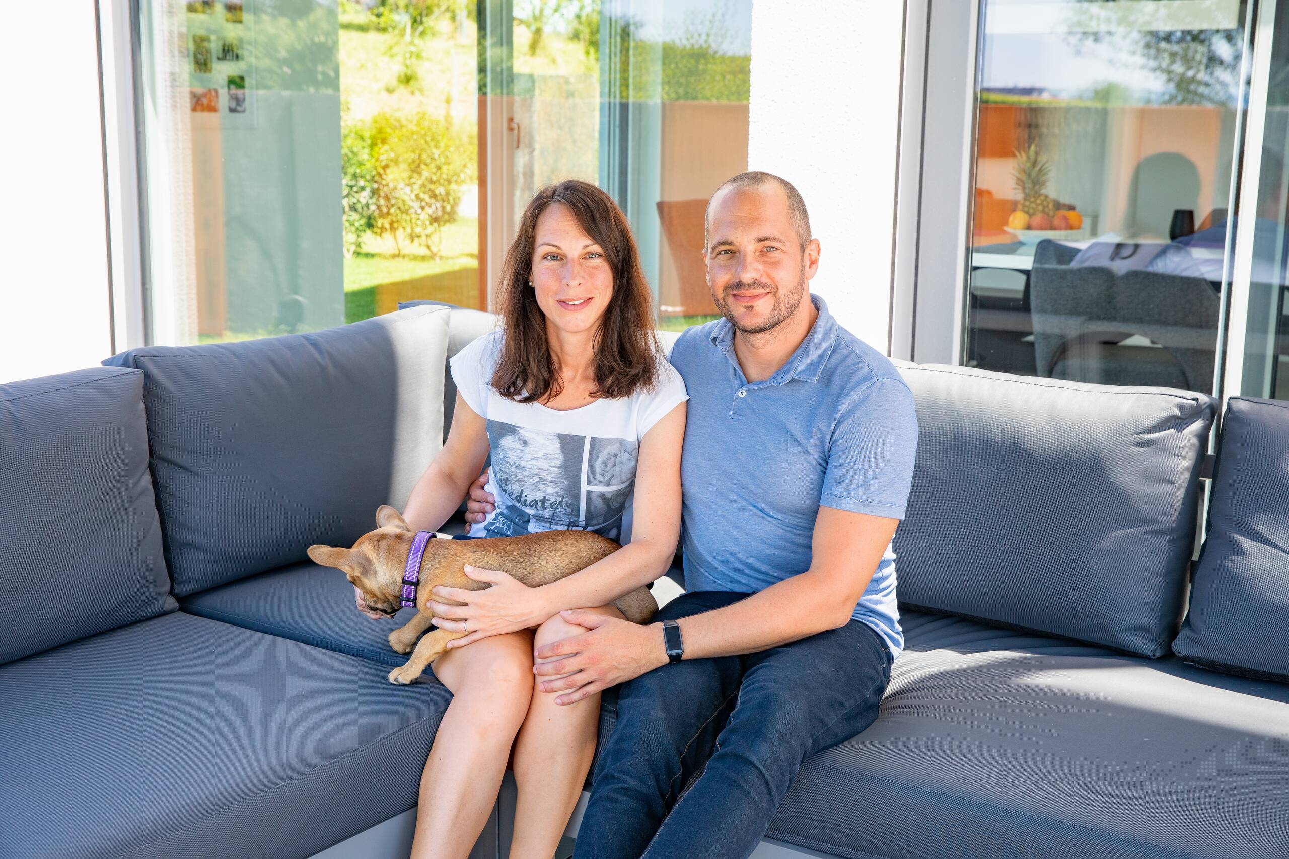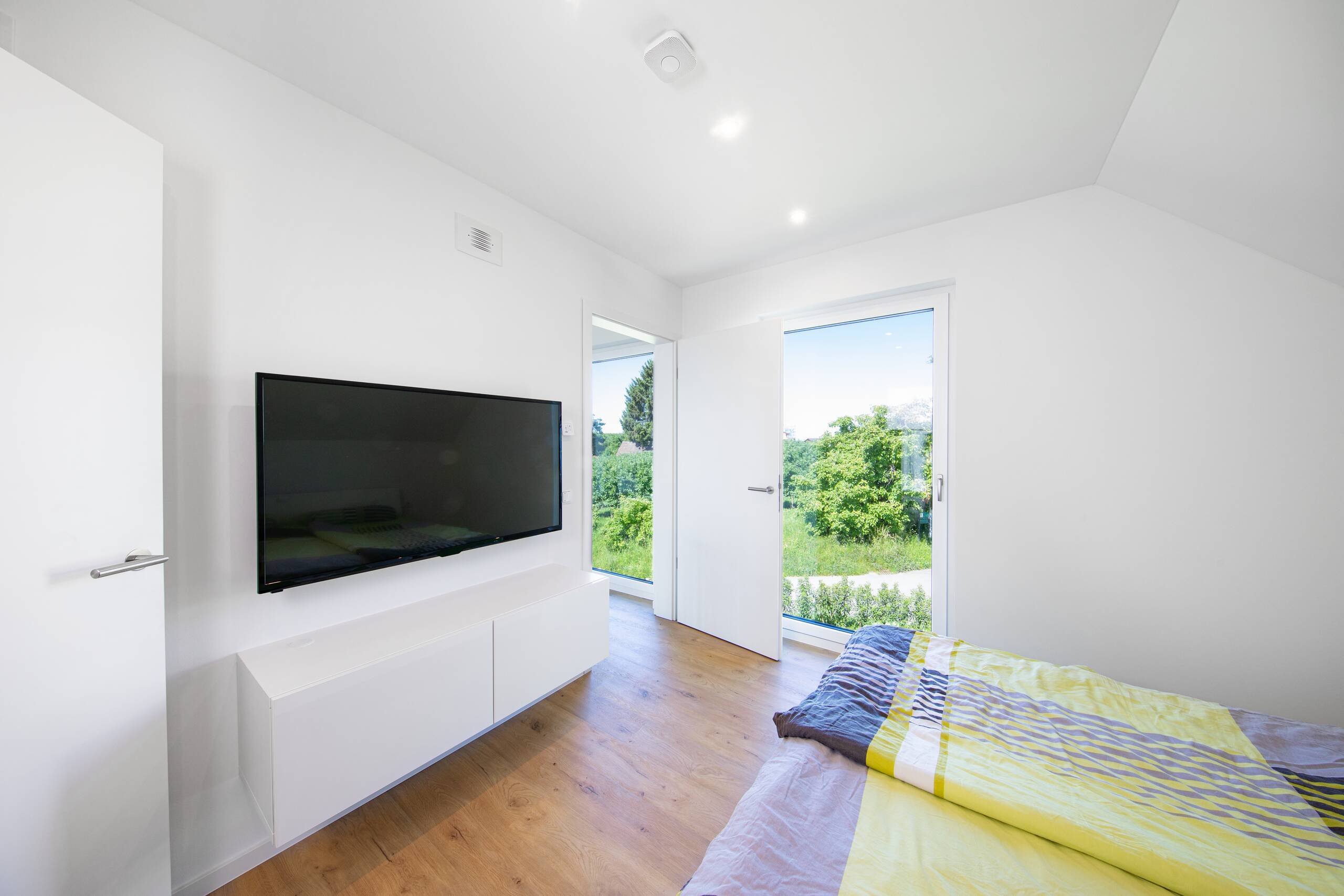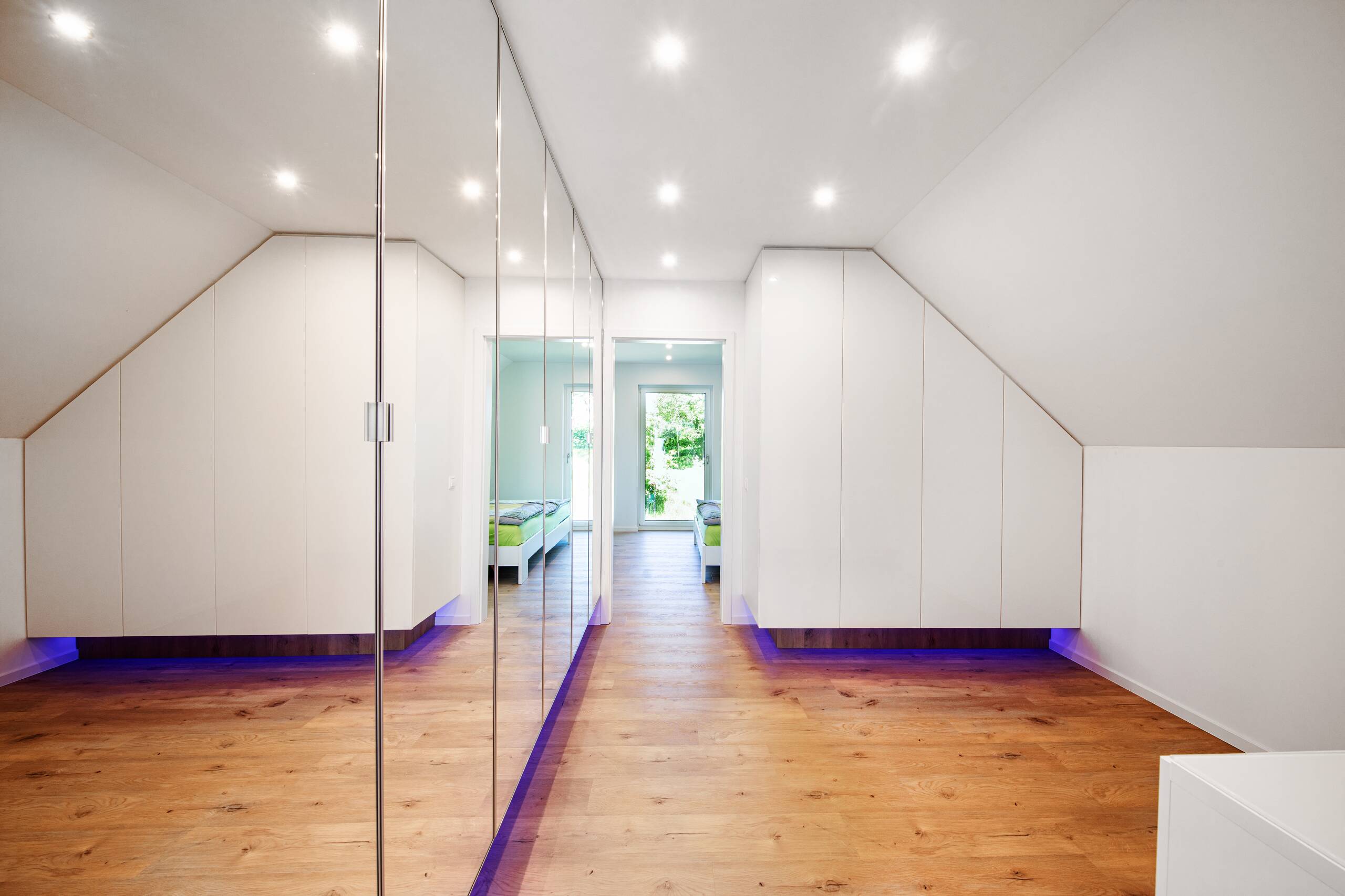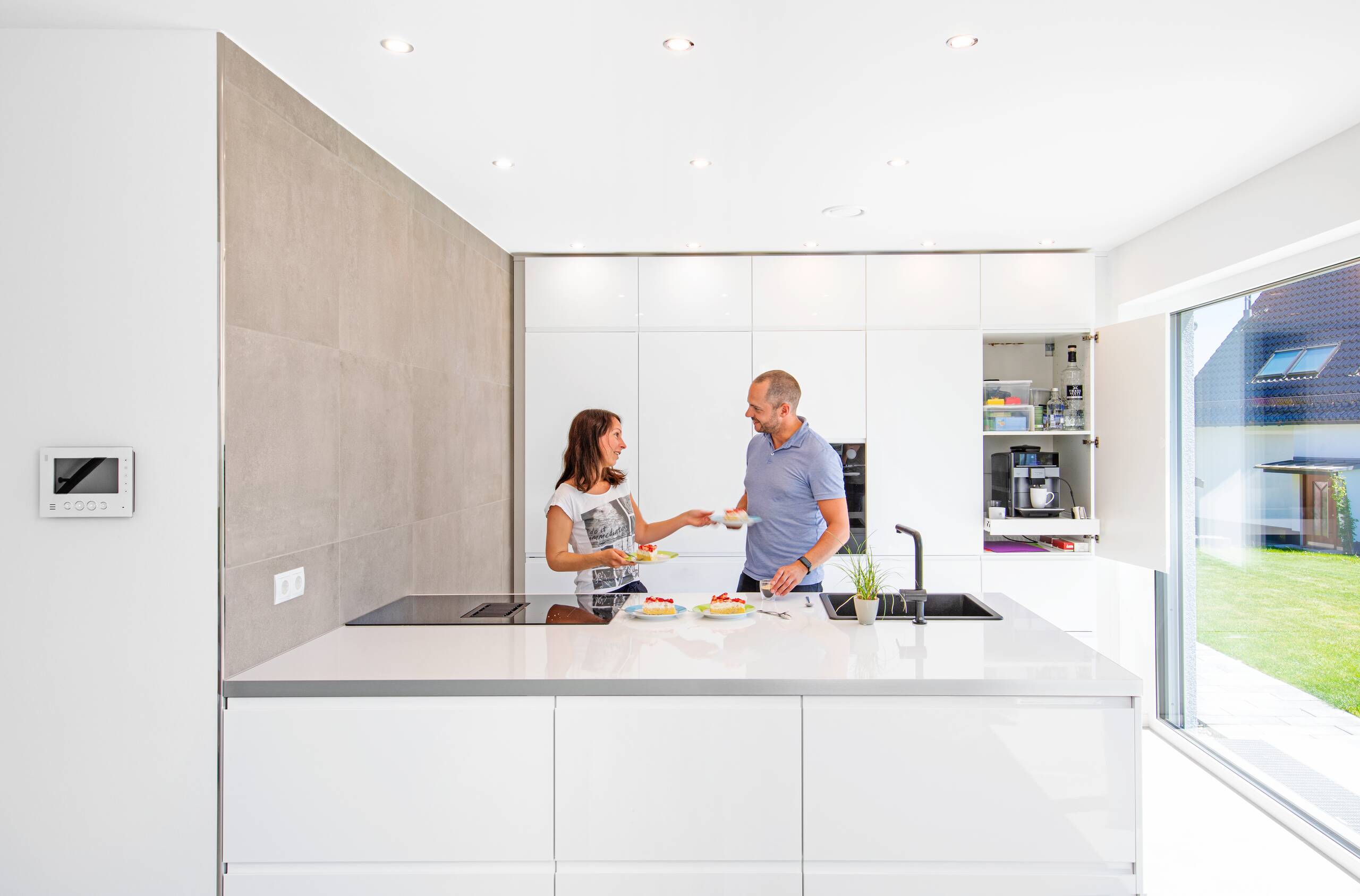 Beinahe quadratisch ist dieses Eigenheim, das auf der Baureihe Balance basiert. Das anderthalb-geschossige Fertighaus verfügt über ein 42 Grad geneigtes Satteldach ohne Dachüberstand. Dank dem hohen Kniestock von 140 Zentimetern und einem dritten Giebel haben die Bewohner auch im Dachgeschoss viel Platz. Zur Straßenseite hin zeigt sich der Neubau introvertiert. Eine glatte, fensterlose Hauswand dominiert hier die Ansicht. Dafür geht es auf der Gartenseite mit den raumhohen Panoramafenstern auf beiden Ebenen umso offener zu. Die Garage mit Verbindungstür zum Haus fügt sich harmonisch in das Gesamtbild ein.