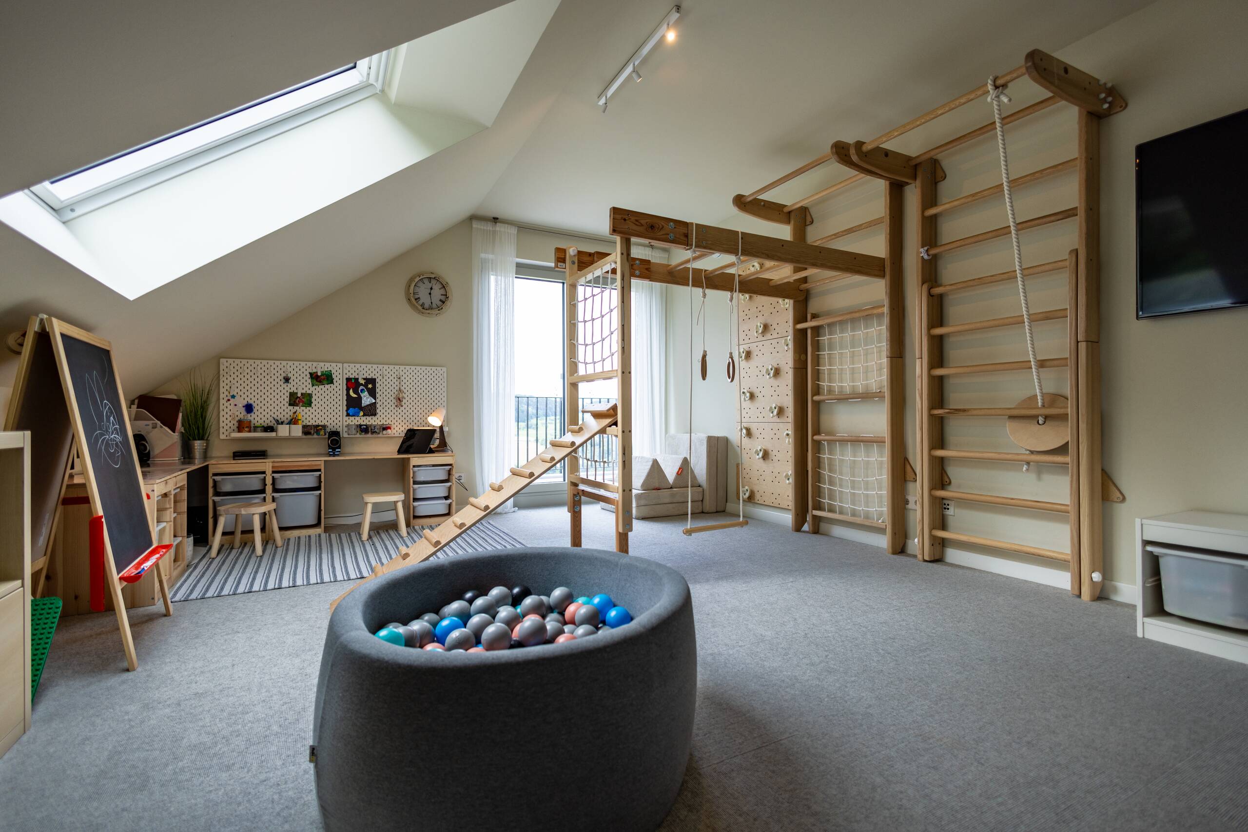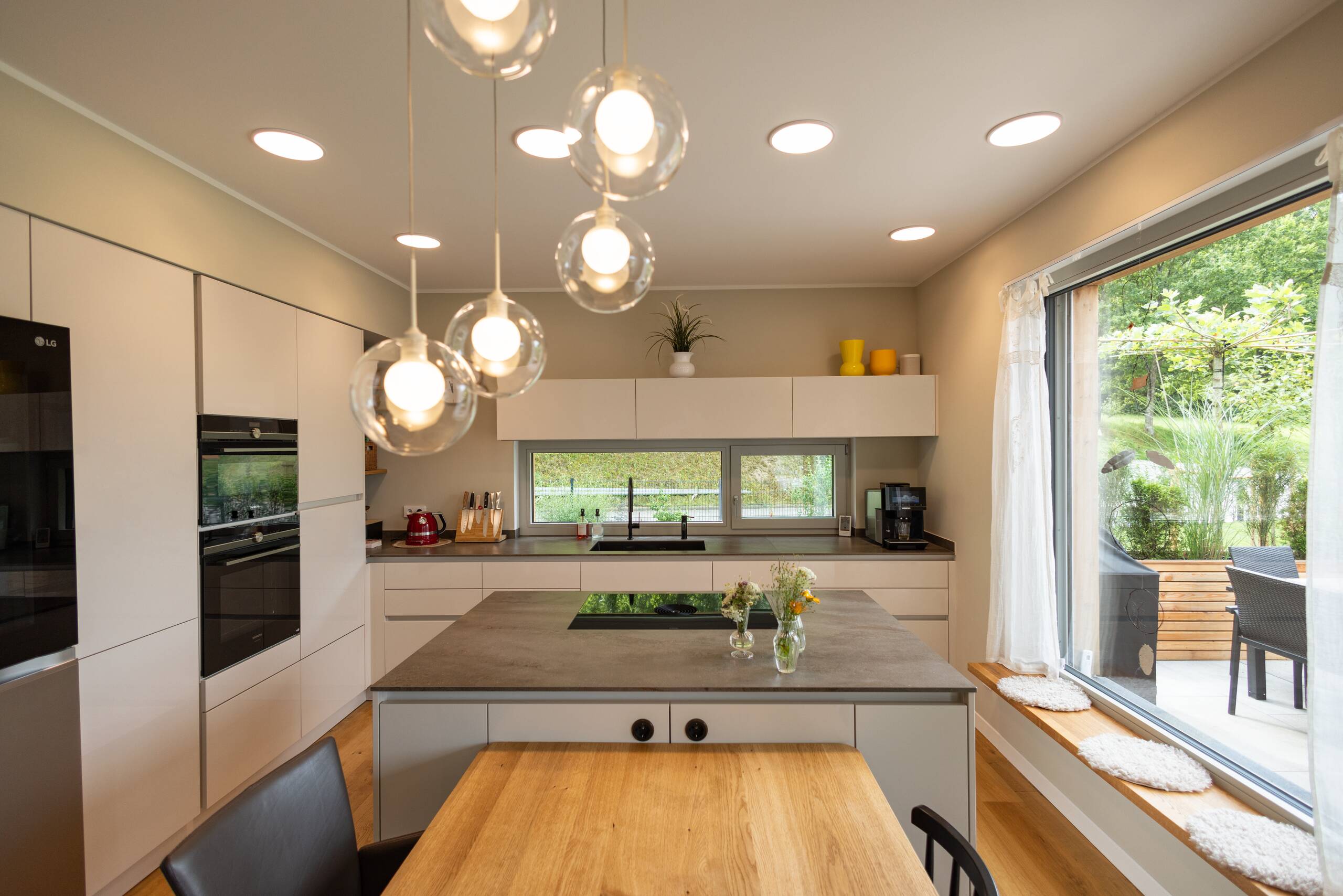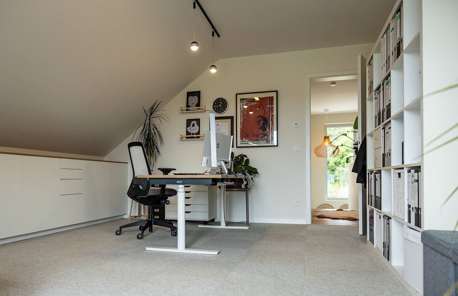 Modern, aber mit einer großen Portion Gemütlichkeit – so sollte das neue Domizil der vierköpfigen Baufamilie aussehen. Die Basis bildet ein geradliniger, weiß verputzter Baukörper mit schlichtem Satteldach ohne Dachüberstände. Blickfang sind die beiden Erker, die sich in eine warme Holzverschalung hüllen. Sie sorgen nicht nur für zusätzliche Platzgewinne im Erdgeschoss, sondern eröffnen dank großzügiger Verglasungen auch beeindruckende Panoramablicke über die Landschaft.