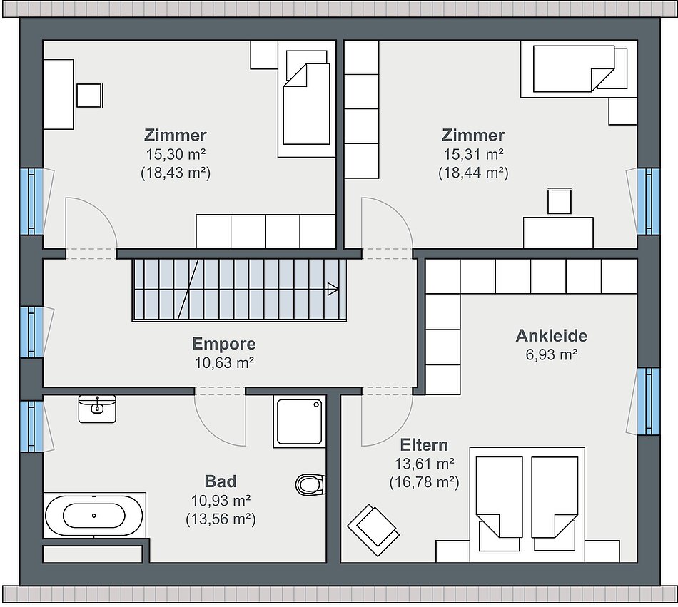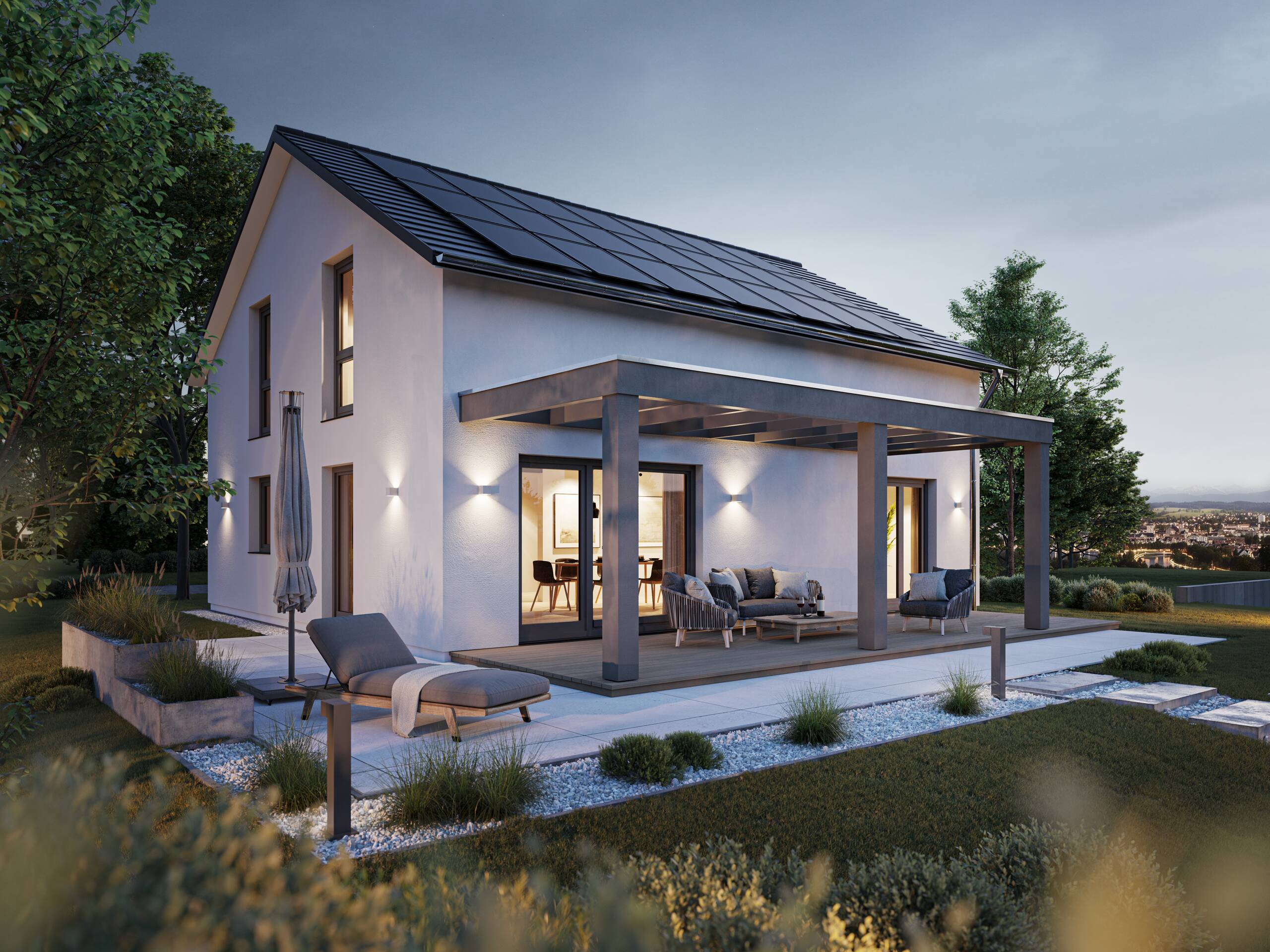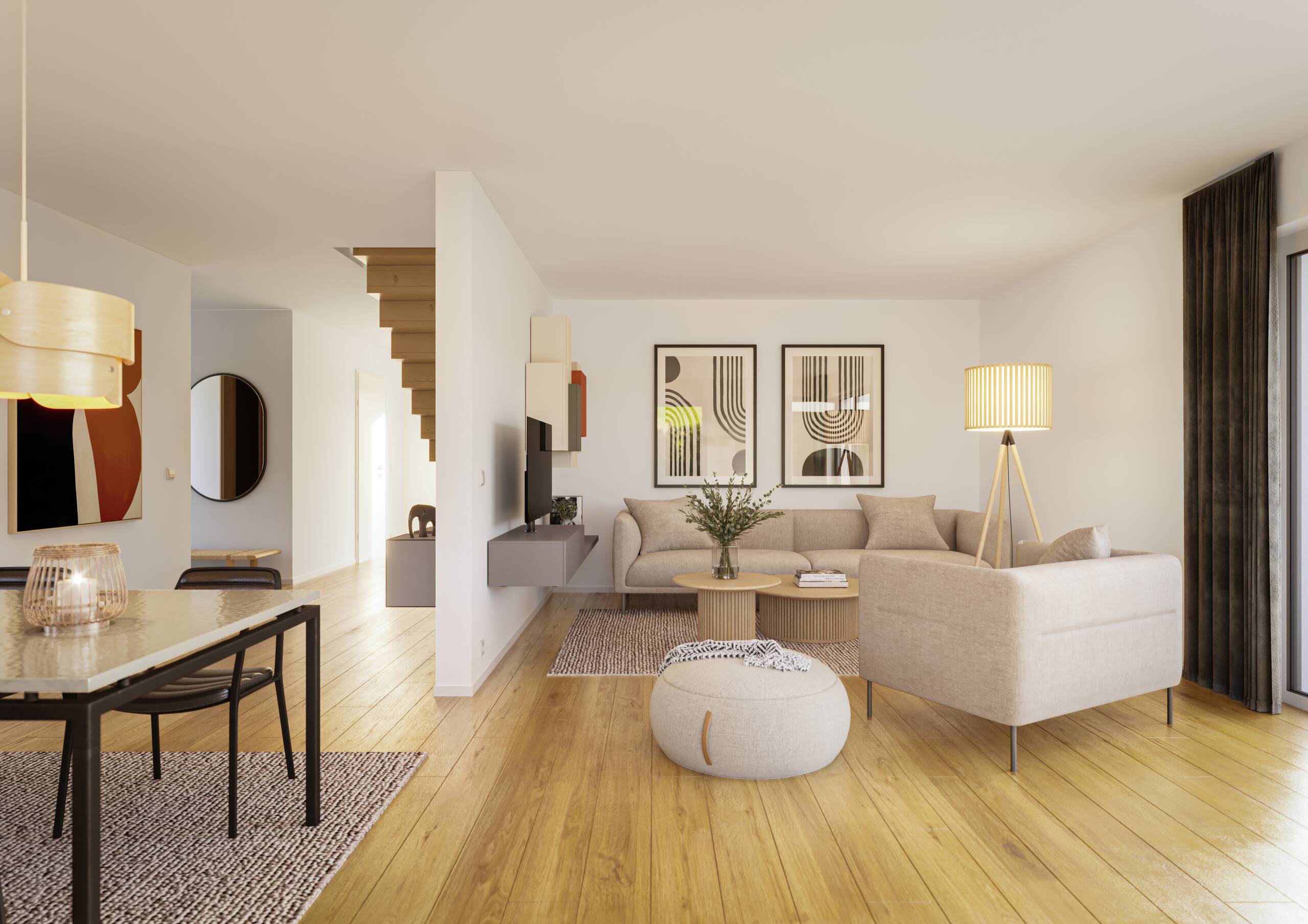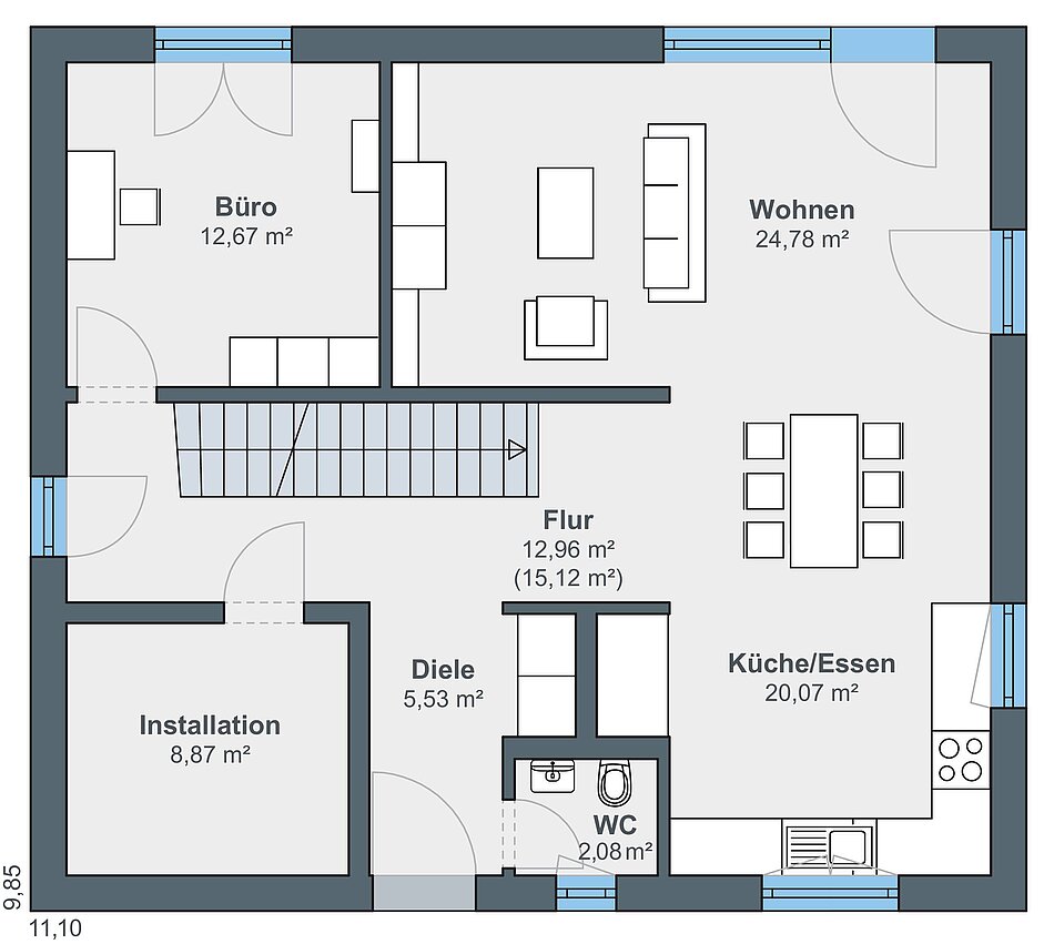 Das Erdgeschoss bietet mit rund 87 m² Wohnfläche großzügigen Raum für den Familienalltag. Direkt neben dem Hauseingang befindet sich ein praktisches Gäste-WC, während in der Diele eine geschickt integrierte Garderobennische für Ordnung sorgt. Von hier aus gelangt man in den offenen Koch- und Essbereich, der fließend in den Wohnbereich übergeht. Große Türen öffnen den Wohnraum zur Terrasse, die optional mit einer Pergola ausgestattet werden kann. Ergänzt wird das Erdgeschoss durch ein flexibel nutzbares Büro oder Gästezimmer sowie einen Hauswirtschaftsraum, in dem die Haustechnik untergebracht ist.