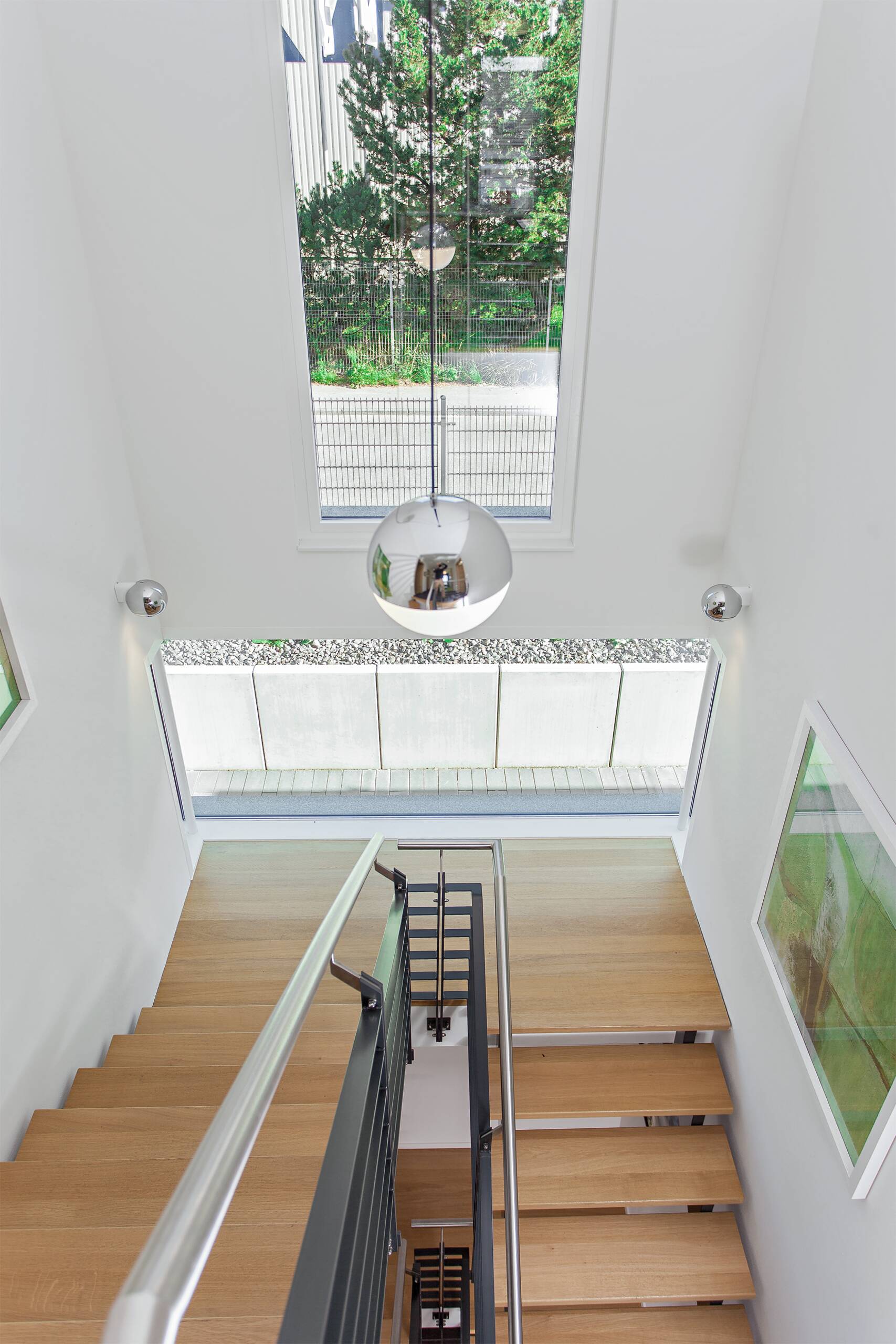 Das Musterhaus in Wuppertal überzeugt mit einer stilvollen Außengestaltung. Die weiße Edelputz-Fassade des zweigeschossigen Gebäudes bildet einen modernen Kontrast zum anthrazitfarbenen Walmdach. Das Haus ist auch mit Sattel- oder Flachdach umsetzbar.