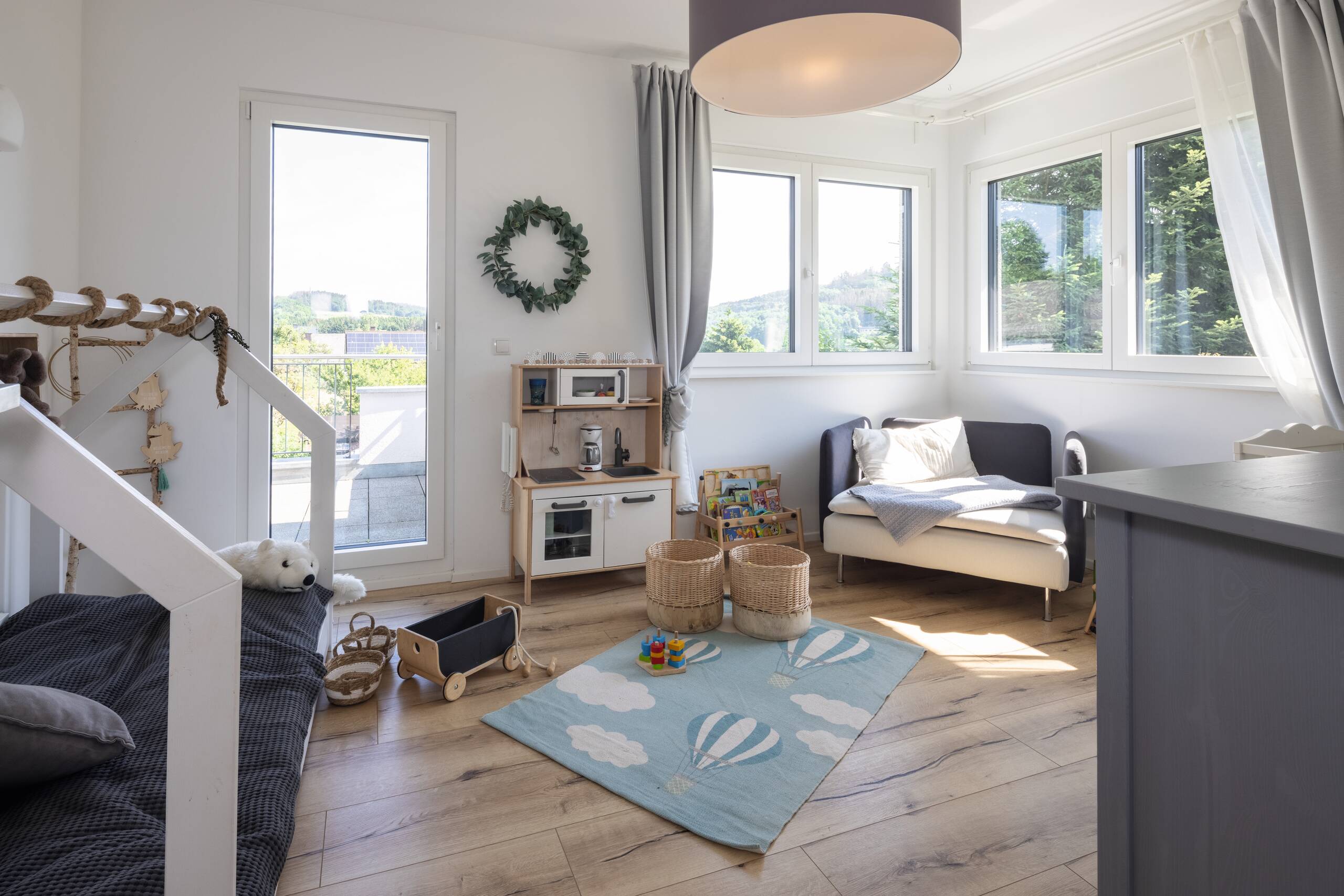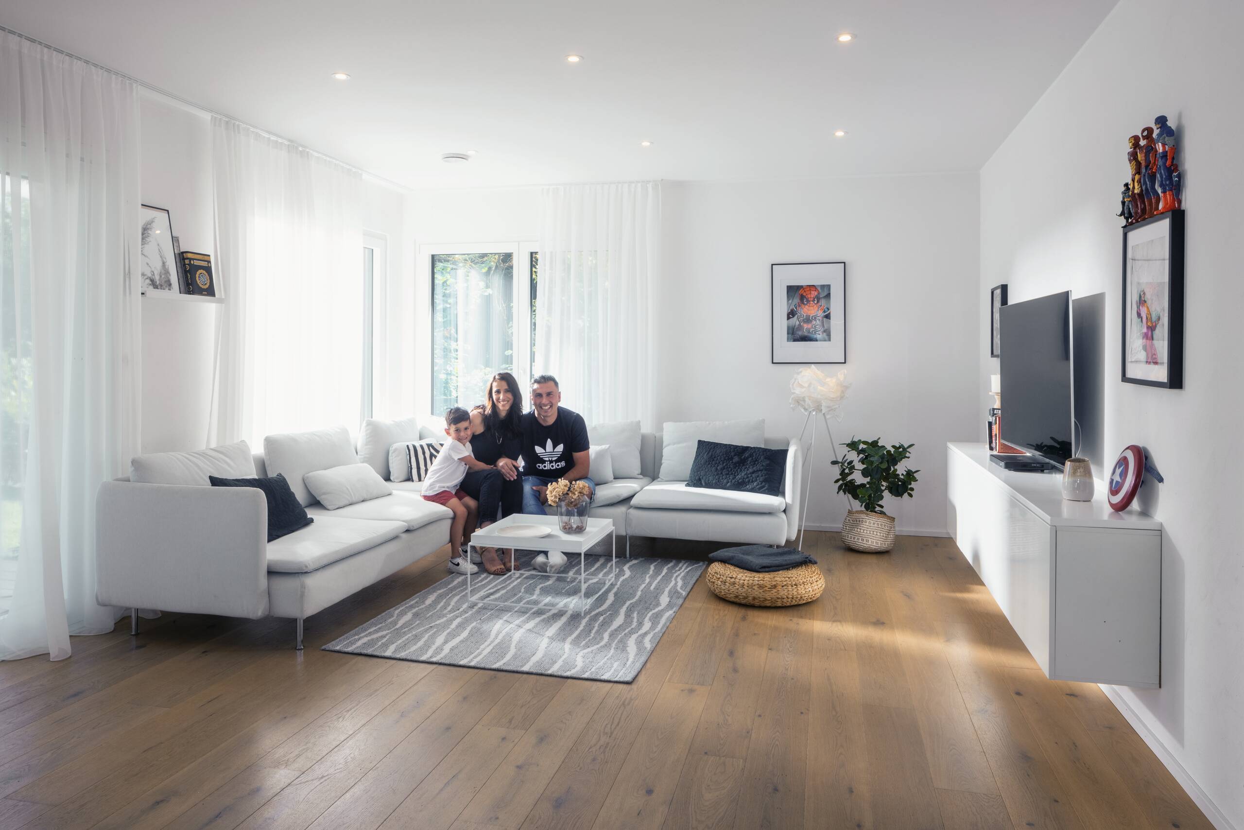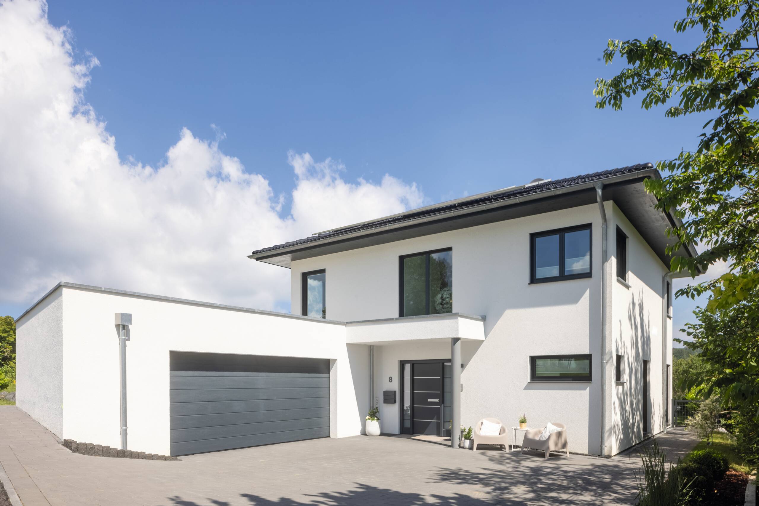 Die Stadtvilla mit rund 150 Quadratmeter Wohnfläche und einem Zeltdach basiert auf der Baureihe CityLife. An das zweigeschossige Einfamilienhaus grenzt eine Garage mit direktem Zugang zum Haus. Hier befindet sich auch ein Teil der innovativen Energietechnik, die bei diesem Kundenhaus als Pilotprojekt umgesetzt wurde: Das picea-System von HPS Home Power Solution. Dabei handelt es sich um ein Kompaktgerät zur ganzjährigen autarken Energieversorgung. Die Speicheranlage wandelt nicht sofort genutzten Strom in Wasserstoff um.