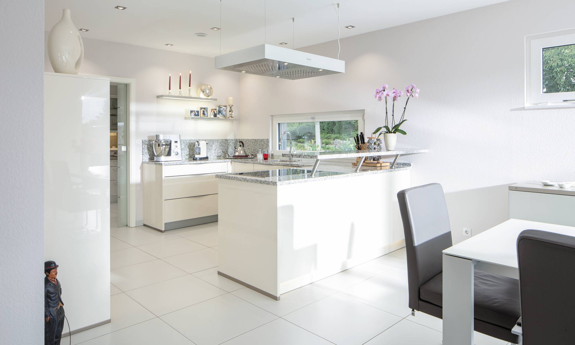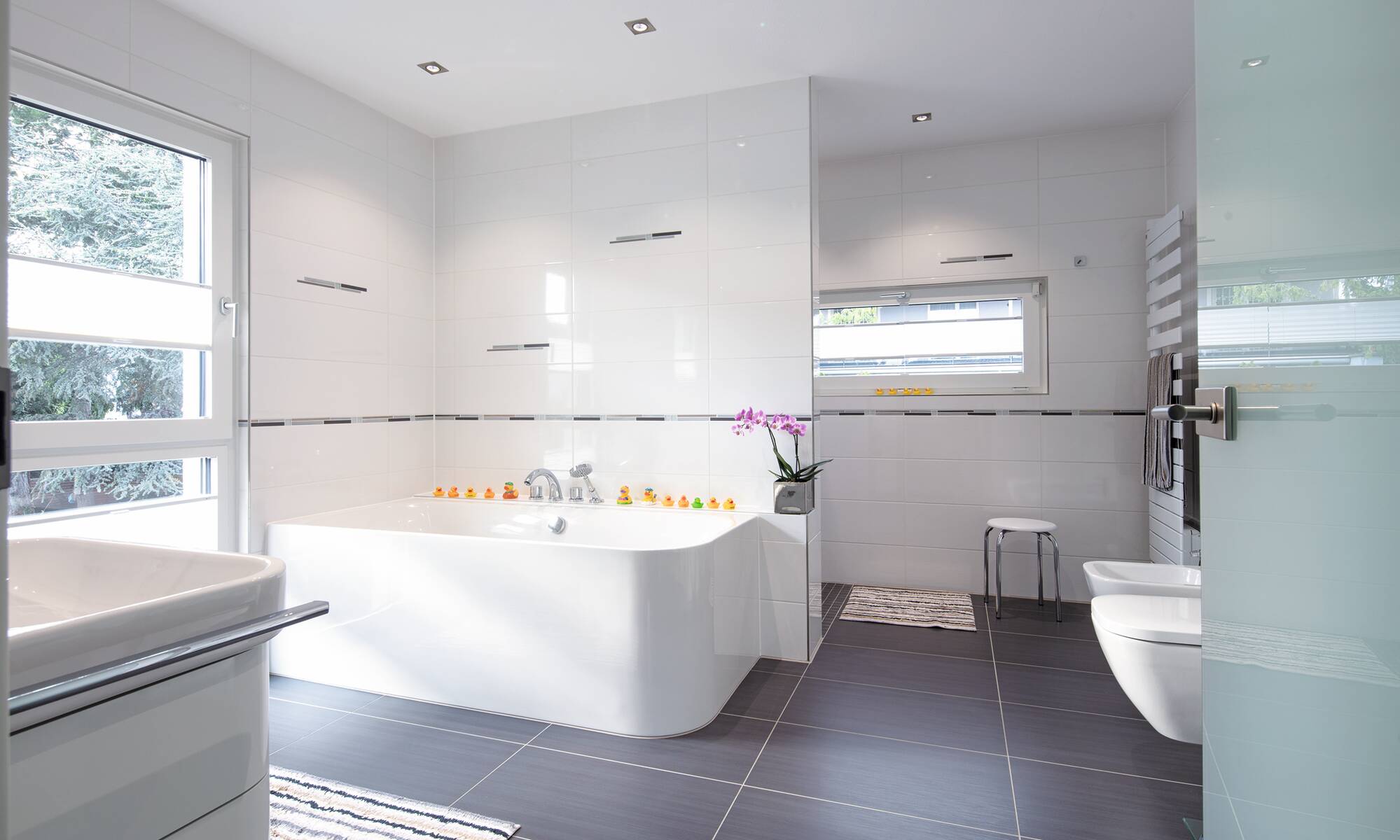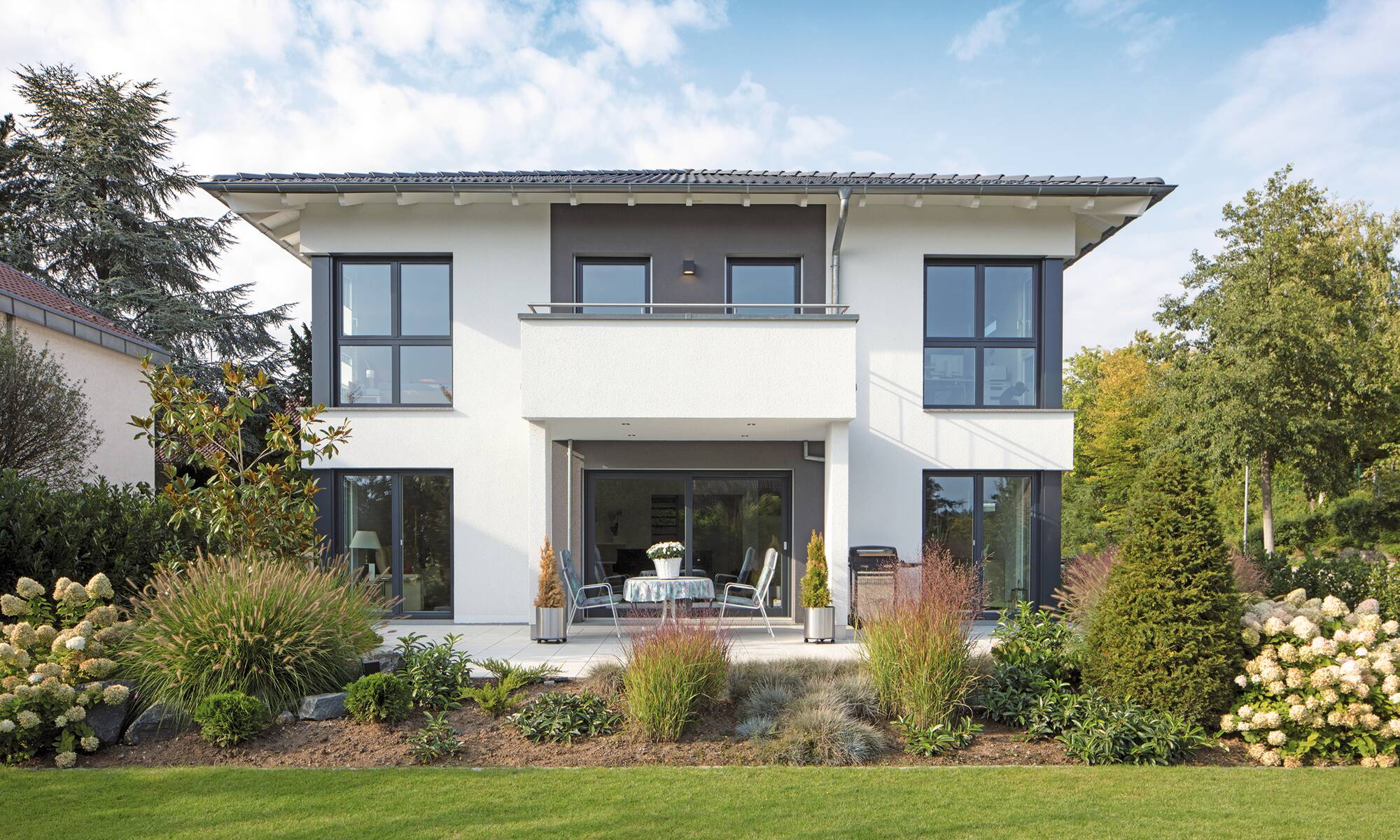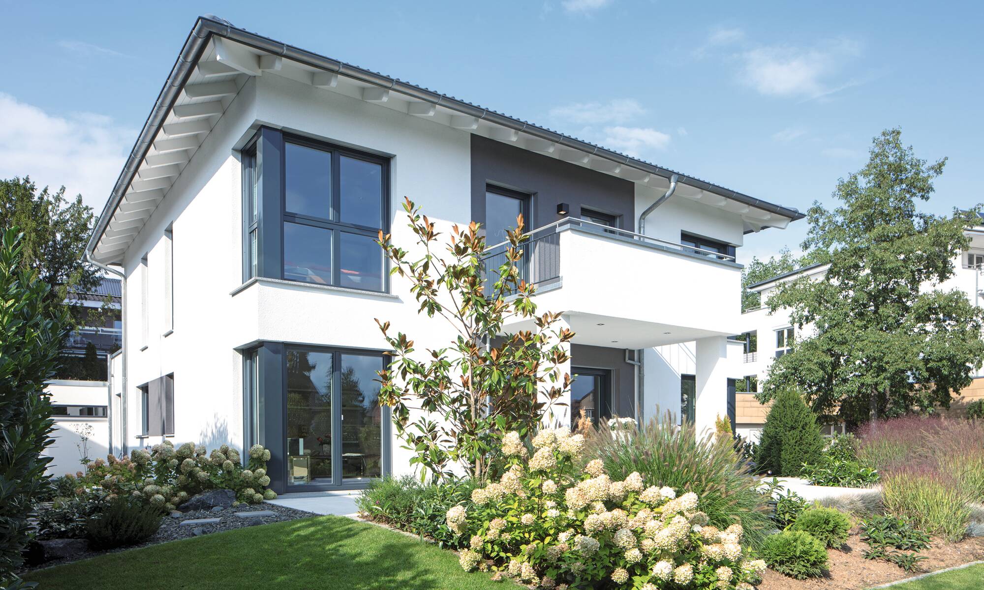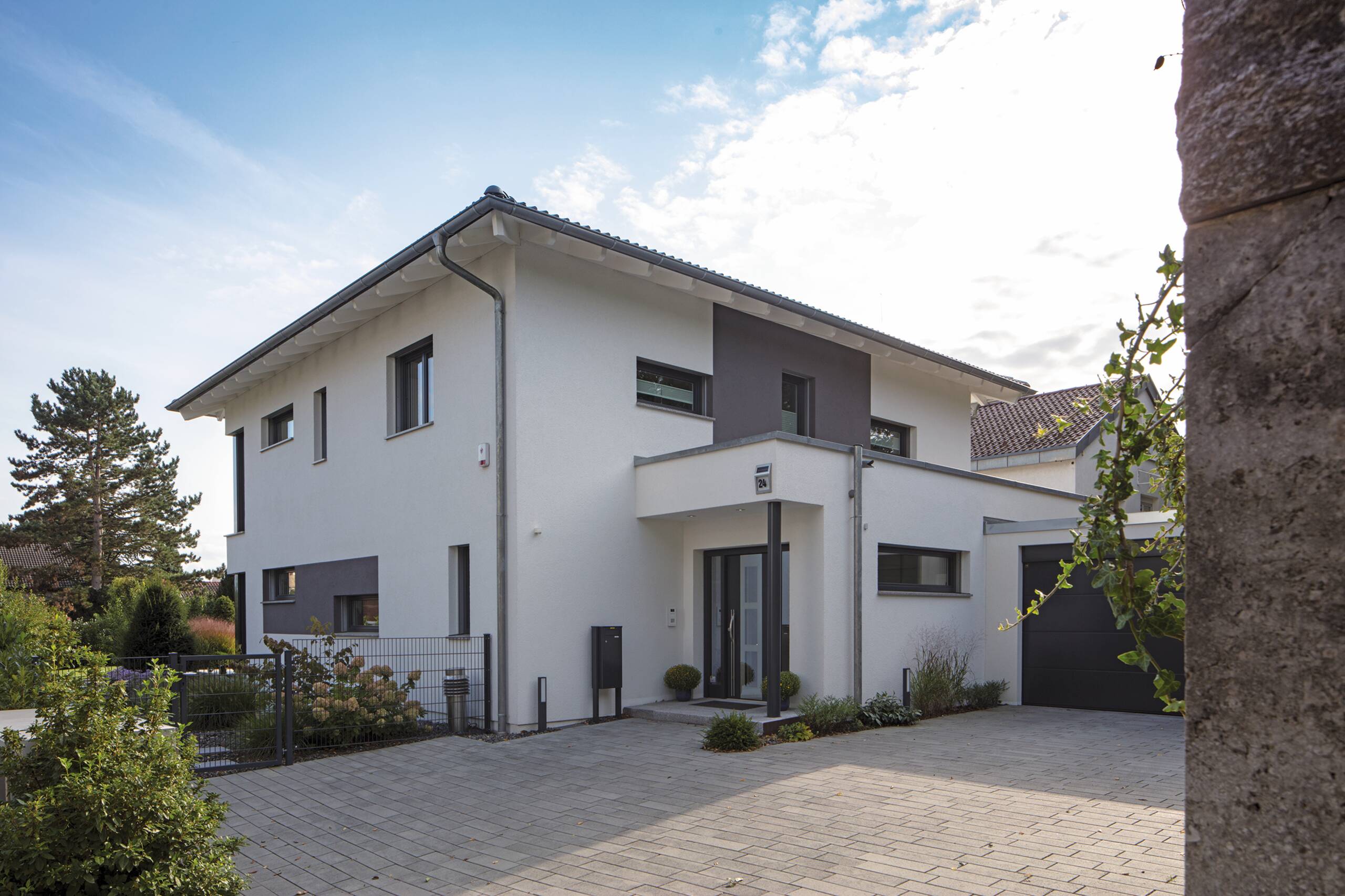 Das Ehepaar Paulsen hat ihr Traumhaus in der Baureihe CityLife entdeckt. „Wir freuen uns jeden Tag aufs Neue, in diesem komfortablen und schönen Haus wohnen zu können“, schwärmen die Hausbesitzer. Das Stadthaus mit seinen zwei Vollgeschossen und dem Walmdach bietet eine Wohnfläche von rund 220 Quadratmetern.Hinzu kommt ein Weberith-Keller. Farbige Akzente und Fensterrahmen in Grau lockern die ansonsten weiße Außenfassade auf. Passend dazu haben sich die Hausbesitzer für graue Dachziegeln entschieden.