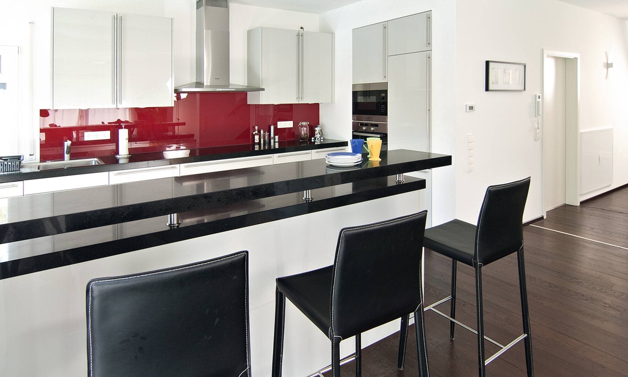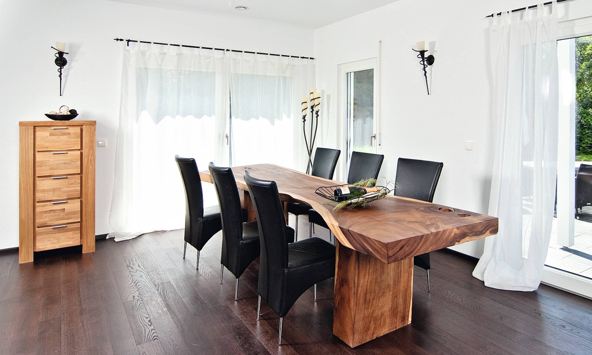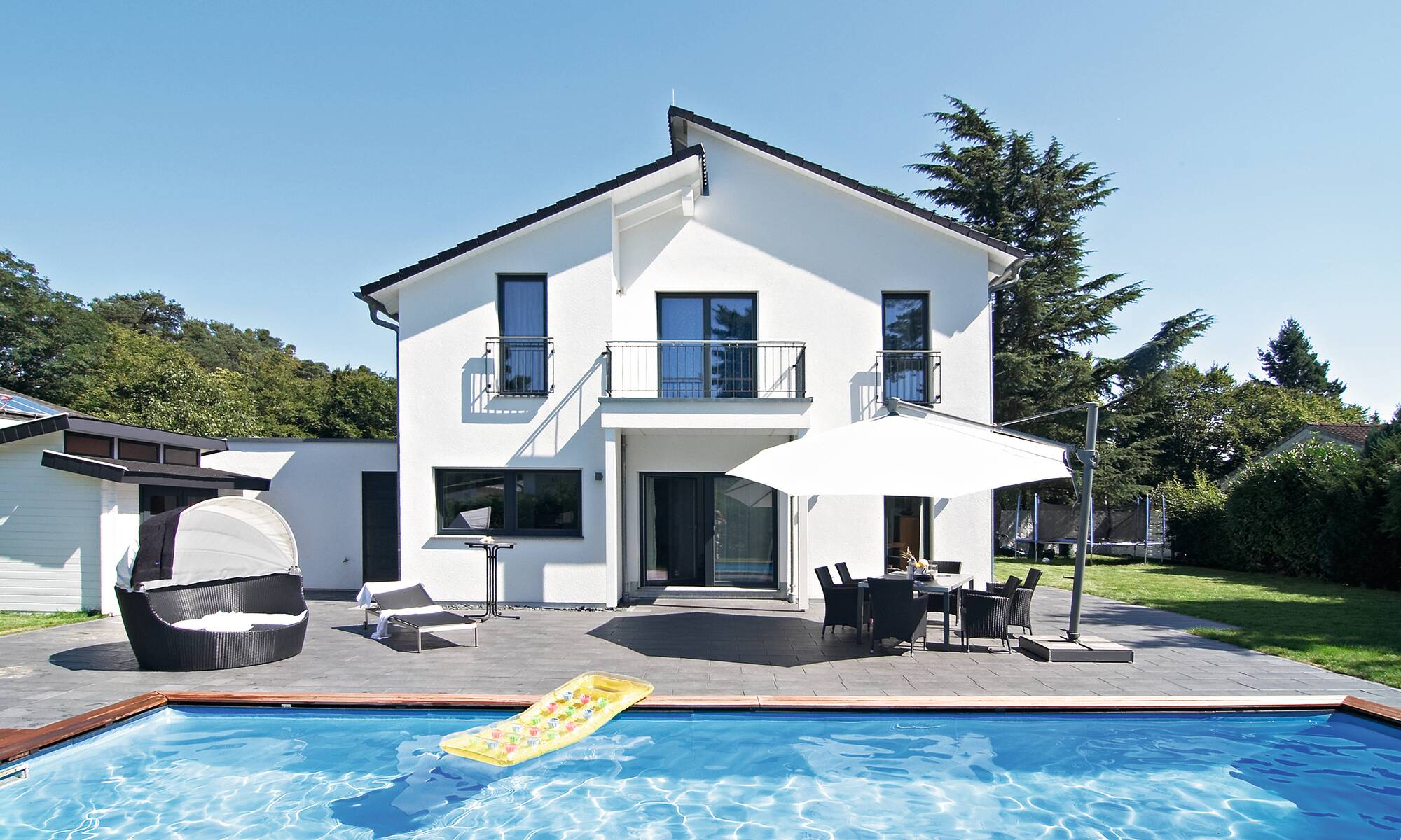 Im eigenen Zuhause möchte man auf nichts verzichten. Das dachten sich auch die Bauherren dieses frei geplanten Weber-Hauses und erfüllten sich und ihren Kindern den Wunsch nach einem maßgeschneiderten Eigenheim. Während das Erdgeschoss der kommunikative Mittelpunkt des Hauses ist, hat jedes Familienmitglied im Dachgeschoss seinen eigenen Bereich. Die warme Jahreszeit kann die Baufamilie auf mehreren Balkonen und einer riesigen Terrasse genießen. Zum Abkühlen und Spaß haben lädt ein großzügig angelegter Pool ein, der für die Kinder ein ganz besonderes Highlight ist. Die Fassade des Hauses wurde im Farbton Weiß verputzt. Graue Elemente schaffen einen gelungen Kontrast und ein versetztes Pultdach verleiht dem Haus das gewisse Etwas.