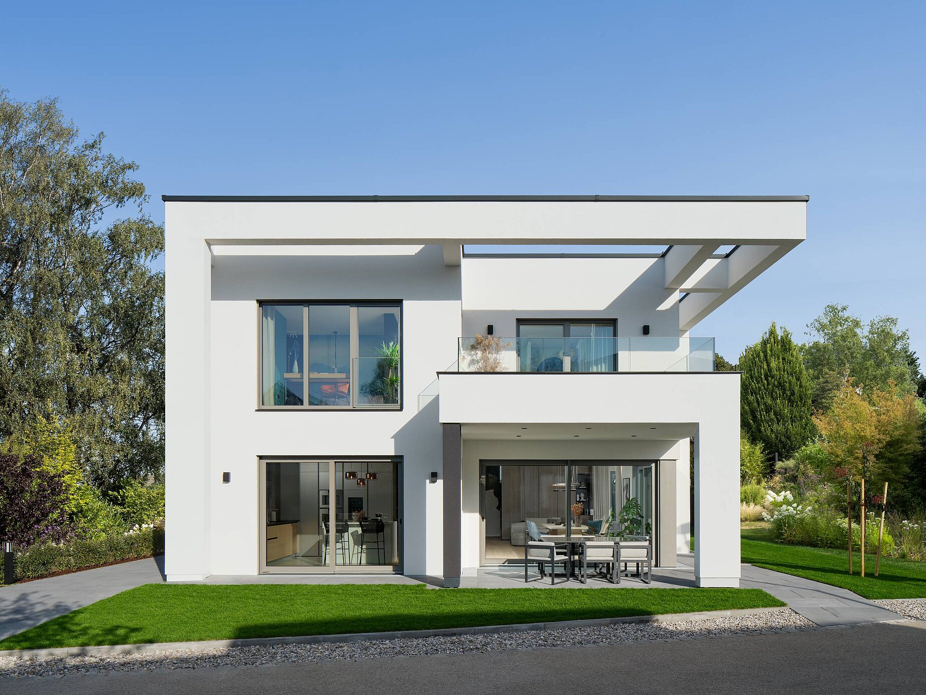 Die moderne Villa wurde von dem Architekten Hamid von Berg-Hadjoudj entworfen und von Villa Projects, einem namhaften Innenarchitekturbüro, weiterentwickelt. Die Basis ist ein klarer, weißer Kubus, der durch auskragende Elemente akzentuiert wird. Für viel Transparenz sorgen großzügige Glasflächen. Die offene Struktur lässt die Grenzen zwischen Innen und Außen verschwimmen. Balkone und Terrassen laden zum Entspannen ein. Eine Doppelgarage grenzt direkt an das Haus an. Die Villa bietet mit über 200 Quadratmetern Wohnfläche großzügigen Raum für Familien oder Paare, die eine offene Architektur wertschätzen. Mit dem frei geplanten Architektenhaus stellt WeberHaus erneut unter Beweis, dass sich modernes Design, Premium-Qualität und eine nachhaltige Holzbauweise keineswegs ausschließen.
