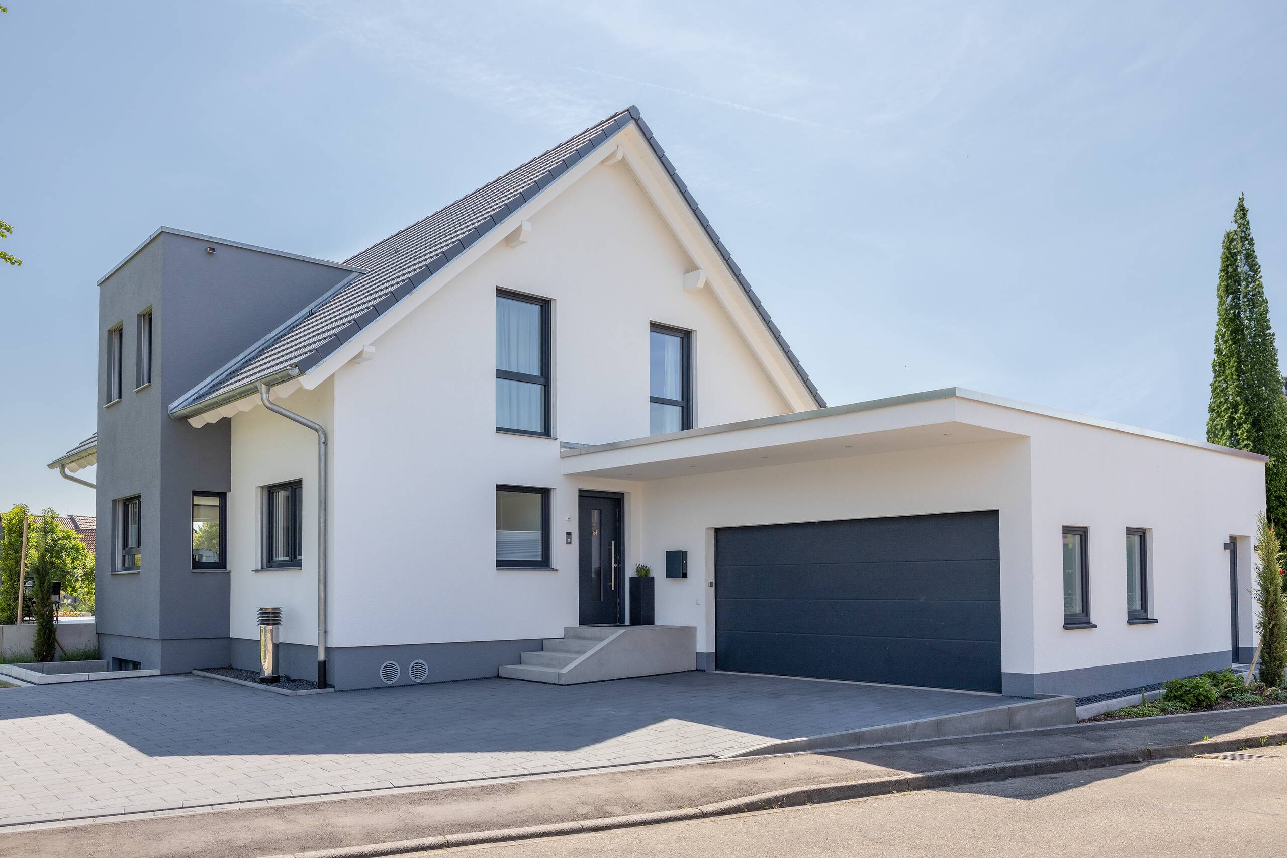Aufgrund des Bebauungsplans aus den 1970er Jahren entstand ein anderthalbgeschossiges Einfamilienhaus mit Satteldach und niedrigem Kniestock. Charakteristisch ist der dritte Giebel mit Flachdach. Die Farbgestaltung ist zurückhaltend. Der dritte Giebel wurde passend zum Dach und den Fensterrahmen in Grau gestrichen, während das restliche Haus in Weiß erstrahlt. Das Dach mit sichtbaren Pfetten lockern das moderne Erscheinungsbild auf. Eine große Garage sowie ein Keller bieten ausreichend Staufläche.
